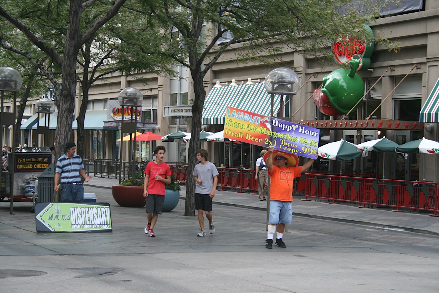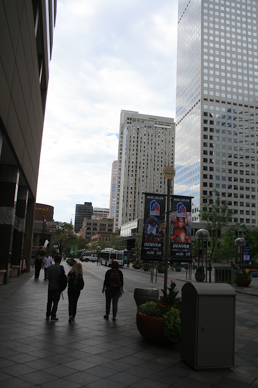 Vervolgens naar downtown Denver. Over de autovrije, ja ja, 16th street gelopen. Mooie winkels, Barnes en Nobels en leuke terrasjes. Tegen half zes zijn we terug op het Centrale busstation en pakken we feilloos de bus terug naar Golden. Daar eten we in de locale gezellige pizzeria lekker. zoveel je kan voor 10 dollar pp.