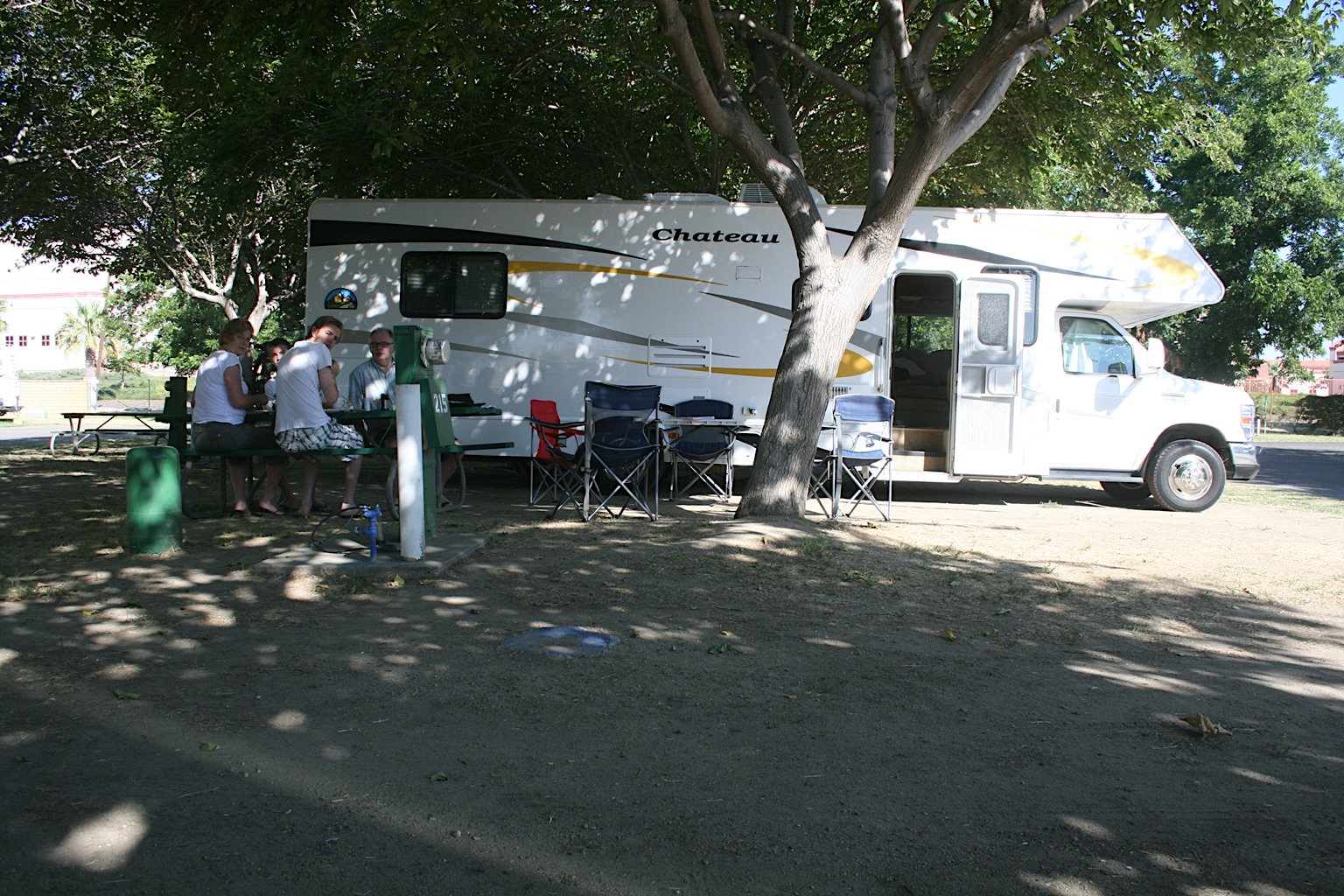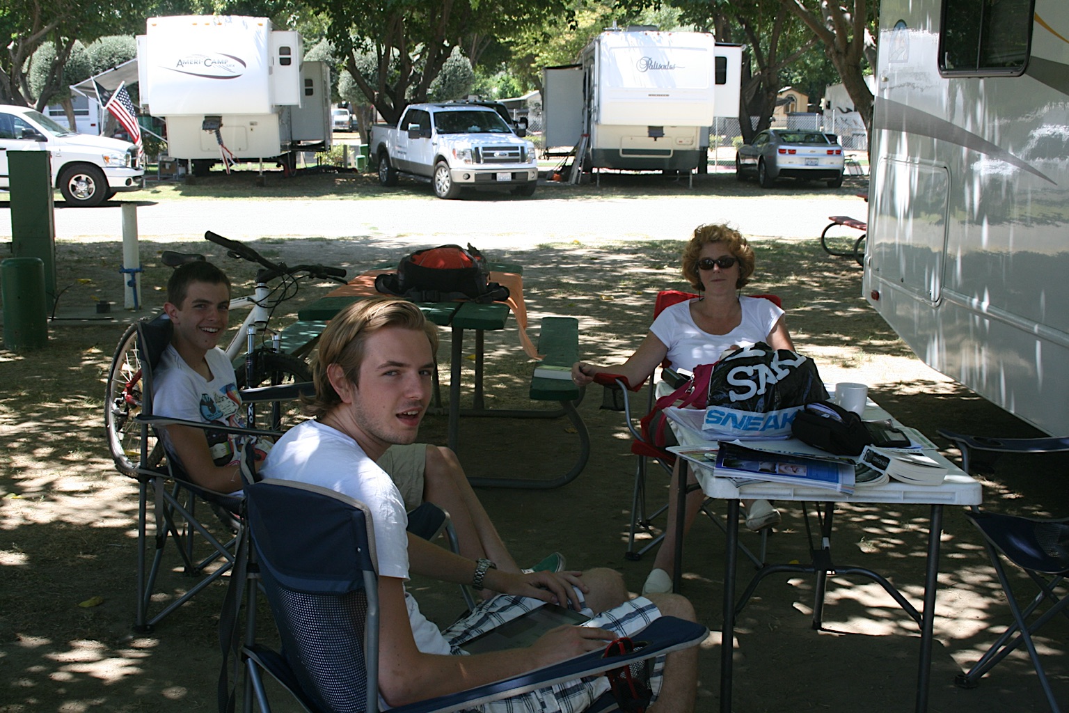 Ondanks het feit dat we iets meer last hebben van de drukke weg, sta ik toch liever in de schaduw. We staan bovendien vlak bij het sanitairgebouw met prima douches. Daar maken we vervolgens goed gebruik van. Vandaag is verder een chilldag. We lezen en fietsen wat en gaan bijtijds slapen.