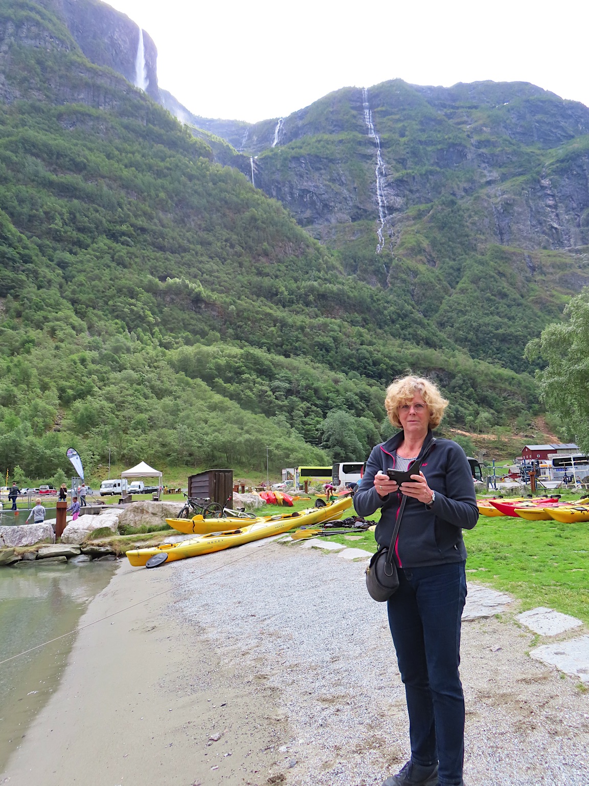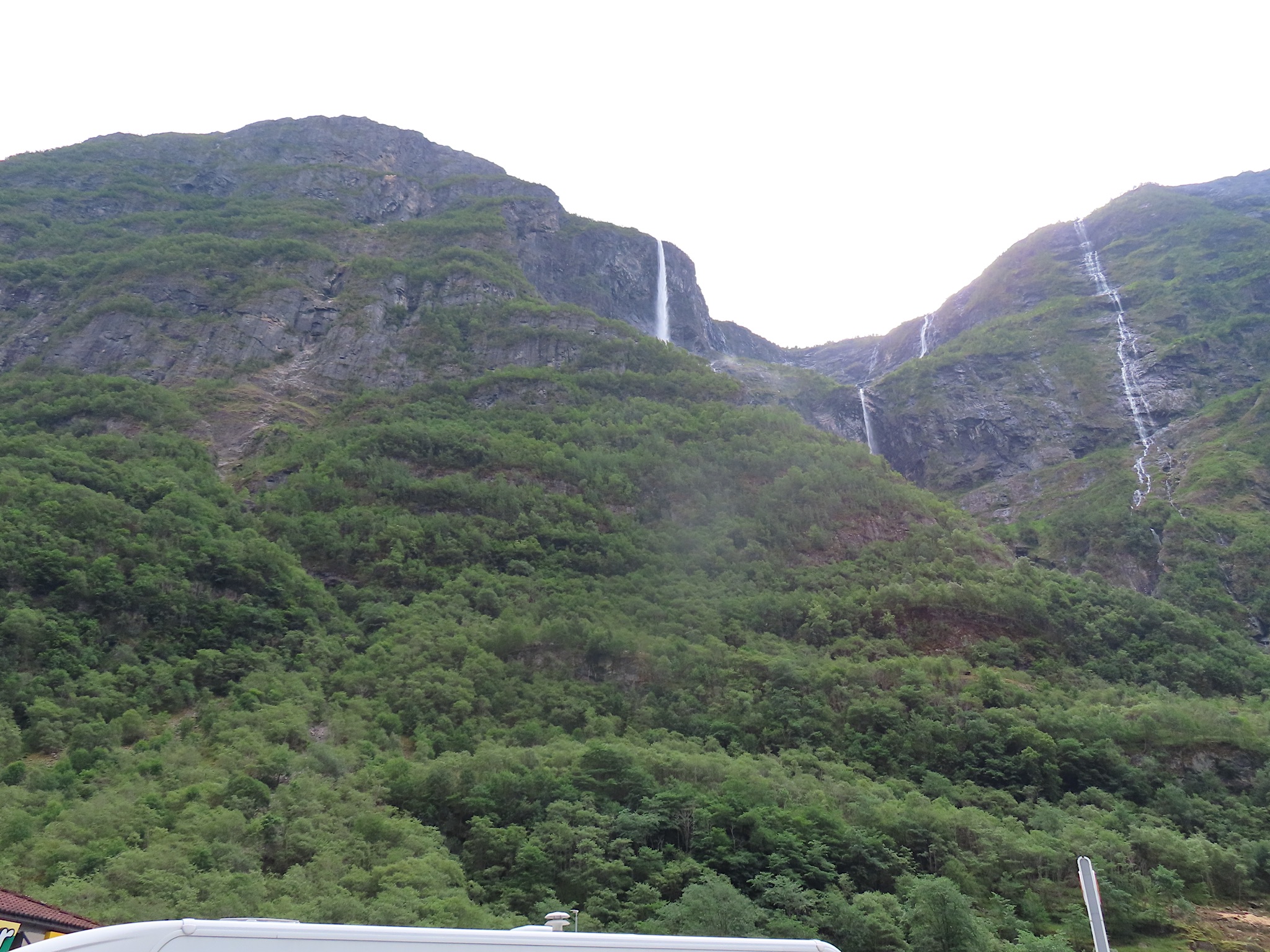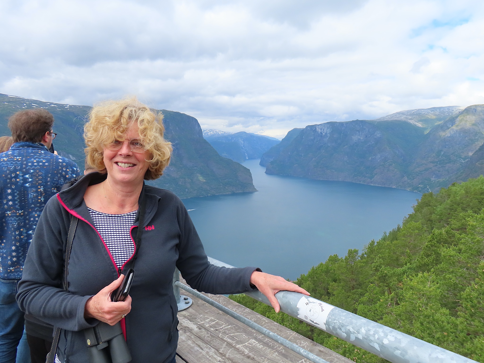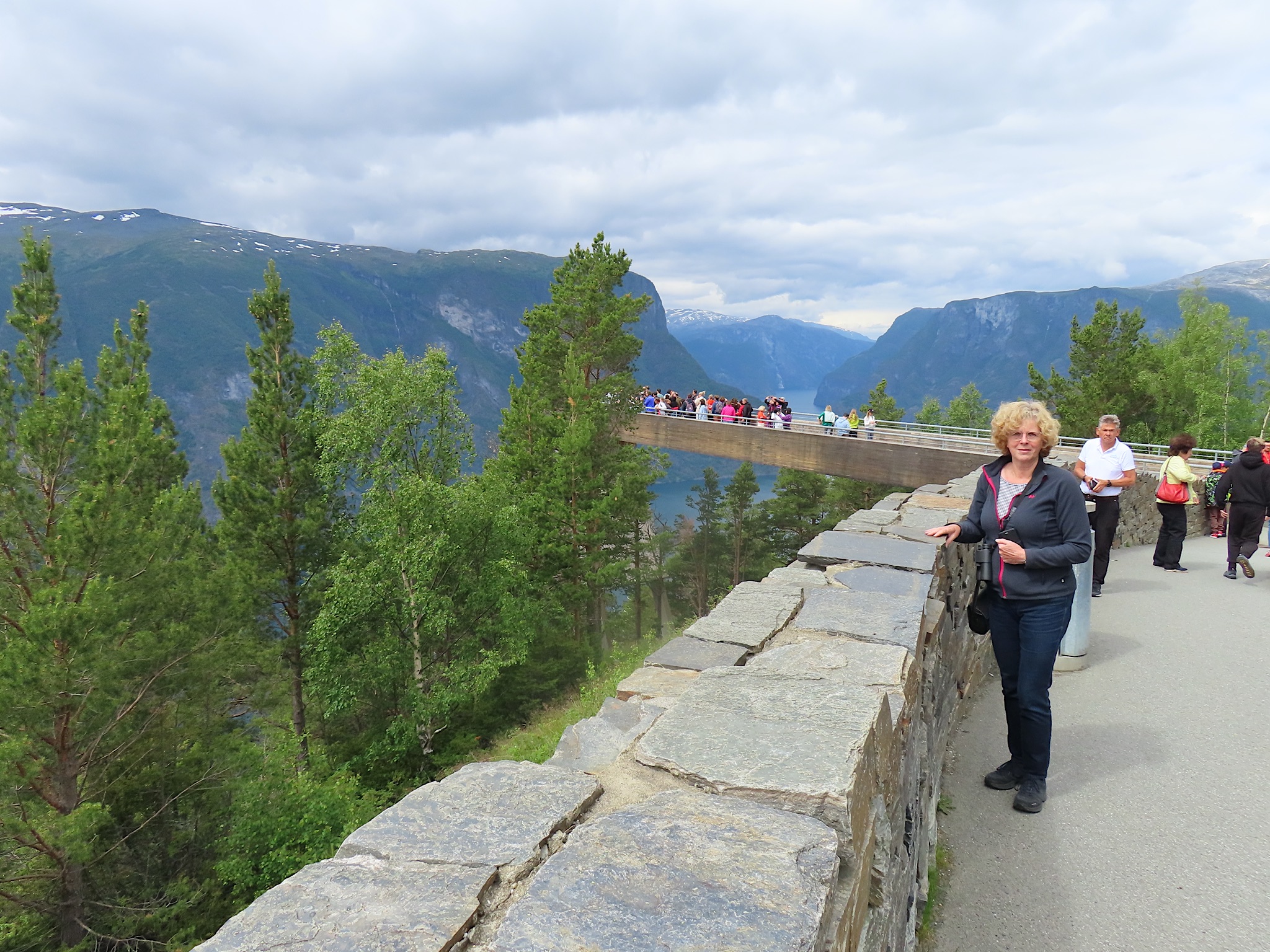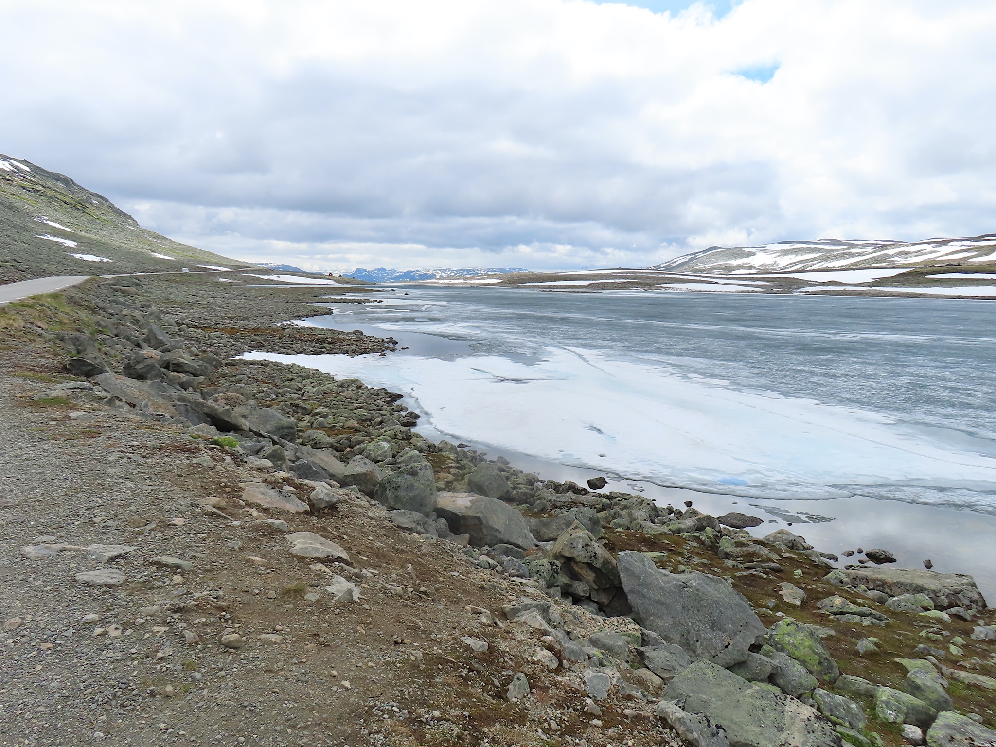 We vertrekken al vroeg want het wordt vandaag een lange rit vol kronkelige wegen. De verhuurster RIta is met geen stok (of bel of klop) wakker te krijgen. Uiteindelijk belt Tineke haar en neemt ze op. Ze wenst ons goede reis en verontschuldigd zich voor de weinige aandacht die ze voor ons had. Het is droog en het zonnetje piept er af en toe door. Af en toe ook omdat we veel, heel veel, te veel door tunnels rijden. Mooie maar ook hele slechte. Ze hebben het hier allemaal uitgevonden net als de kaasschaaf overigens. Onze eerste stop is in Voss, een leuke actieve plaats aan een meer. Parapenters oefenen in het park waar net een muziekfestival is geweest. Meeuwen voeren schijnaanvallen uit Sambo. We maken gebruik van het toilet van het Esso benzinestation. De code is 1968 voor degenen die daar nog eens langs gaan. Nog meer tunnels en langer en langer. Als er een 24,5 km tunnel wordt aangekondigd besluiten we voor de verandering eens de pas over te gaan. Dat was verrassend mooi. Eerste stuk steil omhoog met veel haarspelden. We hebben het geluk achter een bus uit Oekraïne te zitten. Iedereen die we tegenkomen maakt ruim baan voor die bus en dus voor ons. Boven wacht ons een prachtig uitzicht over de Aurlandsfjord. Als we door rijden komen we in een kaal maanlandschap waar sneeuw en ijs nog volop aanwezig is. Dat blijft spectaculair.