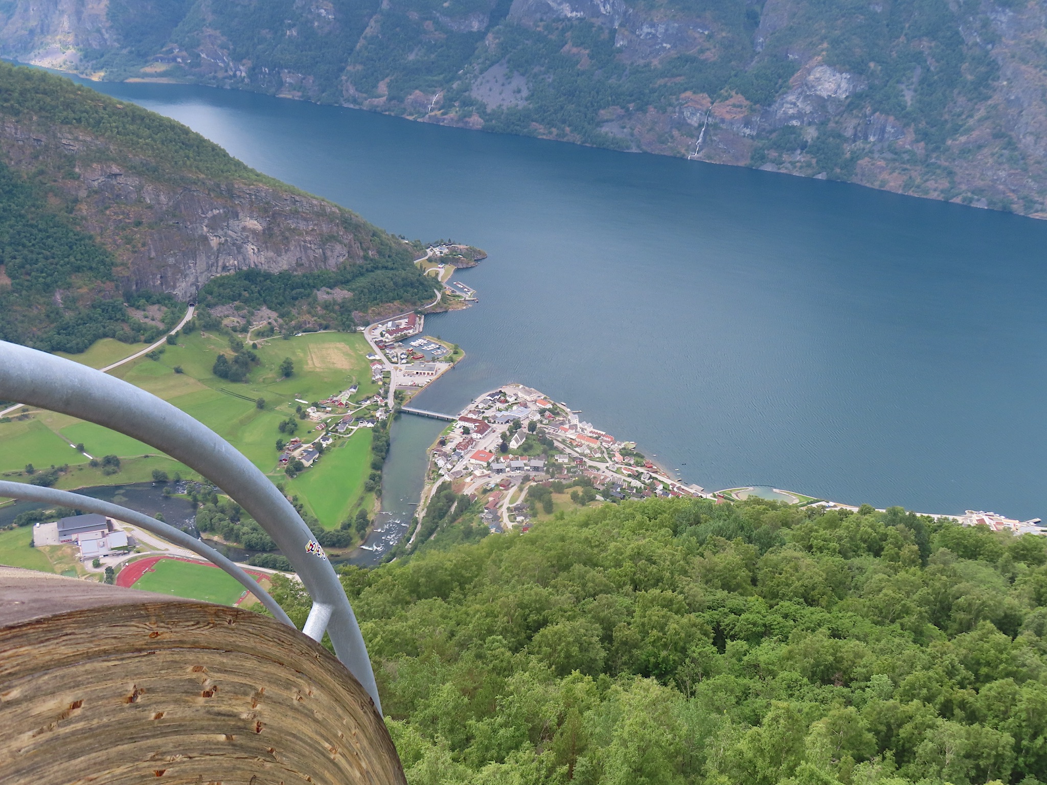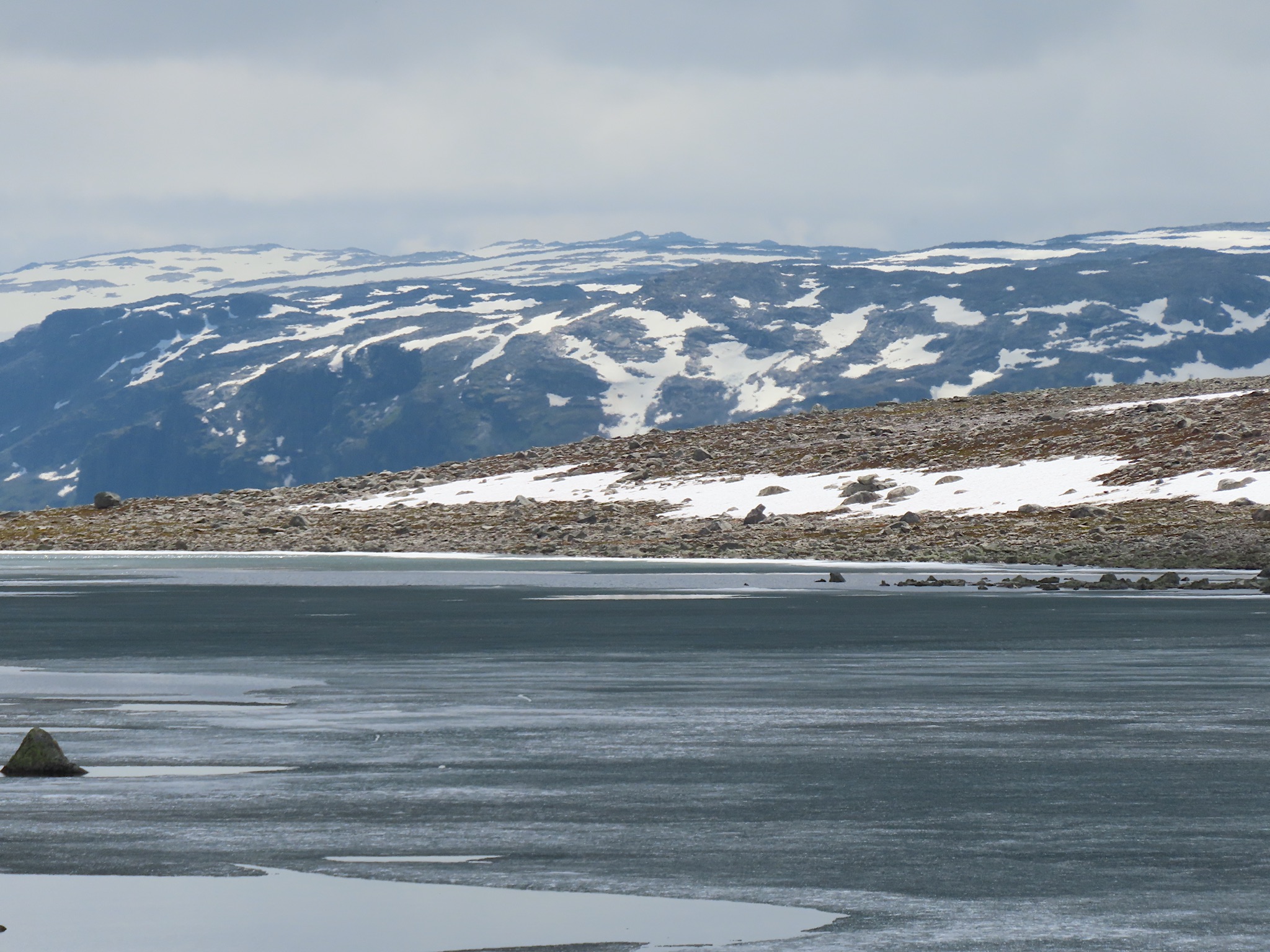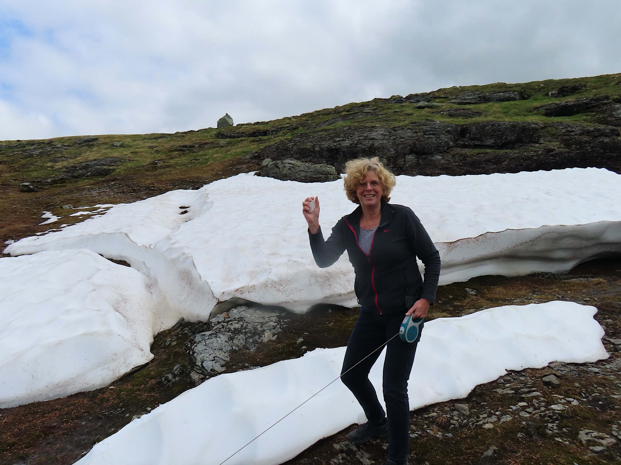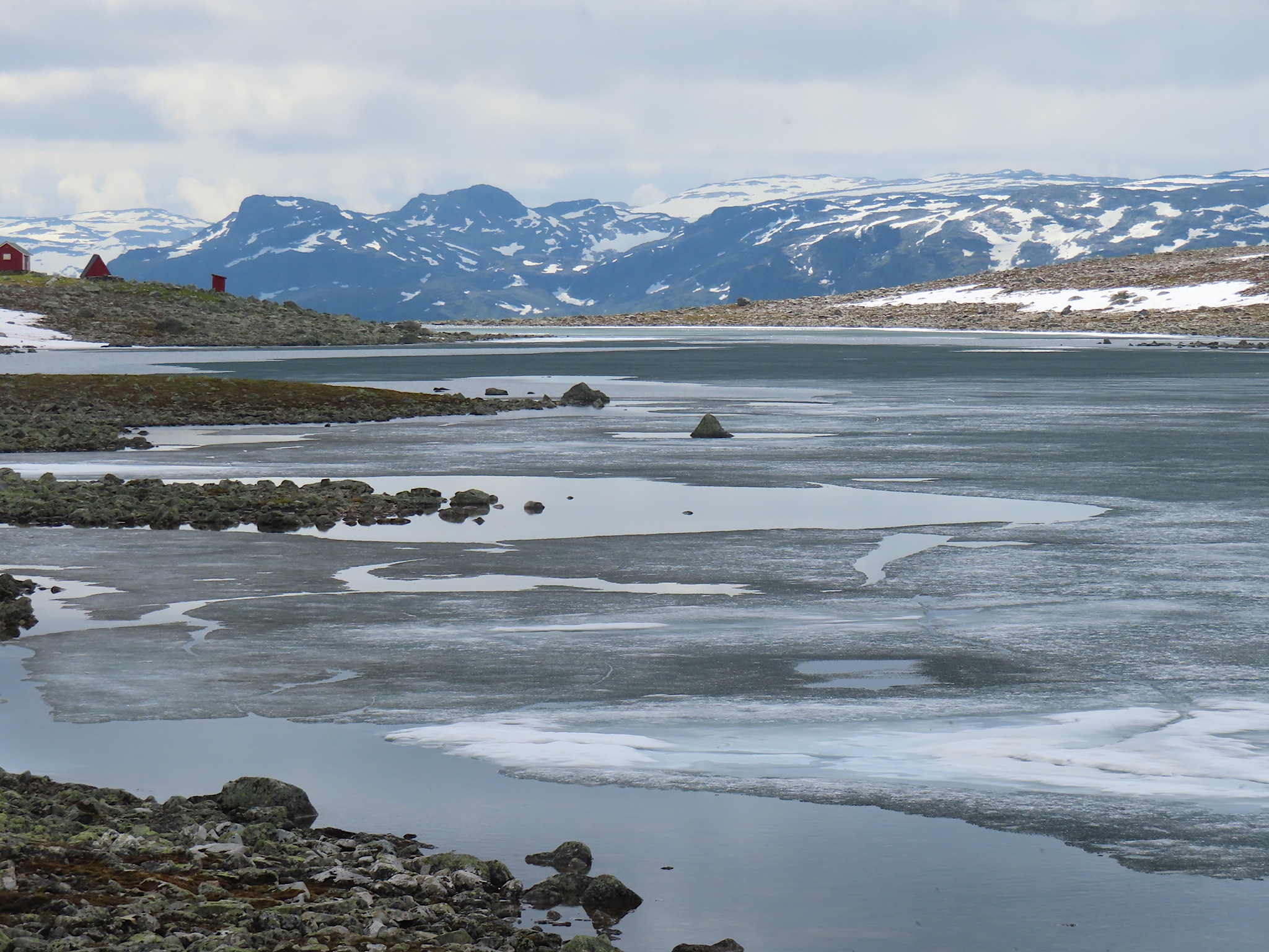 We vertrekken al vroeg want het wordt vandaag een lange rit vol kronkelige wegen. De verhuurster RIta is met geen stok (of bel of klop) wakker te krijgen. Uiteindelijk belt Tineke haar en neemt ze op. Ze wenst ons goede reis en verontschuldigd zich voor de weinige aandacht die ze voor ons had. Het is droog en het zonnetje piept er af en toe door. Af en toe ook omdat we veel, heel veel, te veel door tunnels rijden. Mooie maar ook hele slechte. Ze hebben het hier allemaal uitgevonden net als de kaasschaaf overigens. Onze eerste stop is in Voss, een leuke actieve plaats aan een meer. Parapenters oefenen in het park waar net een muziekfestival is geweest. Meeuwen voeren schijnaanvallen uit Sambo. We maken gebruik van het toilet van het Esso benzinestation. De code is 1968 voor degenen die daar nog eens langs gaan. Nog meer tunnels en langer en langer. Als er een 24,5 km tunnel wordt aangekondigd besluiten we voor de verandering eens de pas over te gaan. Dat was verrassend mooi. Eerste stuk steil omhoog met veel haarspelden. We hebben het geluk achter een bus uit Oekraïne te zitten. Iedereen die we tegenkomen maakt ruim baan voor die bus en dus voor ons. Boven wacht ons een prachtig uitzicht over de Aurlandsfjord. Als we door rijden komen we in een kaal maanlandschap waar sneeuw en ijs nog volop aanwezig is. Dat blijft spectaculair.