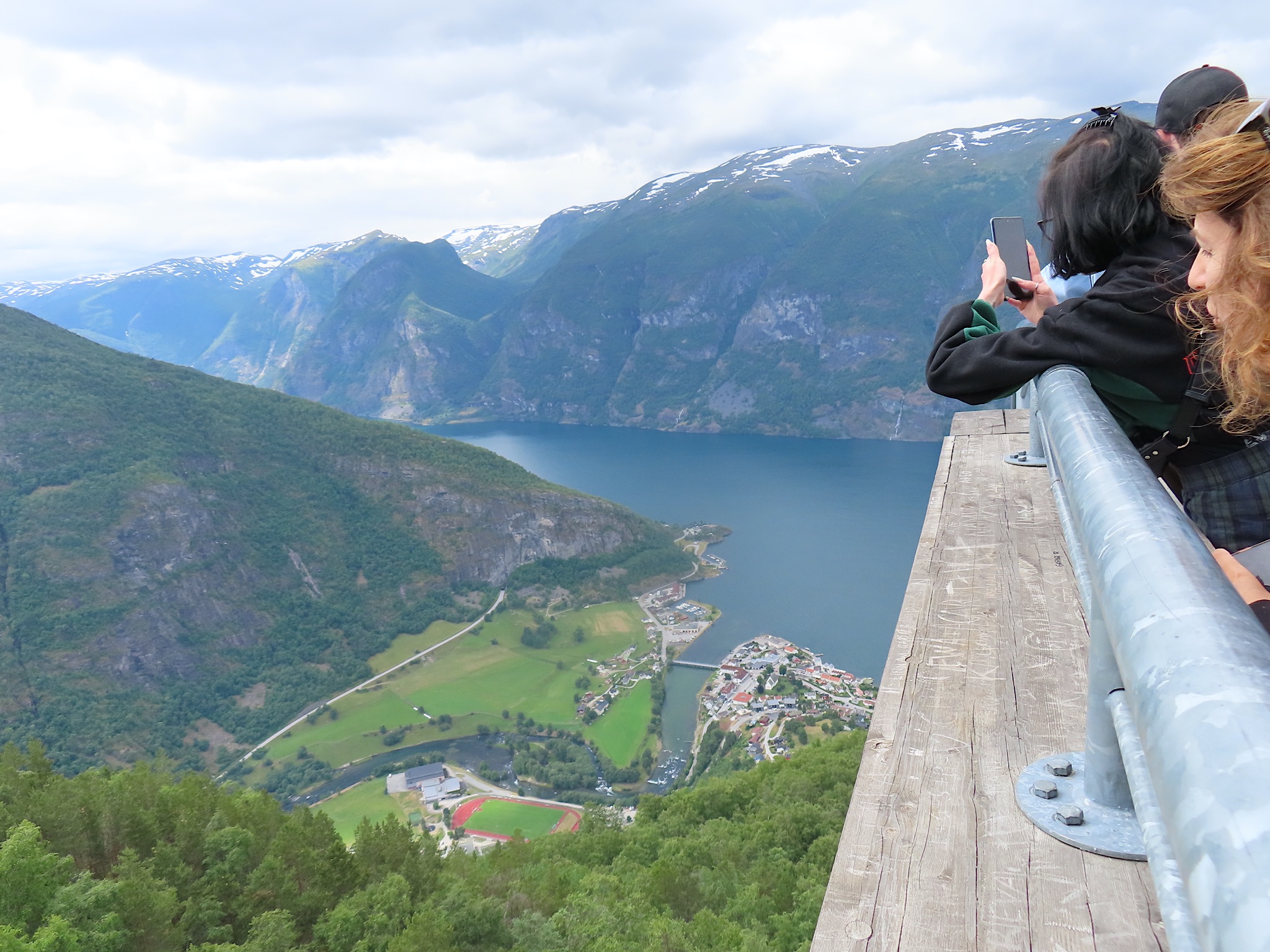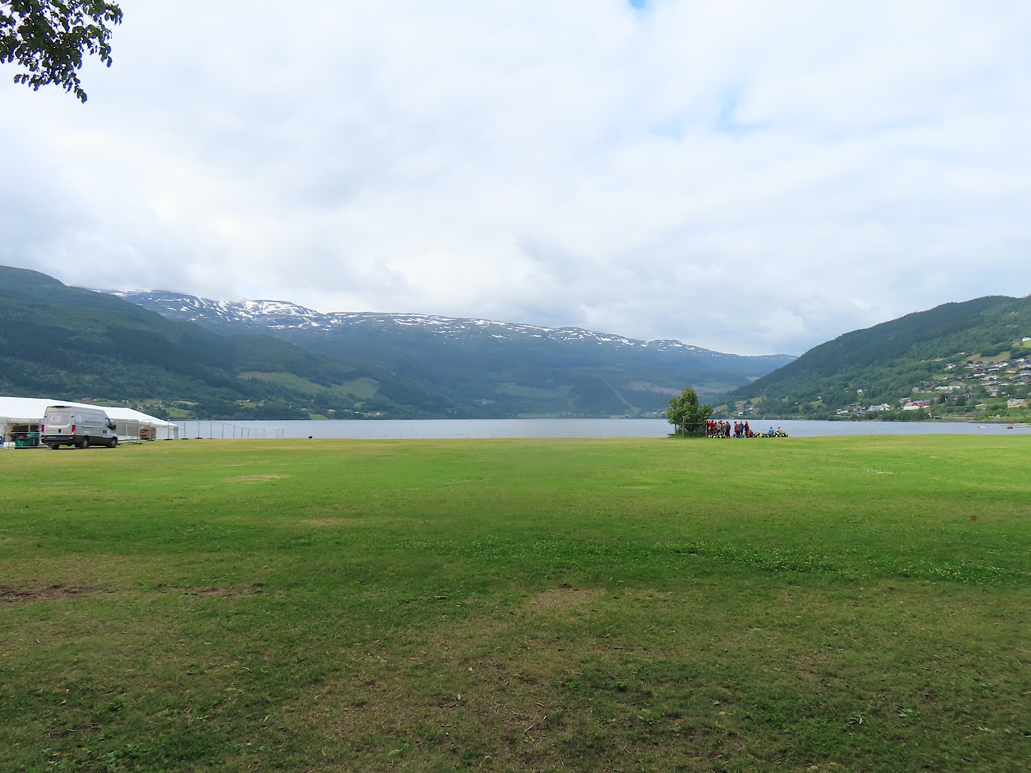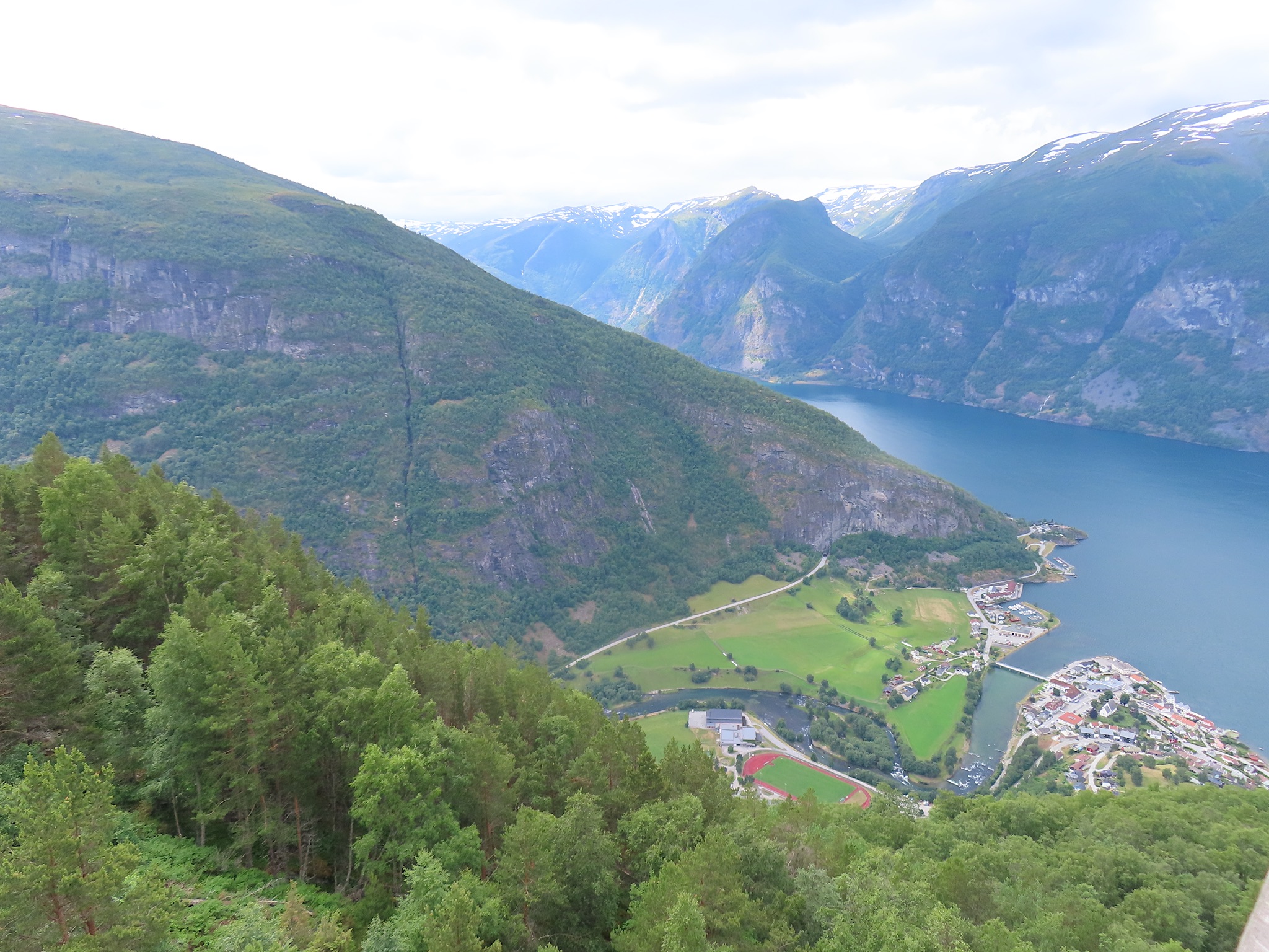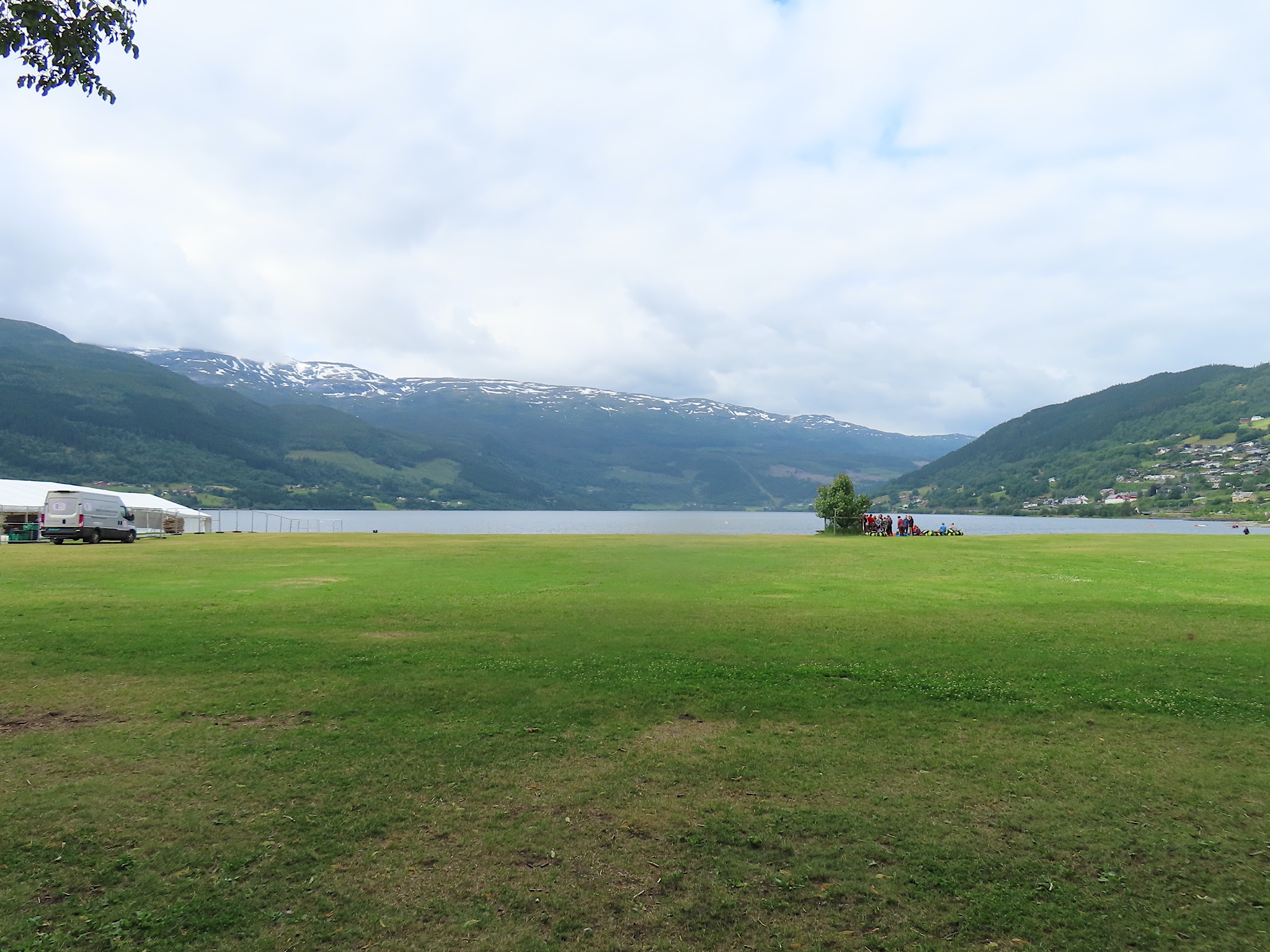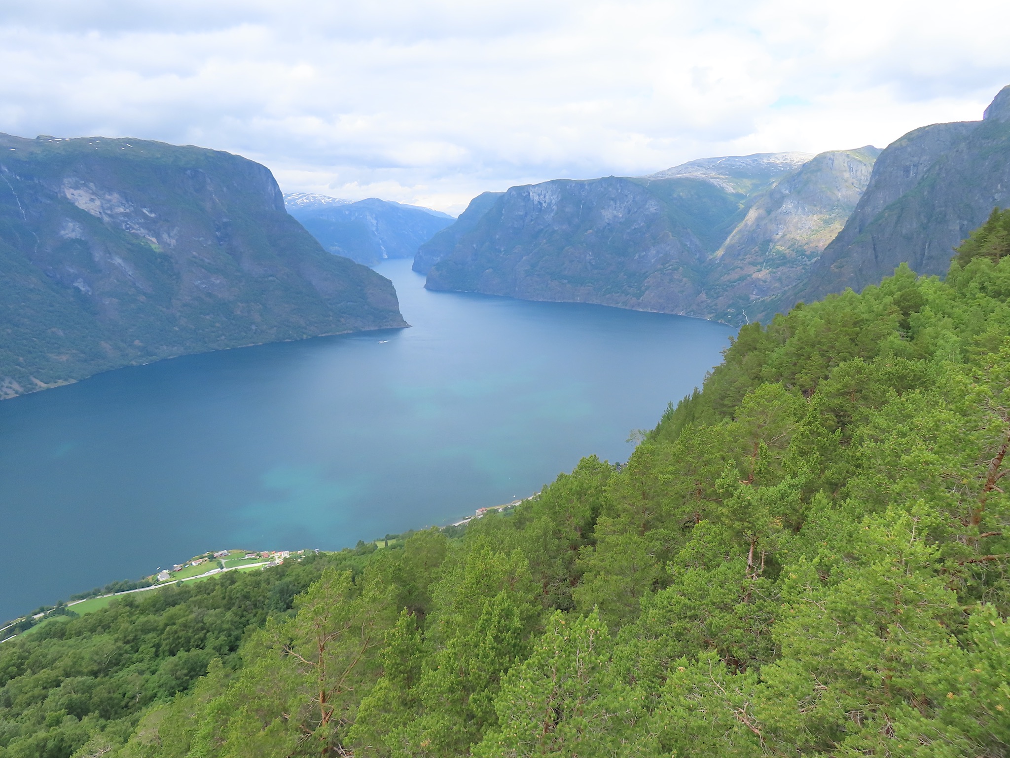 We vertrekken al vroeg want het wordt vandaag een lange rit vol kronkelige wegen. De verhuurster RIta is met geen stok (of bel of klop) wakker te krijgen. Uiteindelijk belt Tineke haar en neemt ze op. Ze wenst ons goede reis en verontschuldigd zich voor de weinige aandacht die ze voor ons had. Het is droog en het zonnetje piept er af en toe door. Af en toe ook omdat we veel, heel veel, te veel door tunnels rijden. Mooie maar ook hele slechte. Ze hebben het hier allemaal uitgevonden net als de kaasschaaf overigens. Onze eerste stop is in Voss, een leuke actieve plaats aan een meer. Parapenters oefenen in het park waar net een muziekfestival is geweest. Meeuwen voeren schijnaanvallen uit Sambo. We maken gebruik van het toilet van het Esso benzinestation. De code is 1968 voor degenen die daar nog eens langs gaan. Nog meer tunnels en langer en langer. Als er een 24,5 km tunnel wordt aangekondigd besluiten we voor de verandering eens de pas over te gaan. Dat was verrassend mooi. Eerste stuk steil omhoog met veel haarspelden. We hebben het geluk achter een bus uit Oekraïne te zitten. Iedereen die we tegenkomen maakt ruim baan voor die bus en dus voor ons. Boven wacht ons een prachtig uitzicht over de Aurlandsfjord. Als we door rijden komen we in een kaal maanlandschap waar sneeuw en ijs nog volop aanwezig is. Dat blijft spectaculair.