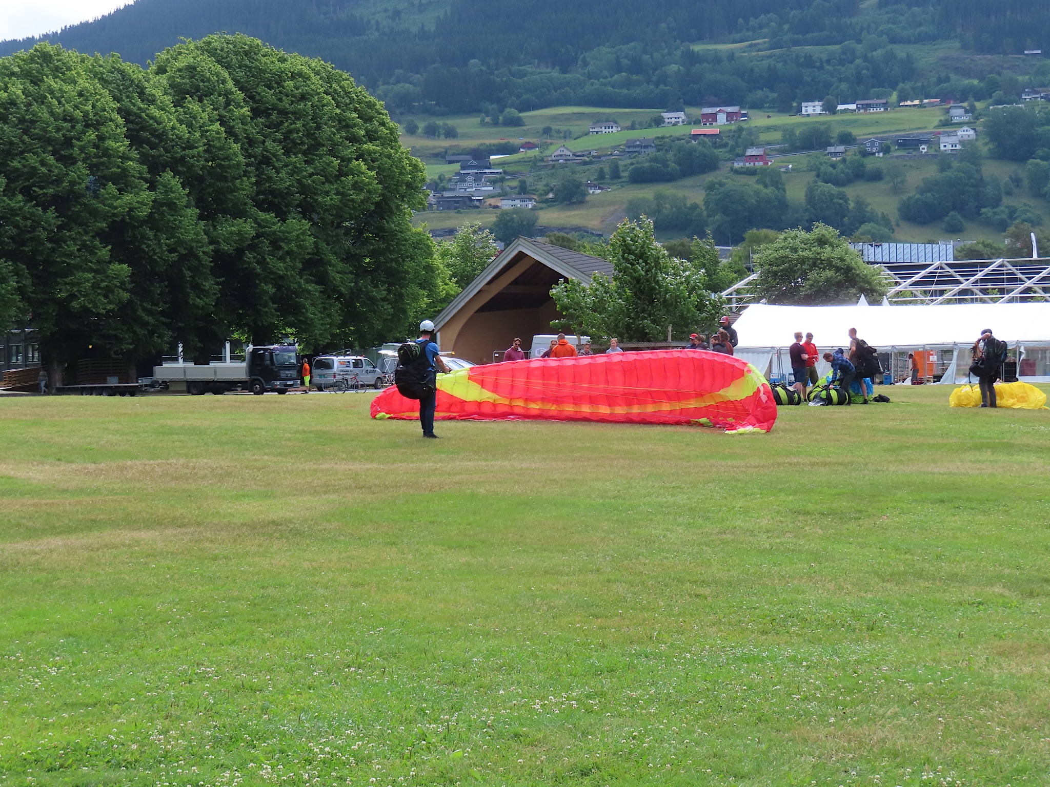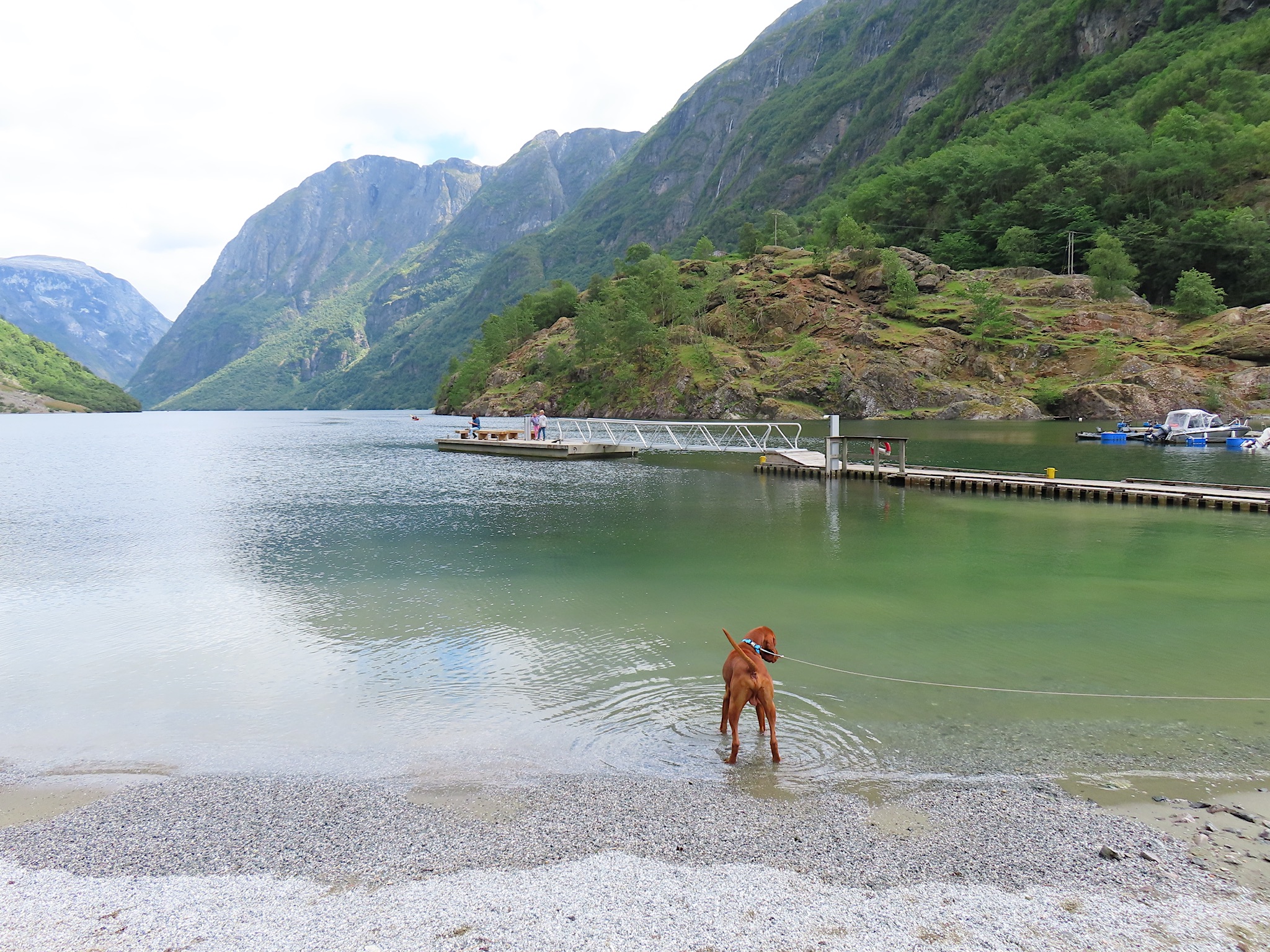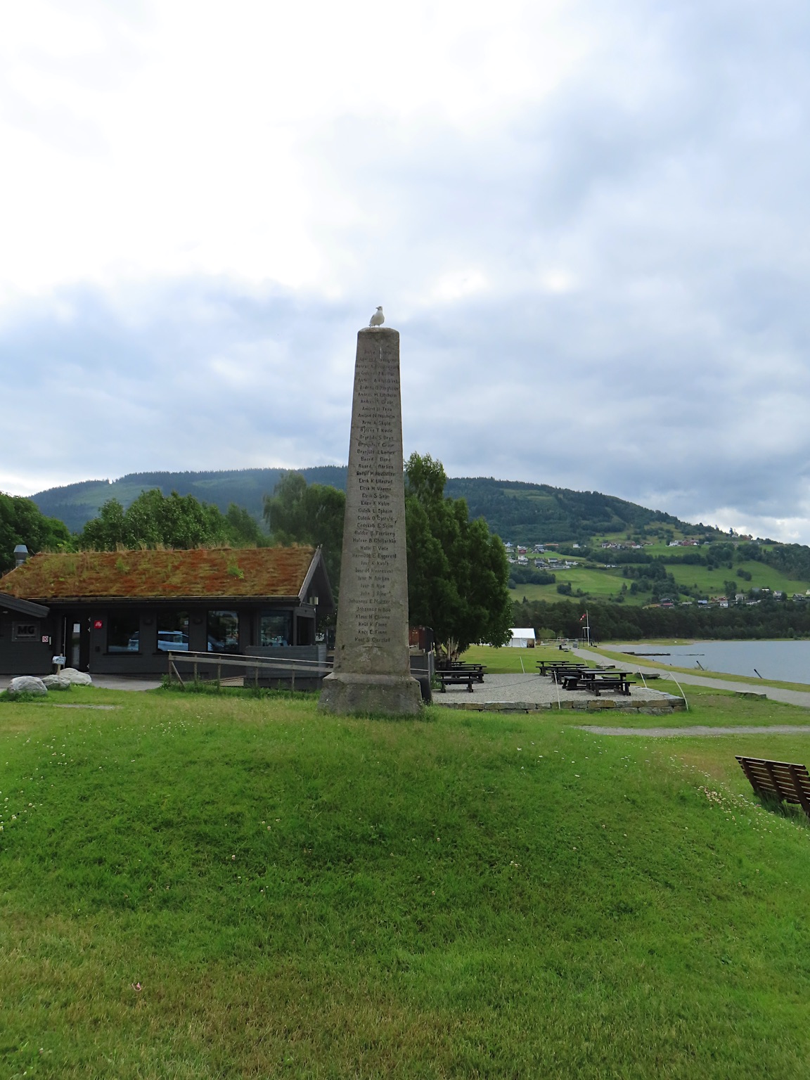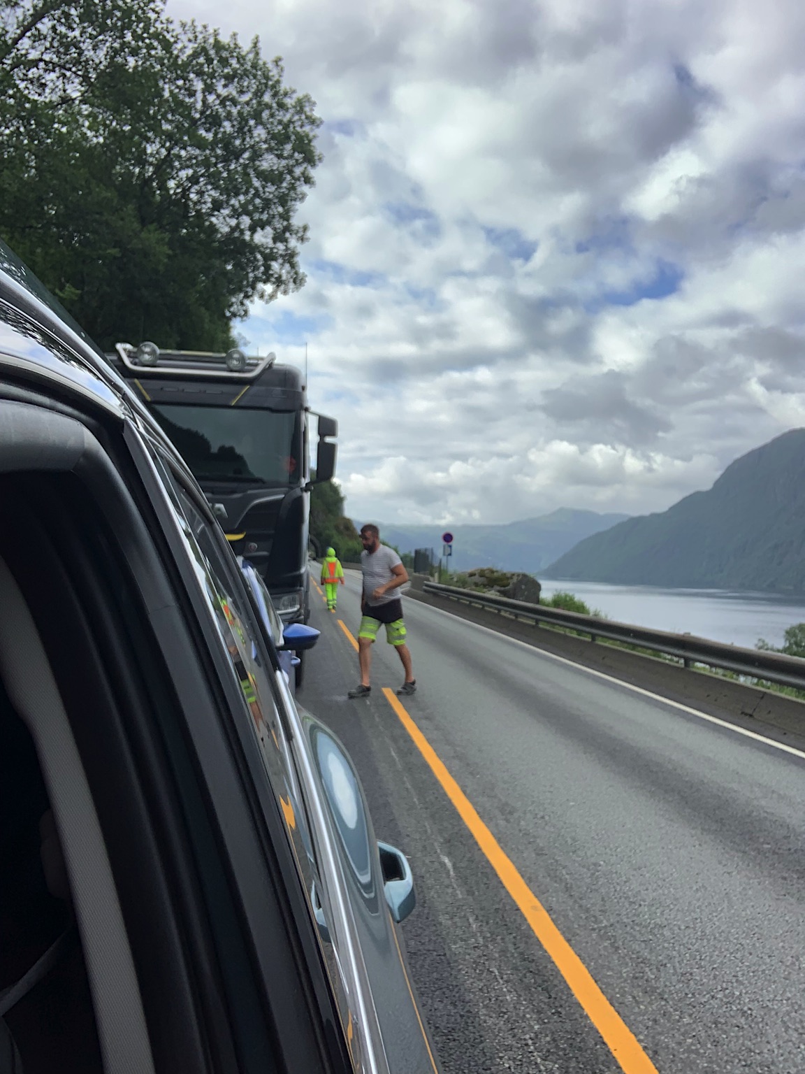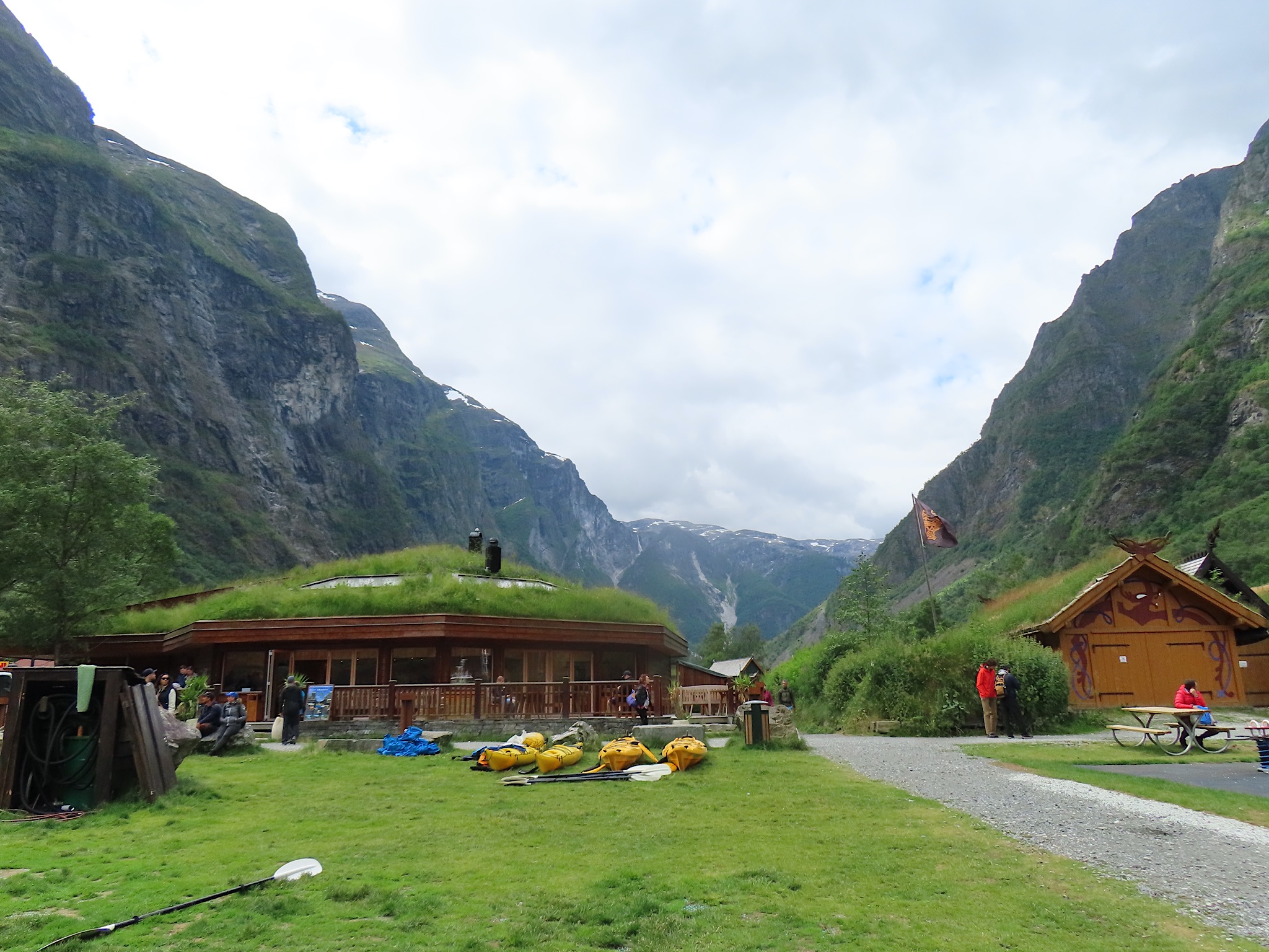 We vertrekken al vroeg want het wordt vandaag een lange rit vol kronkelige wegen. De verhuurster RIta is met geen stok (of bel of klop) wakker te krijgen. Uiteindelijk belt Tineke haar en neemt ze op. Ze wenst ons goede reis en verontschuldigd zich voor de weinige aandacht die ze voor ons had. Het is droog en het zonnetje piept er af en toe door. Af en toe ook omdat we veel, heel veel, te veel door tunnels rijden. Mooie maar ook hele slechte. Ze hebben het hier allemaal uitgevonden net als de kaasschaaf overigens. Onze eerste stop is in Voss, een leuke actieve plaats aan een meer. Parapenters oefenen in het park waar net een muziekfestival is geweest. Meeuwen voeren schijnaanvallen uit Sambo. We maken gebruik van het toilet van het Esso benzinestation. De code is 1968 voor degenen die daar nog eens langs gaan. Nog meer tunnels en langer en langer. Als er een 24,5 km tunnel wordt aangekondigd besluiten we voor de verandering eens de pas over te gaan. Dat was verrassend mooi. Eerste stuk steil omhoog met veel haarspelden. We hebben het geluk achter een bus uit Oekraïne te zitten. Iedereen die we tegenkomen maakt ruim baan voor die bus en dus voor ons. Boven wacht ons een prachtig uitzicht over de Aurlandsfjord. Als we door rijden komen we in een kaal maanlandschap waar sneeuw en ijs nog volop aanwezig is. Dat blijft spectaculair.