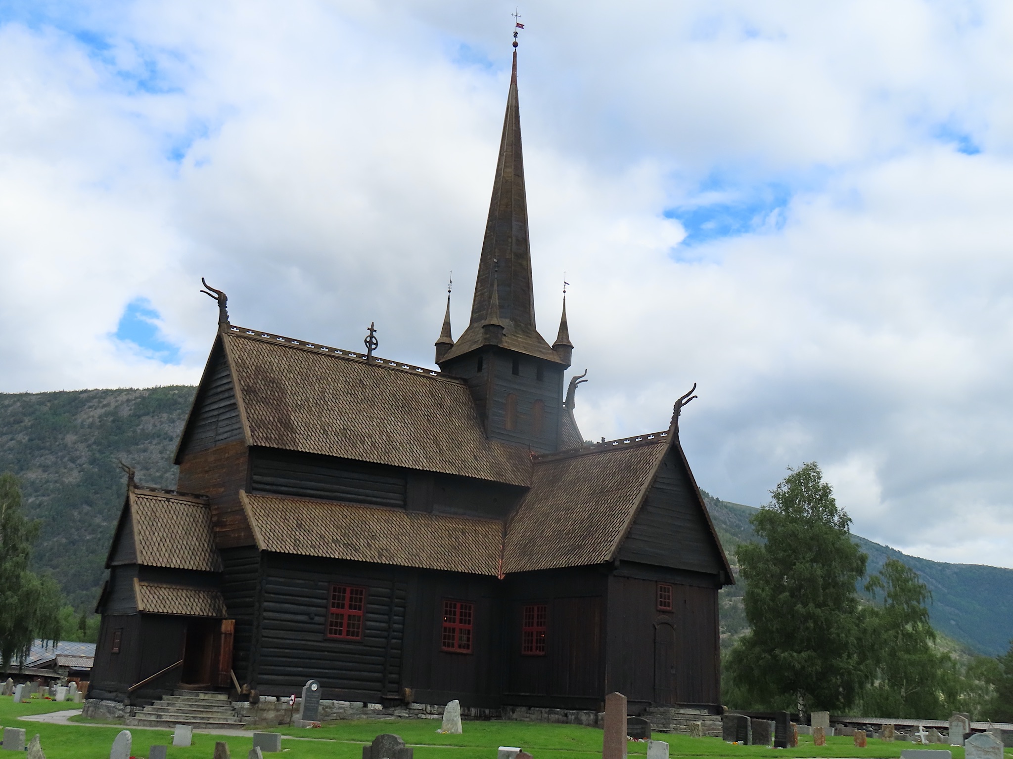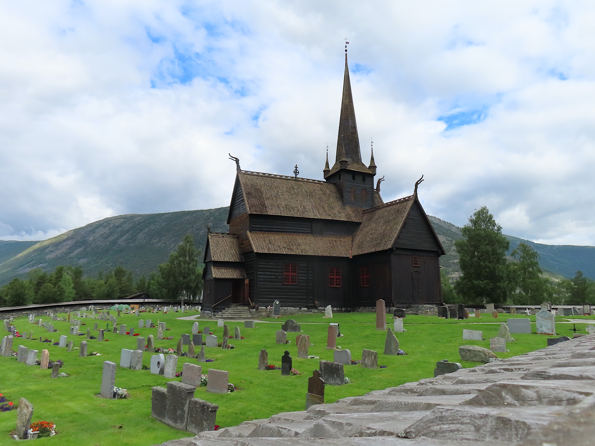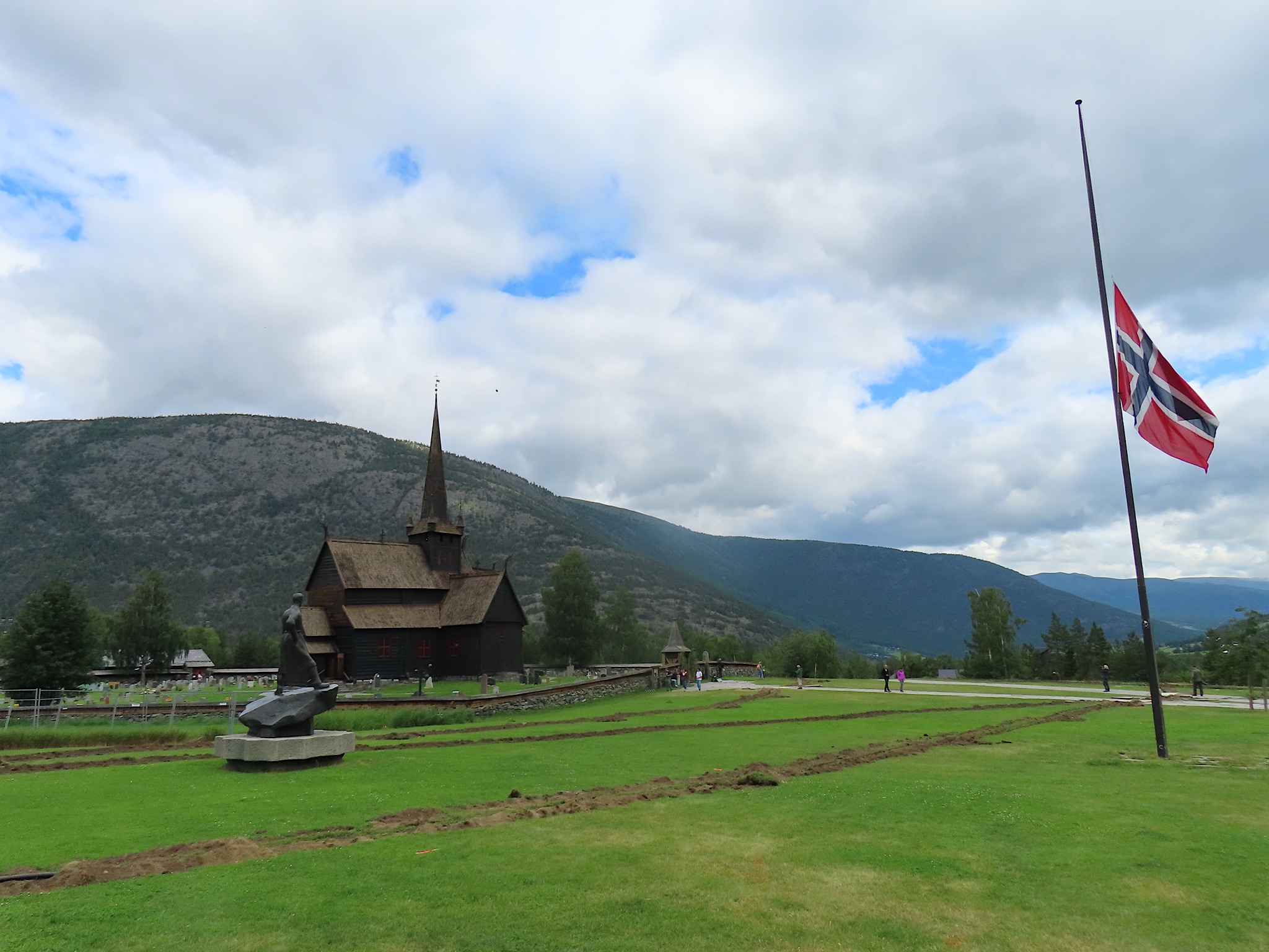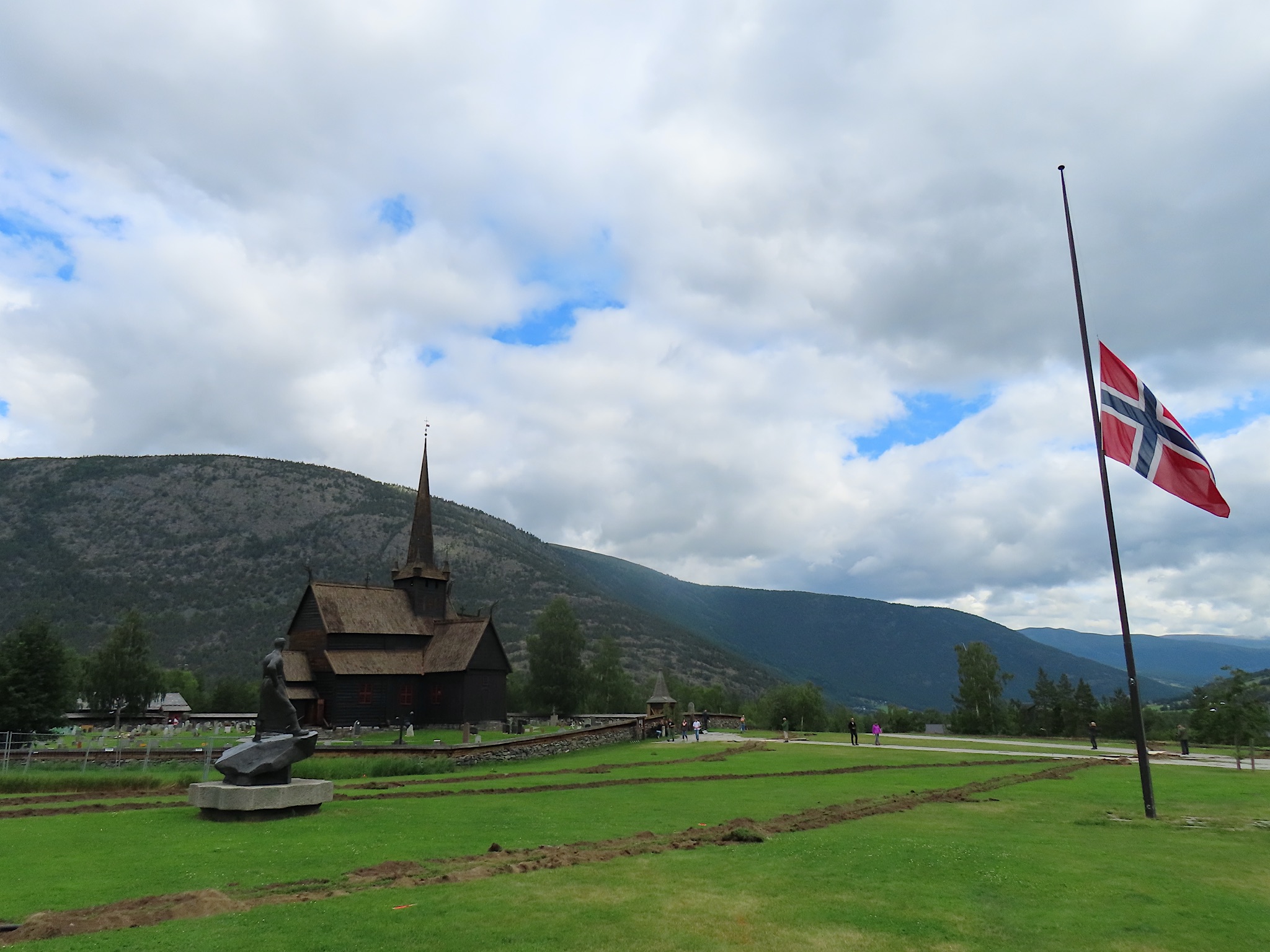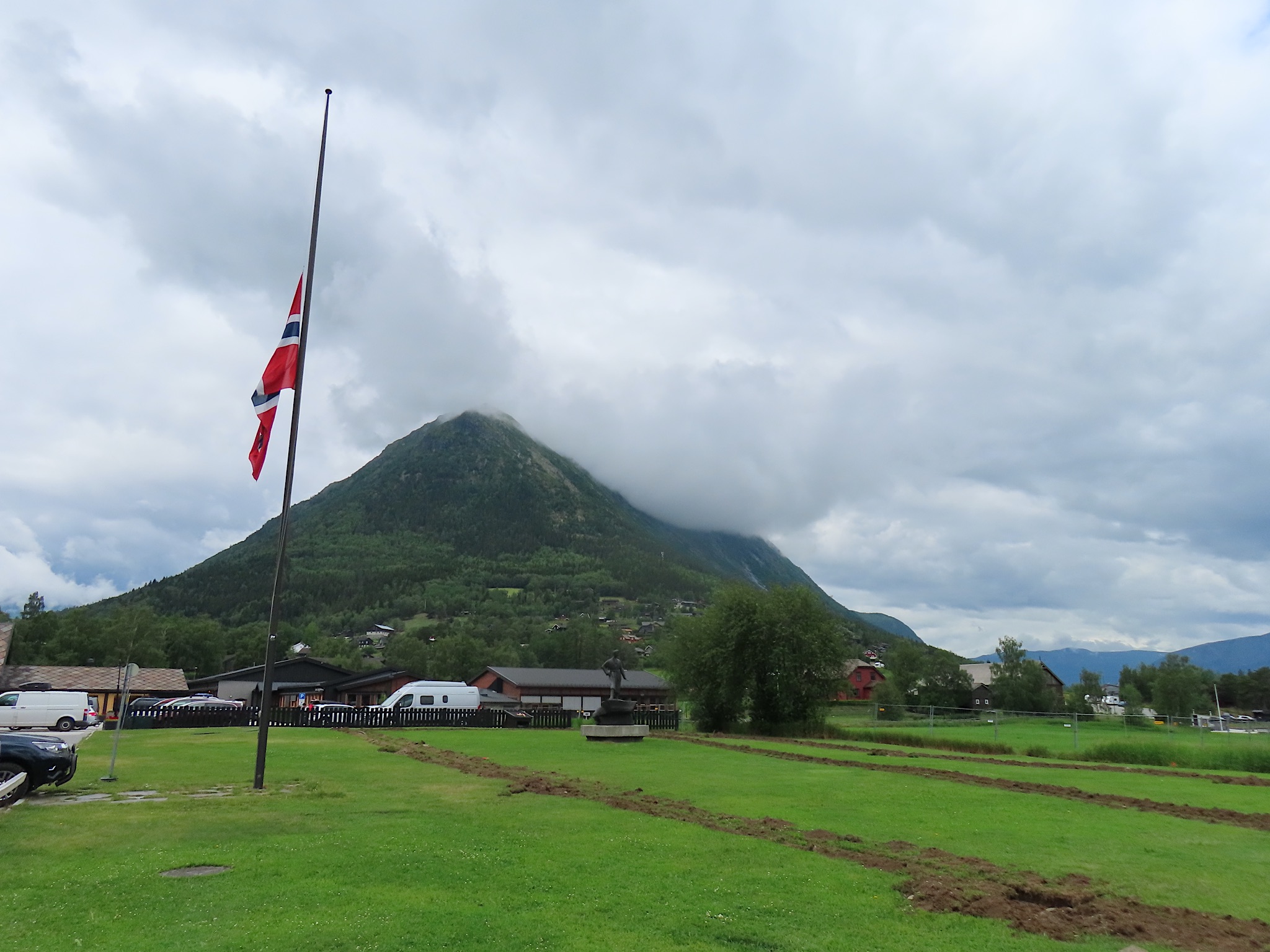 We staan vroeg op want het wordt een lange reis vandaag. We gaan via de toeristische route naar het vogeleiland Runde in de Noorse Zee. We hebben 350km voor de boeg. Gezien de kronkelige wegen en de maximum gemiddelde snelheid van ongeveer 60km/h gaat het wel even duren. We stoppen nar 35km even in Luster om bij de bakker daar iets lekkers te kopen voor bij de koffie later deze morgen. We kronkelen langs meren en fljorden. Dan begint weg 55 te stijgen en komen we af en toe in flarden van wolken. Over de pas gaan we van het Vestland naar Innland. Hoger en hoger gaat het en mistiger en mistiger wordt het. Op 1400meter zien we echt geen hand voor ogen en rijden we op de nog net zichtbare zijstrepen van de weg. Af en toe een tegenliggende camper en geen idee hebben waar je bent en hoe lang dit nog duurt is niet heel fijn. Na een uurtje dalen we langzaam af naar Lom een mondaine wintersportplaats met een mooie staafkerk. We stoppen daar en drinken koffie. De staafkerk is even niet te bezoeken omdat er een begrafenis gaande is. Goed gebruik in Norge is de vlaggen dan halfstok te hangen.