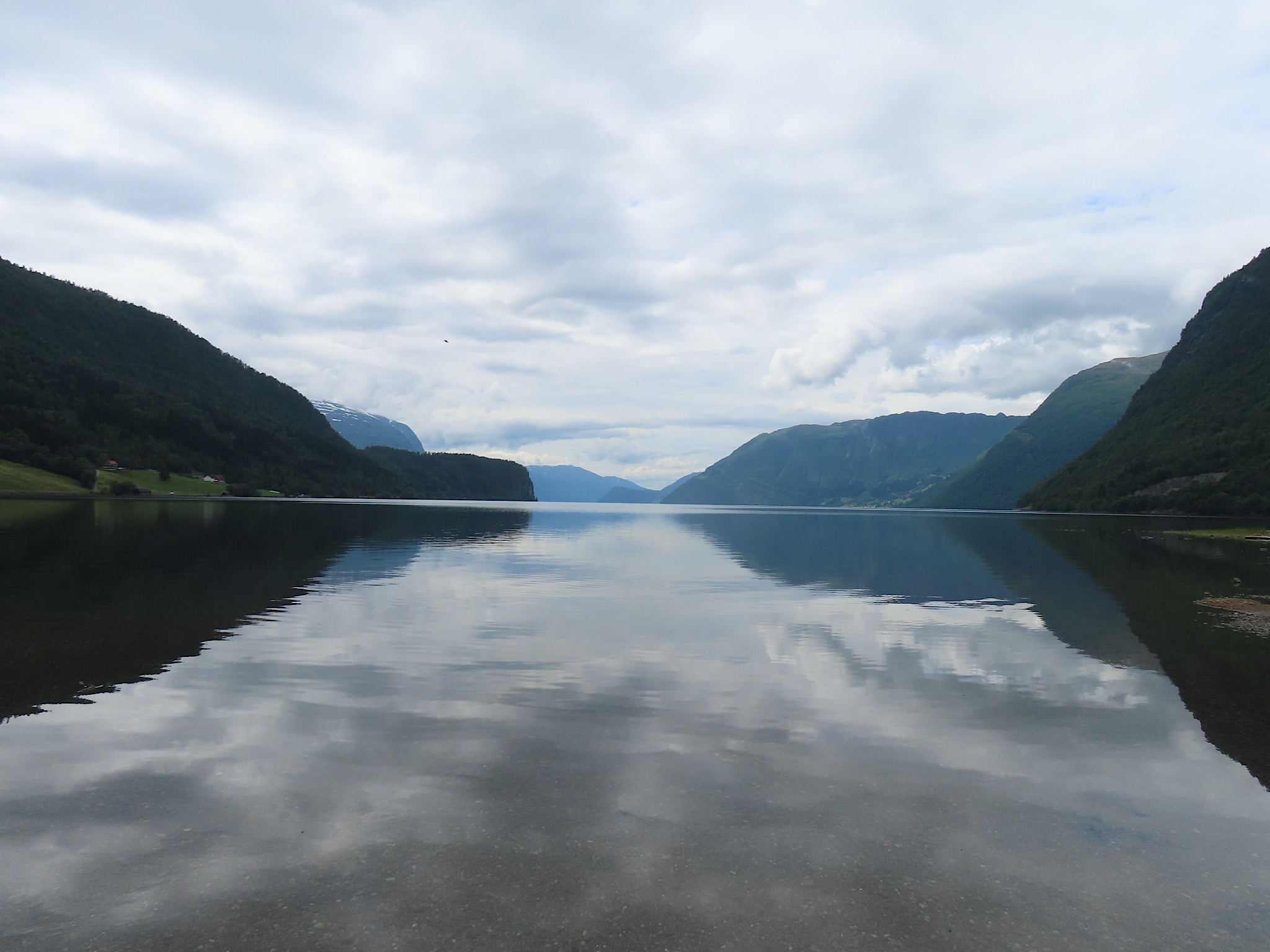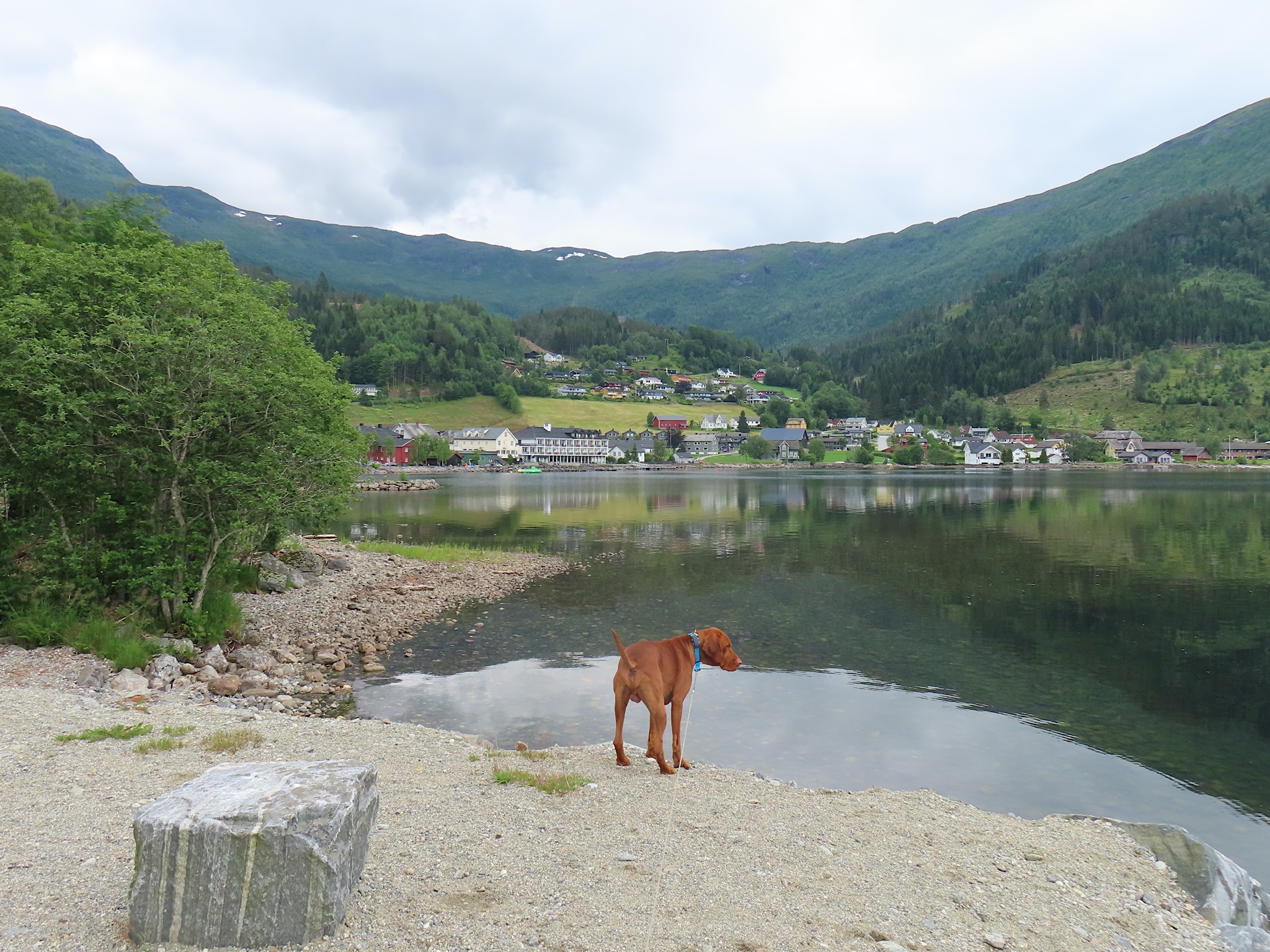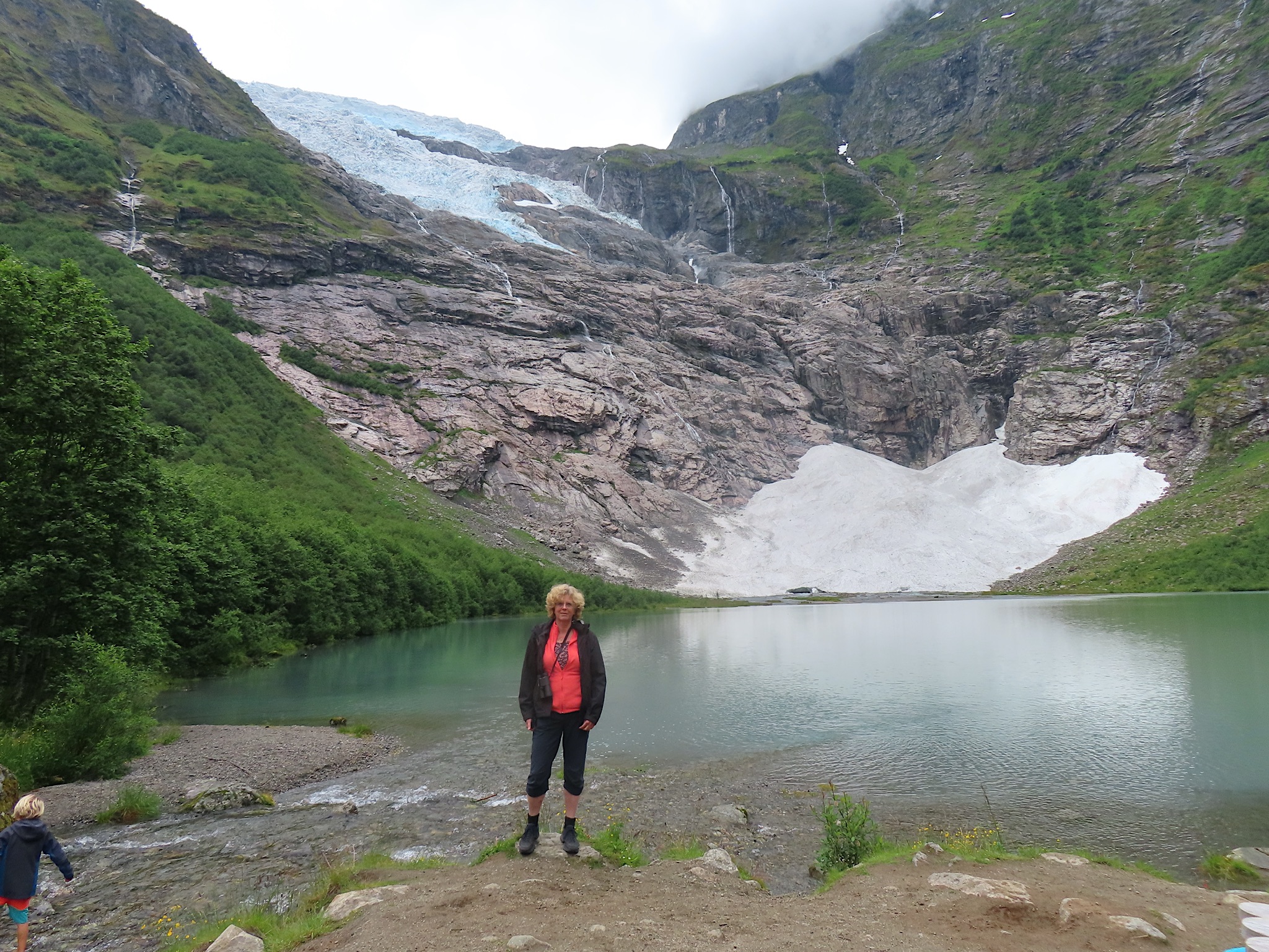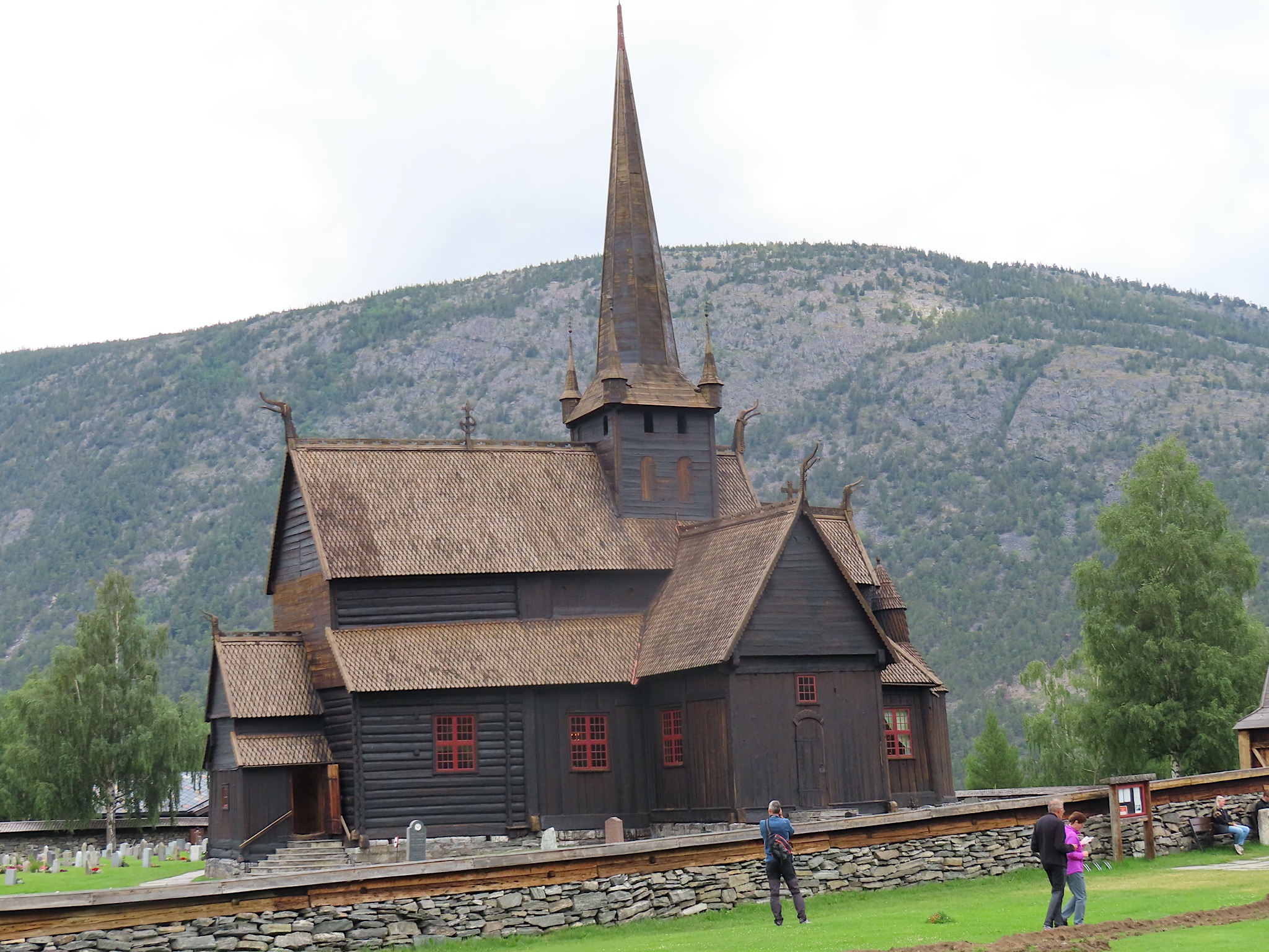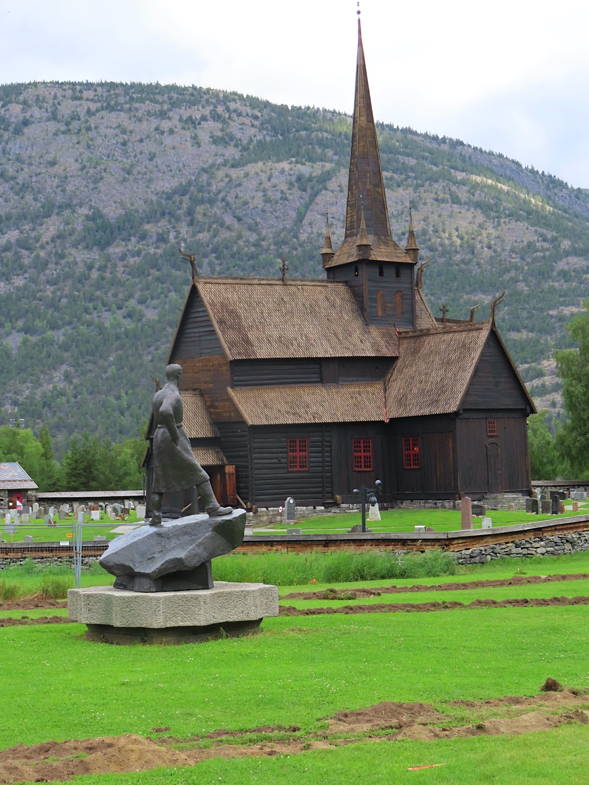 We staan vroeg op want het wordt een lange reis vandaag. We gaan via de toeristische route naar het vogeleiland Runde in de Noorse Zee. We hebben 350km voor de boeg. Gezien de kronkelige wegen en de maximum gemiddelde snelheid van ongeveer 60km/h gaat het wel even duren. We stoppen nar 35km even in Luster om bij de bakker daar iets lekkers te kopen voor bij de koffie later deze morgen. We kronkelen langs meren en fljorden. Dan begint weg 55 te stijgen en komen we af en toe in flarden van wolken. Over de pas gaan we van het Vestland naar Innland. Hoger en hoger gaat het en mistiger en mistiger wordt het. Op 1400meter zien we echt geen hand voor ogen en rijden we op de nog net zichtbare zijstrepen van de weg. Af en toe een tegenliggende camper en geen idee hebben waar je bent en hoe lang dit nog duurt is niet heel fijn. Na een uurtje dalen we langzaam af naar Lom een mondaine wintersportplaats met een mooie staafkerk. We stoppen daar en drinken koffie. De staafkerk is even niet te bezoeken omdat er een begrafenis gaande is. Goed gebruik in Norge is de vlaggen dan halfstok te hangen.