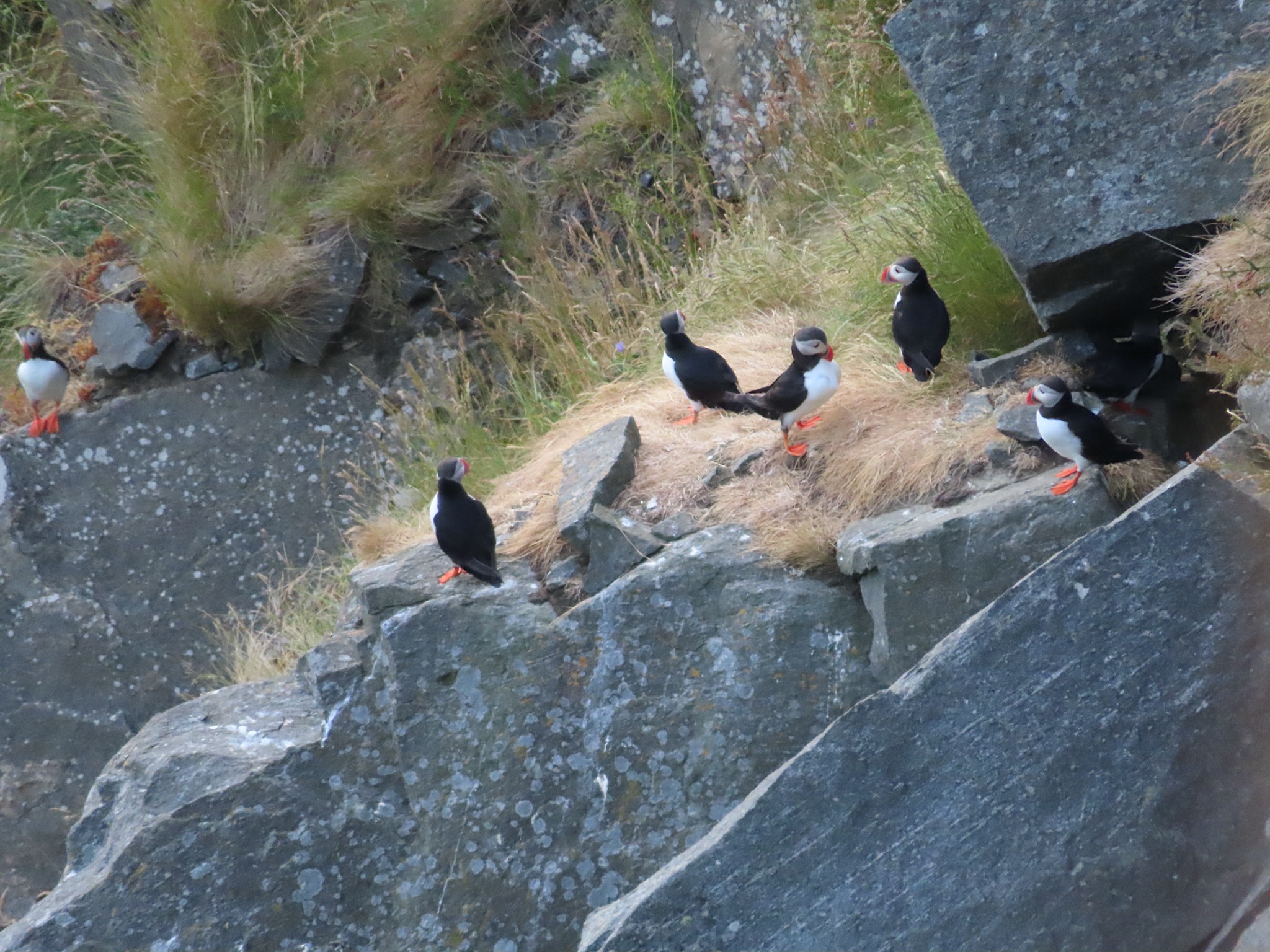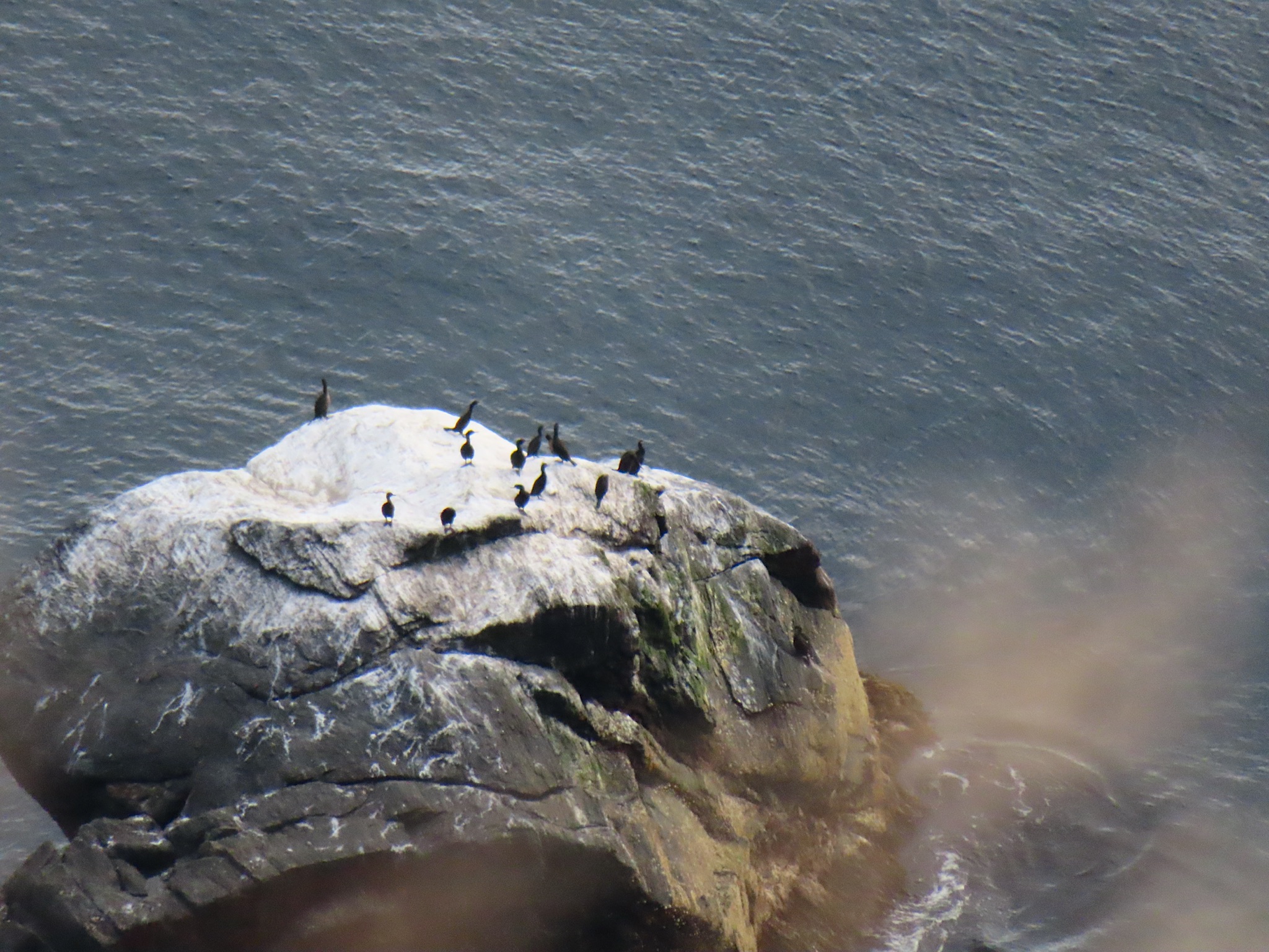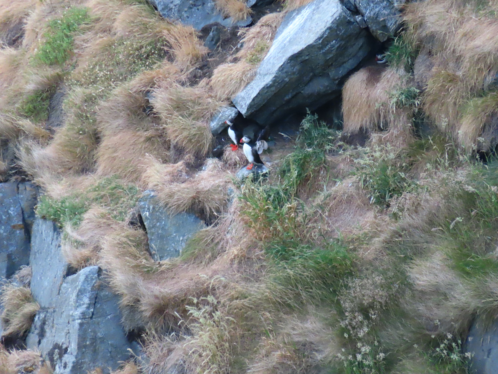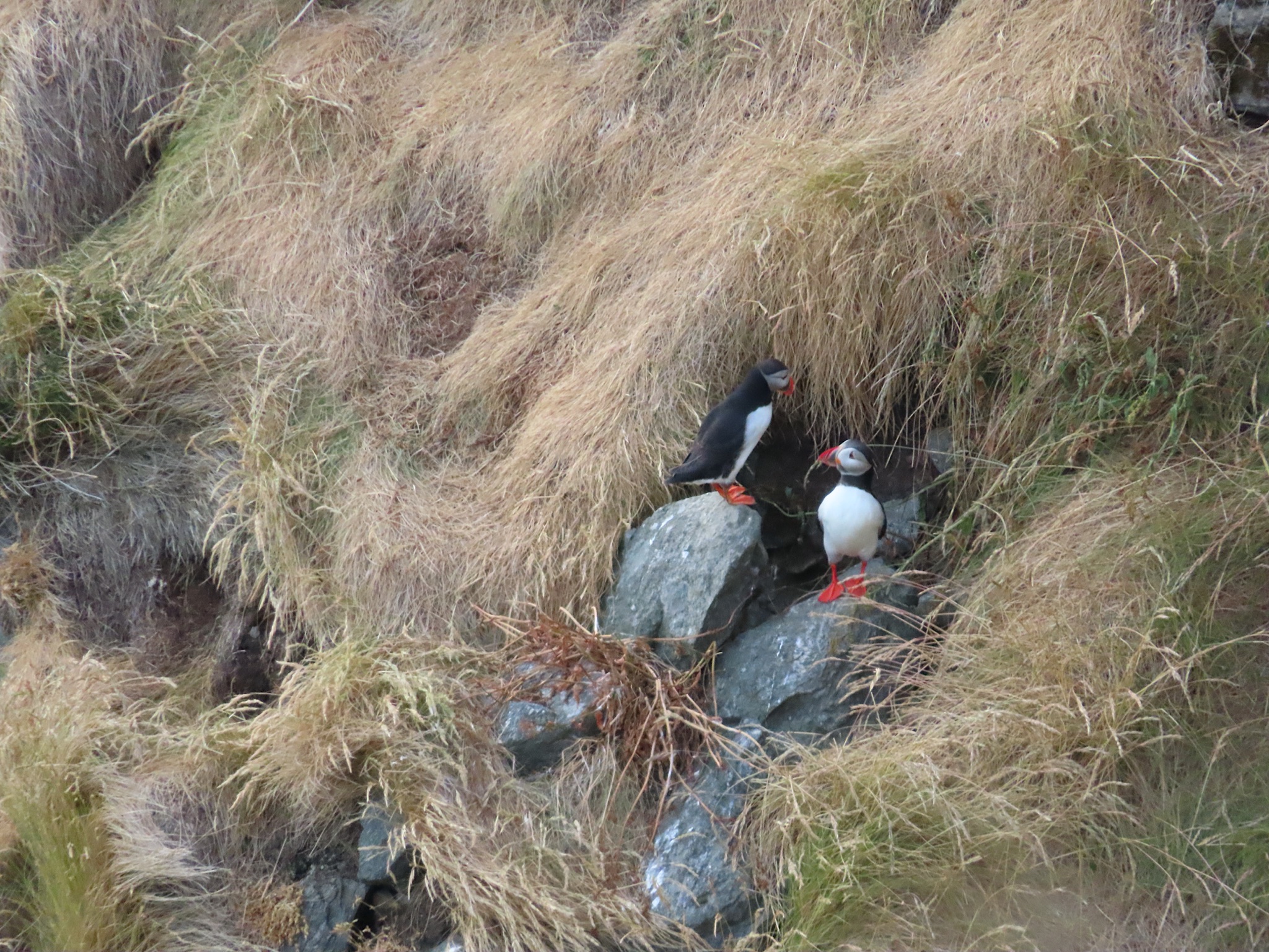 We zien bijna tegelijk honderden, wat zeg ik, misschien wel duizenden, papegaaiduikers die af en aanvliegen om hun jongen te voeden en tientallen Jan van Gent’s vliegen om hun jongen te zoeken tegen de rotswand. Dat worden dus twee kado’s. Tussendoor op de rotsen beneden zitten groepen kuifaalscholvers en in de lucht af en toe een zeearend of grote jager. Echt een aanrader voor iedereen om dit eens te zien. We gaan na twee uur meer dan voldaan terug.