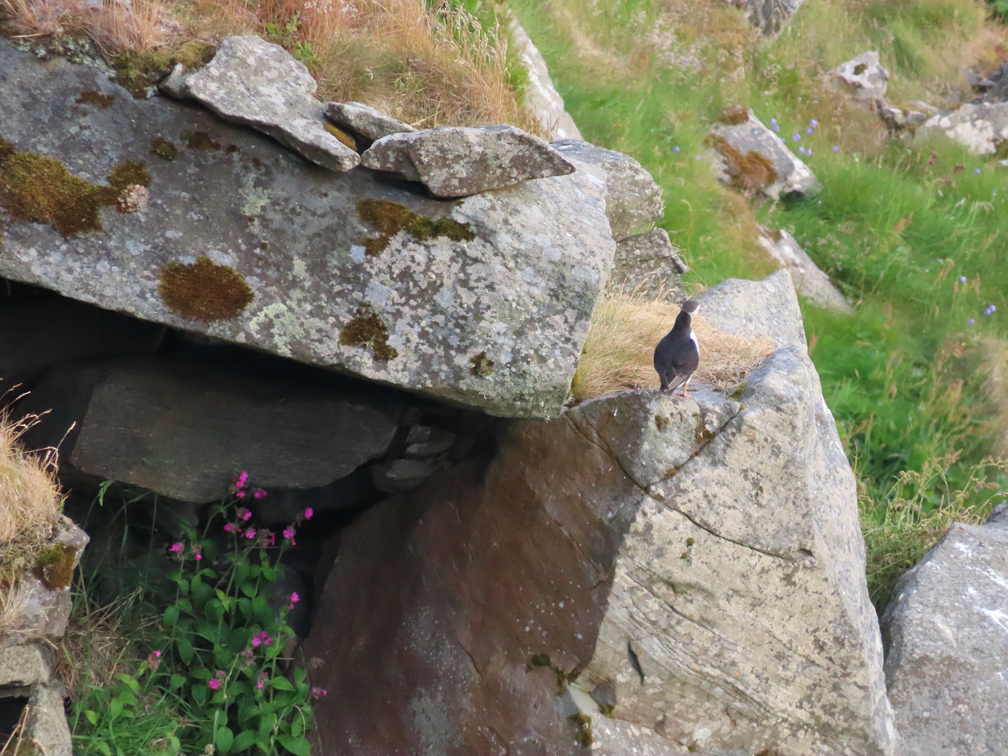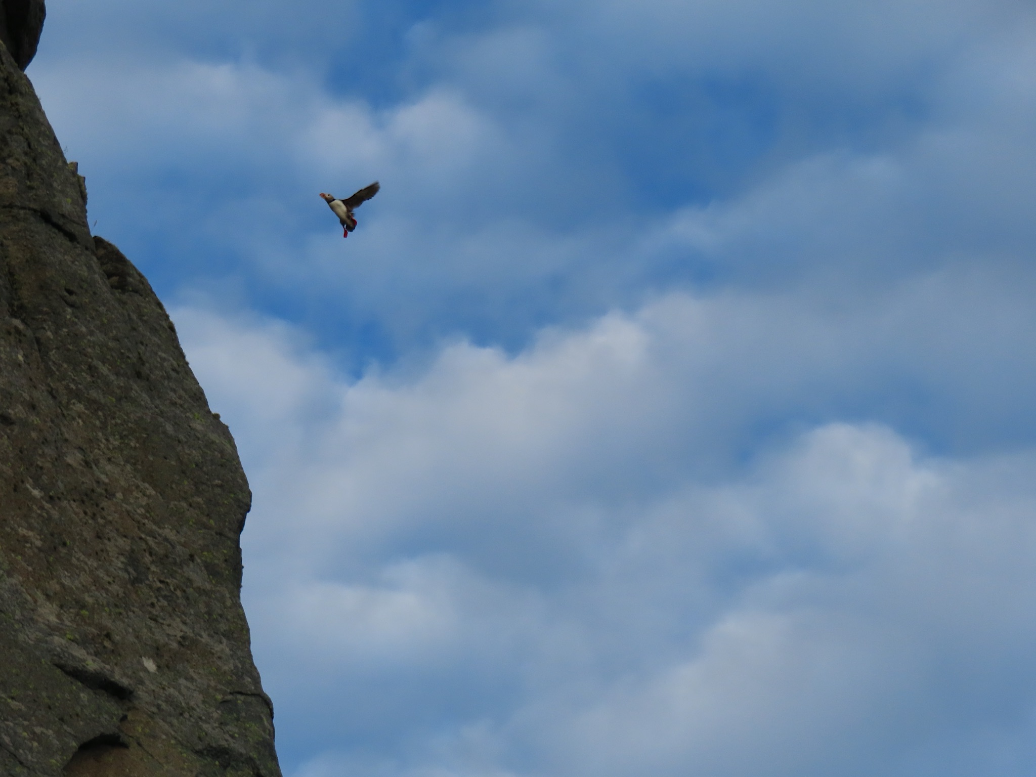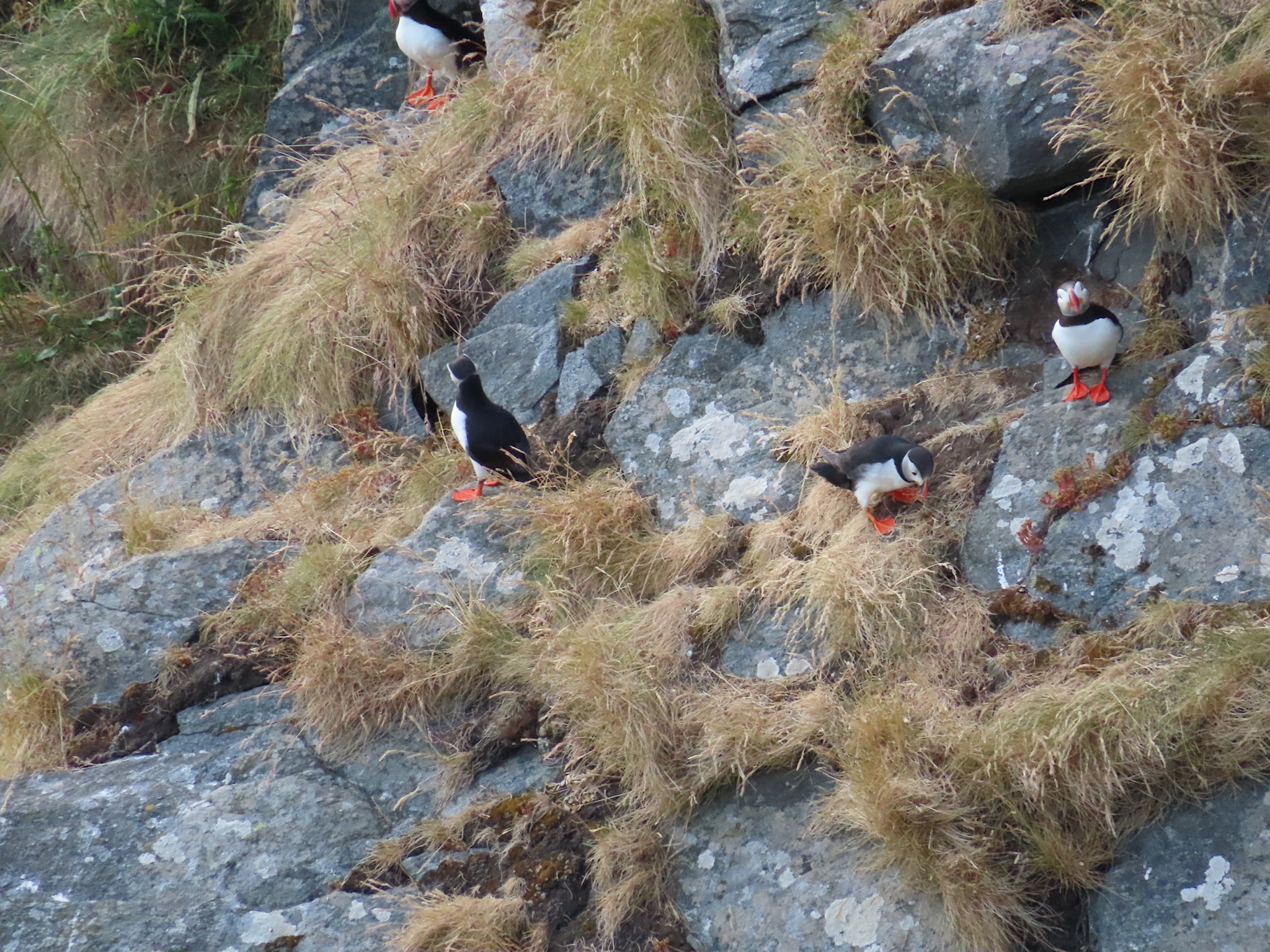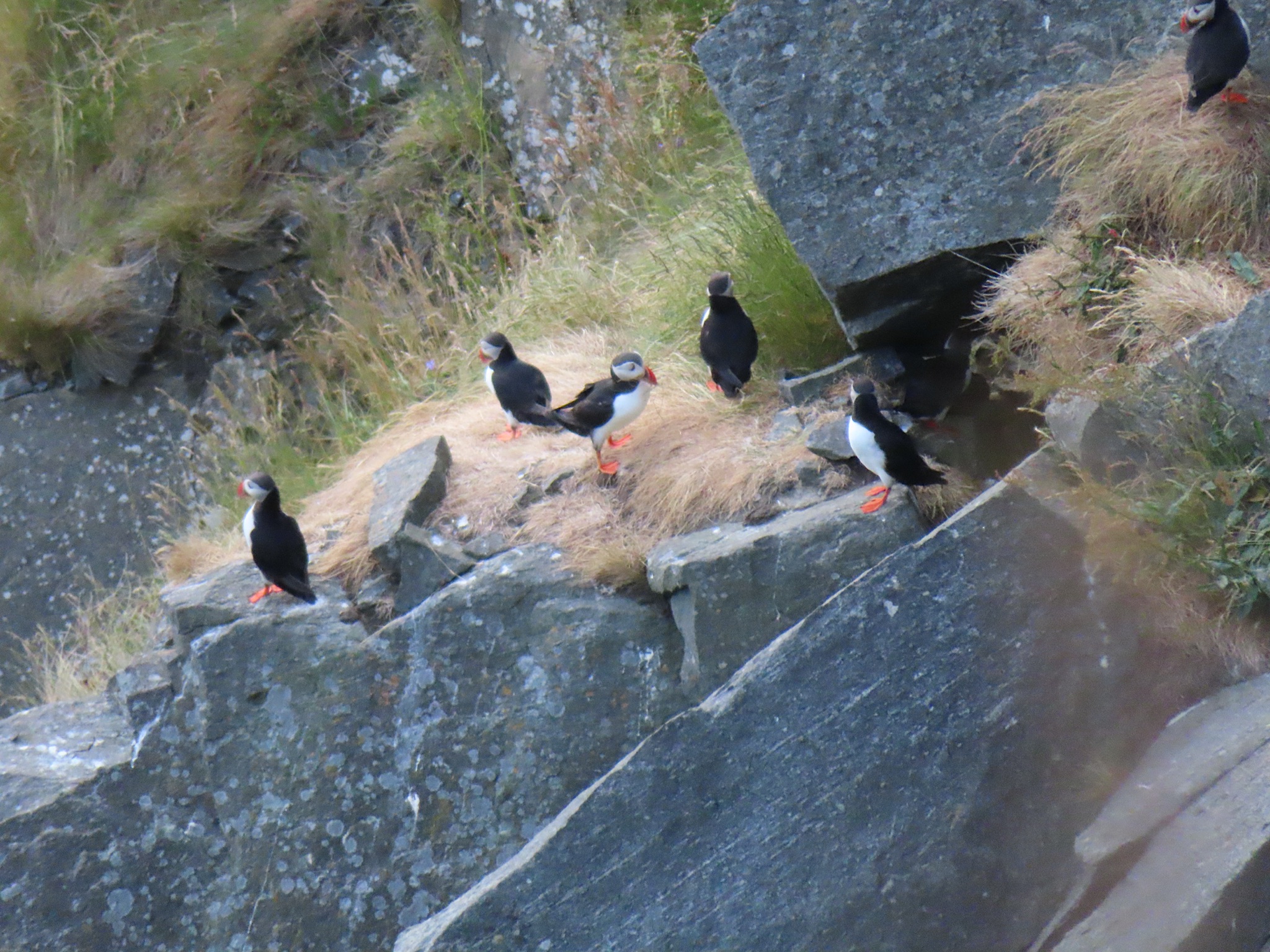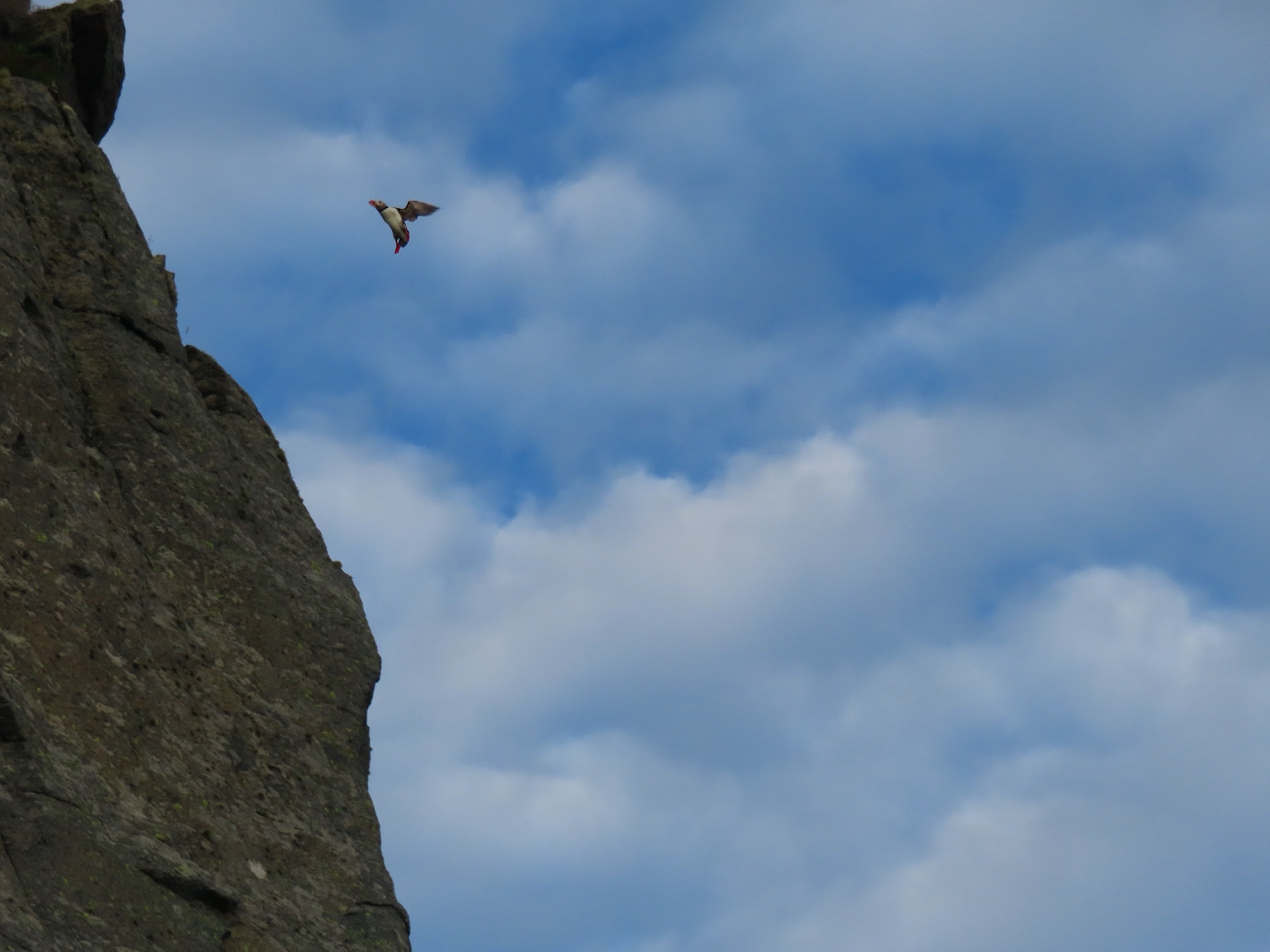 We zien bijna tegelijk honderden, wat zeg ik, misschien wel duizenden, papegaaiduikers die af en aanvliegen om hun jongen te voeden en tientallen Jan van Gent’s vliegen om hun jongen te zoeken tegen de rotswand. Dat worden dus twee kado’s. Tussendoor op de rotsen beneden zitten groepen kuifaalscholvers en in de lucht af en toe een zeearend of grote jager. Echt een aanrader voor iedereen om dit eens te zien. We gaan na twee uur meer dan voldaan terug.