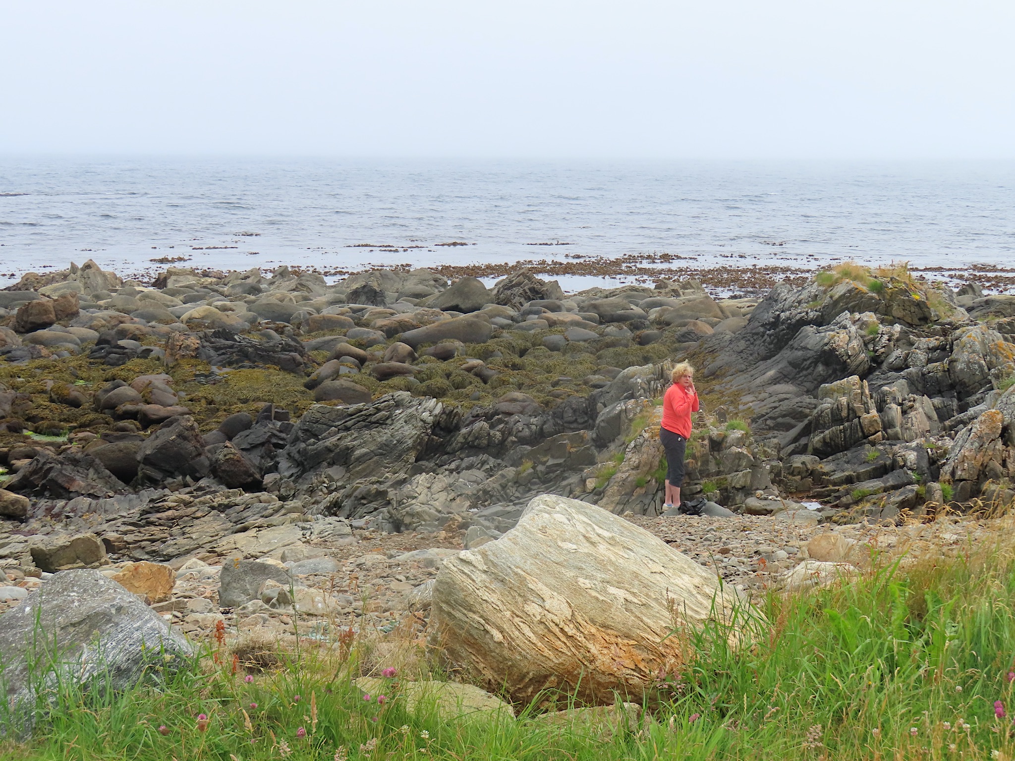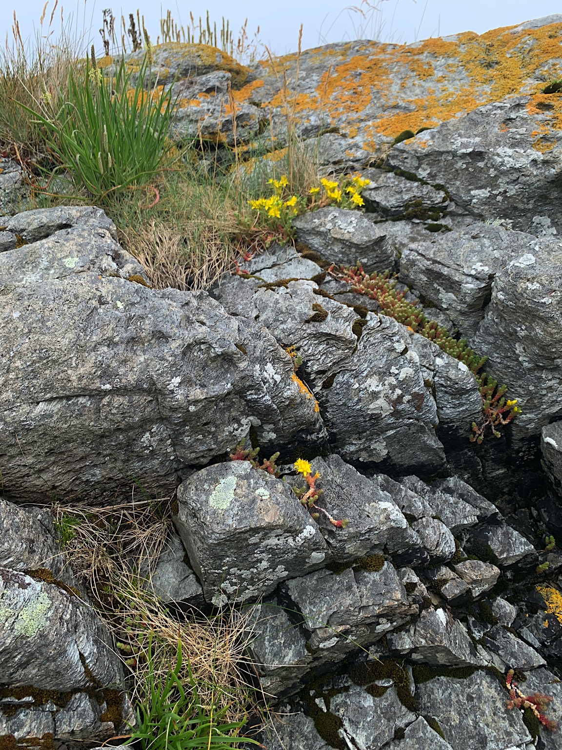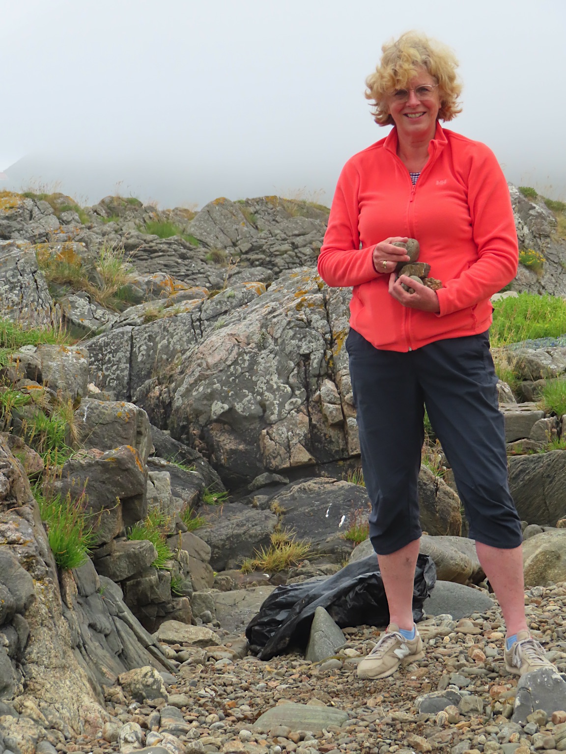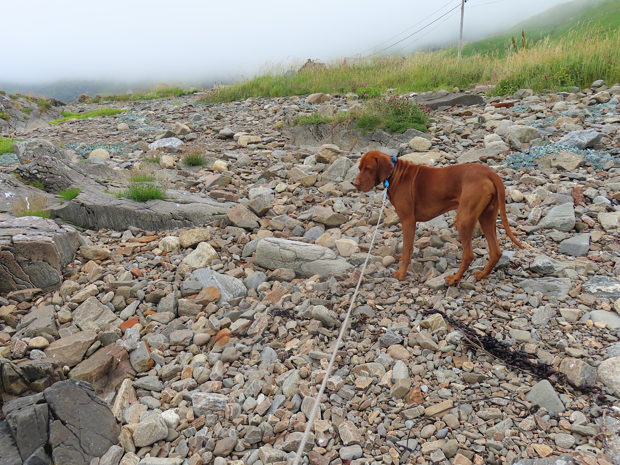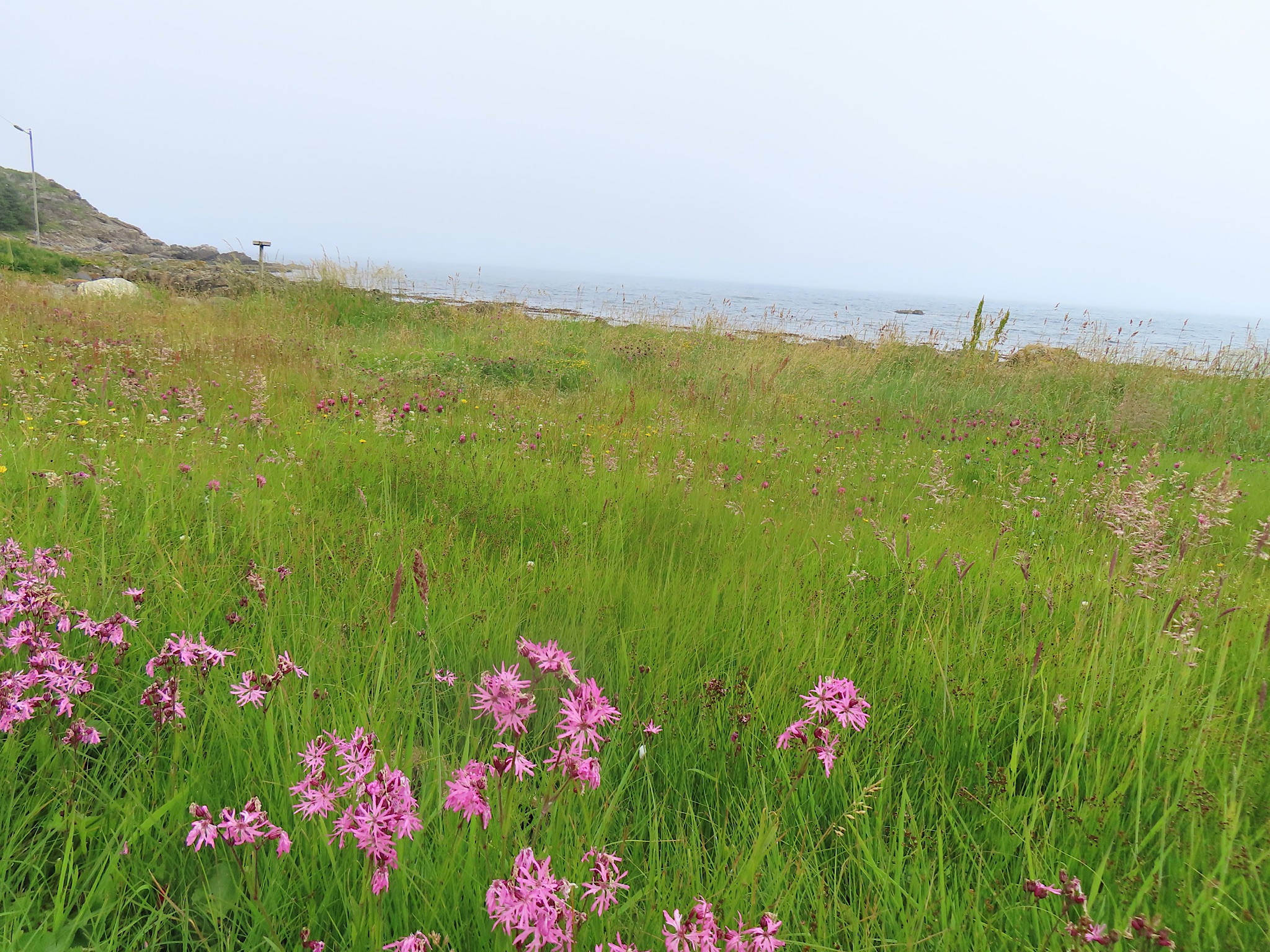 Vandaag de laatste dag op Runde. We rusten uit en genieten van de heerlijke zon. Tineke gaat stenen en schelpen zoeken aan de waterkant tegenover ons huis en heeft daar een lang gesprek met de aankomende wandelen Agnes, de eigenares van ons huis die in het rode huis naast ons witte huis woont. Ik lees wat bij huis. Sambo slaapt bij. Na een uurtje ga met Sambo ook maar eens bij het water kijken. We zien daar behoorlijk wat bijzonder plantjes die we scannen met de PictureThis app. (Zeepostelein, Oesterblad, Muurpeper, Zeeweegbree en de Rimpelroos bijvoorbeeld). De dames zijn net uitgepraat als ik aankom. Er komt inmiddels uit zee langzaam een nevel binnen. In no-time ligt het eiland in de mist. Even snel is alles weer verdwenen en straalt de zon weer.