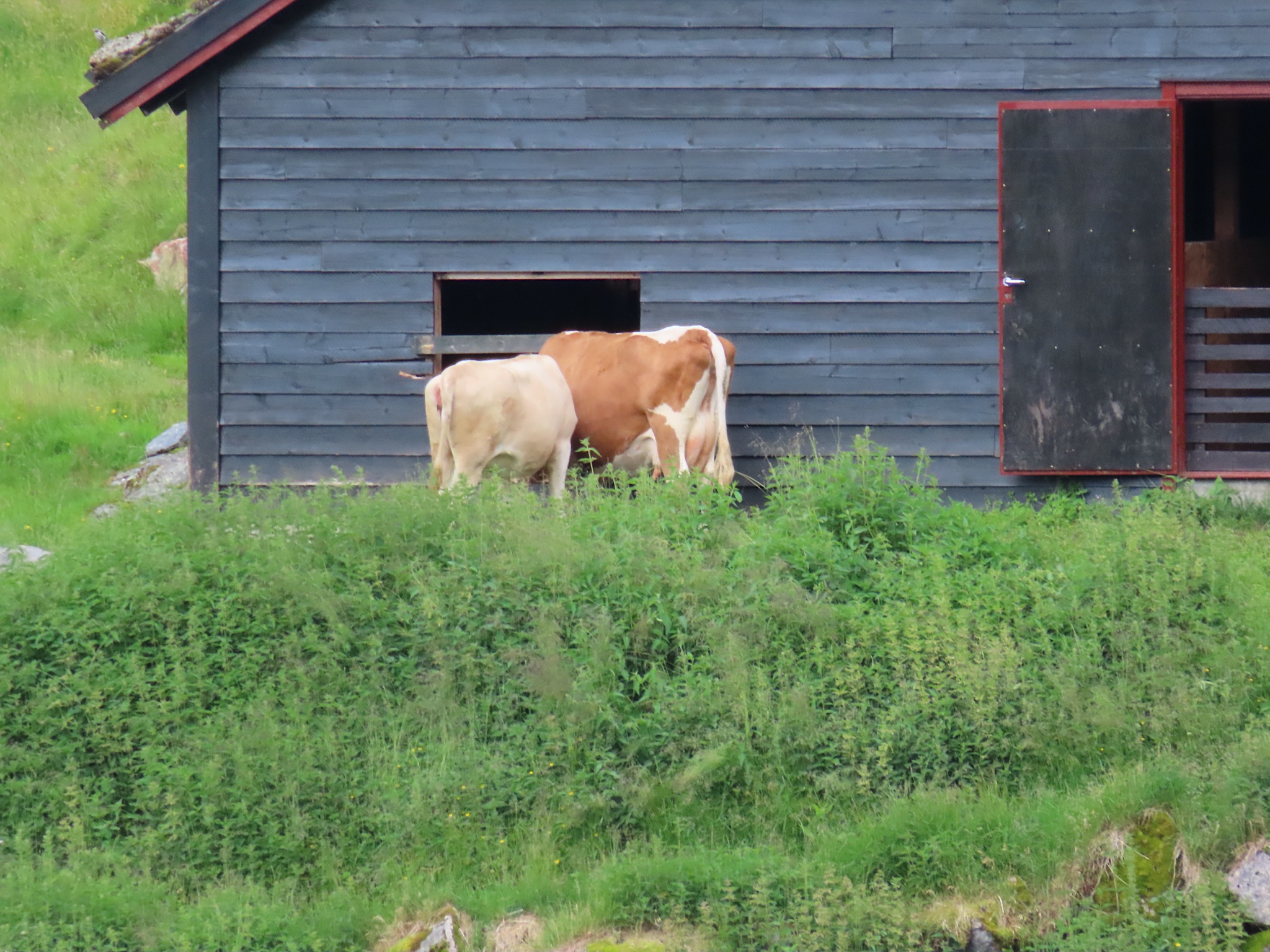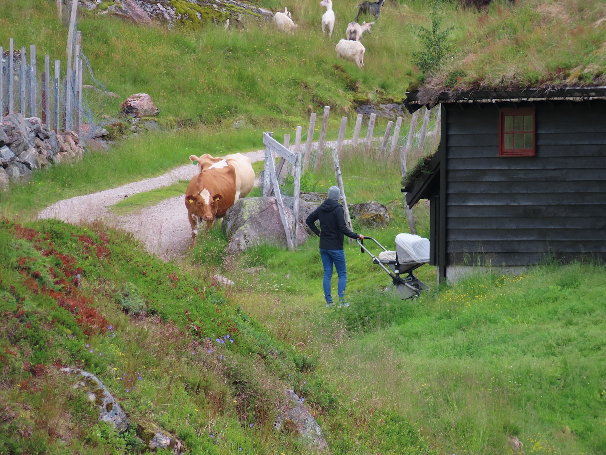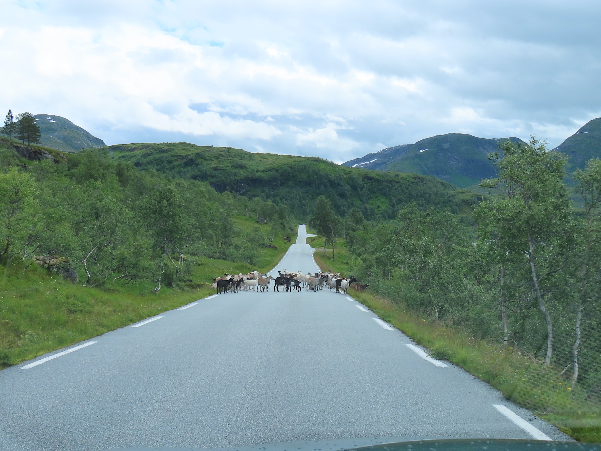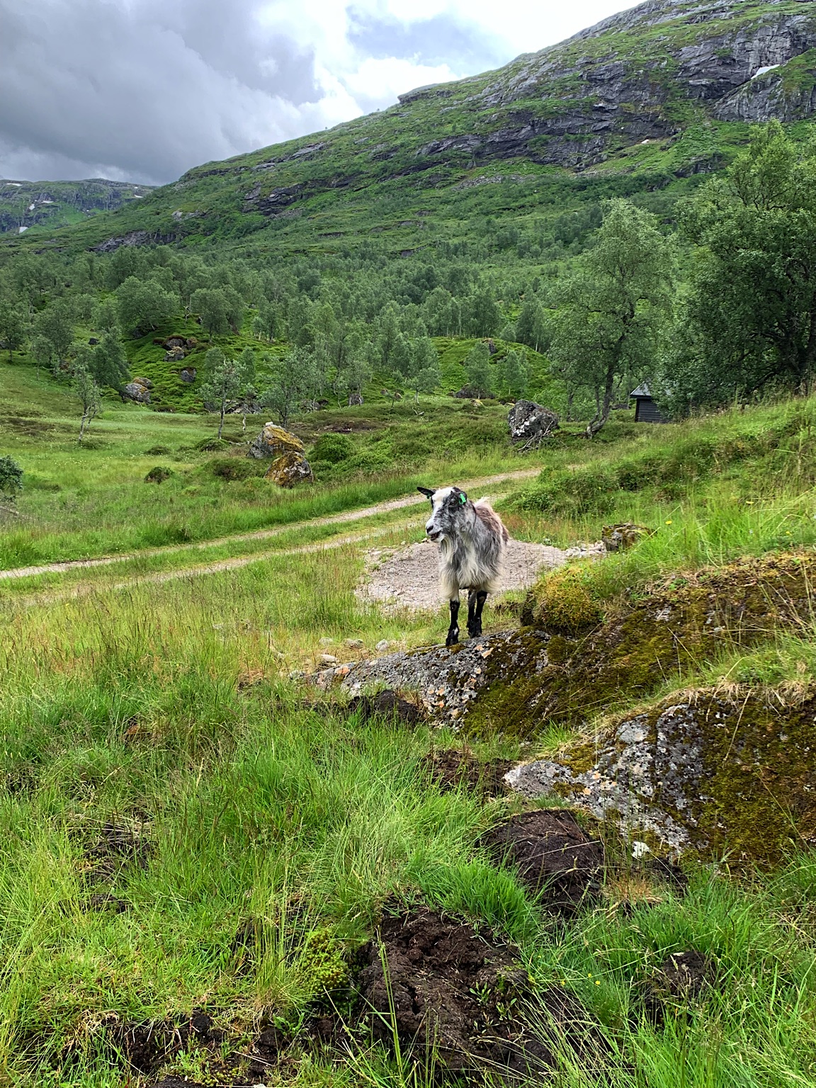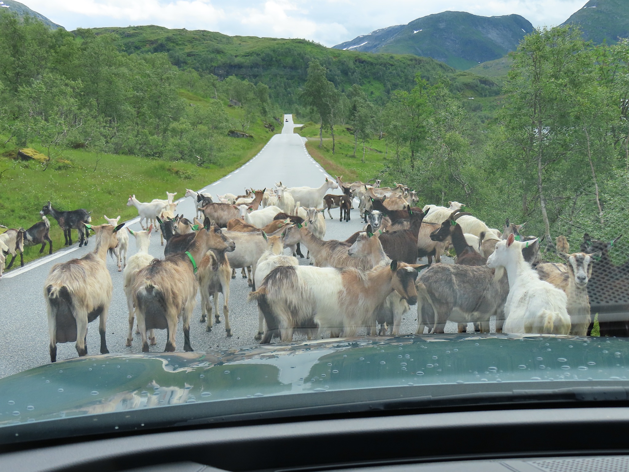 Als we weer op pad gaan komen we weer langs de geiten, ze blijken ook langzaam de weg te volgen. Na nog een stop moeten we weer langs de geiten. We komen vervolgens weer langs Flamheim en vragen Sigur of we vandaag kunnen eten. Het kan, we zijn om 19uur welkom.