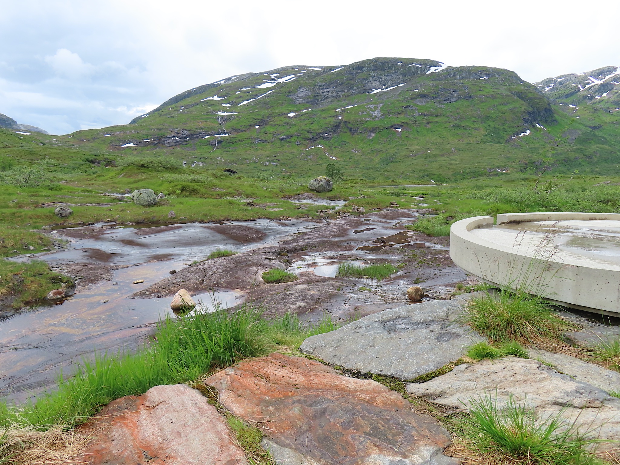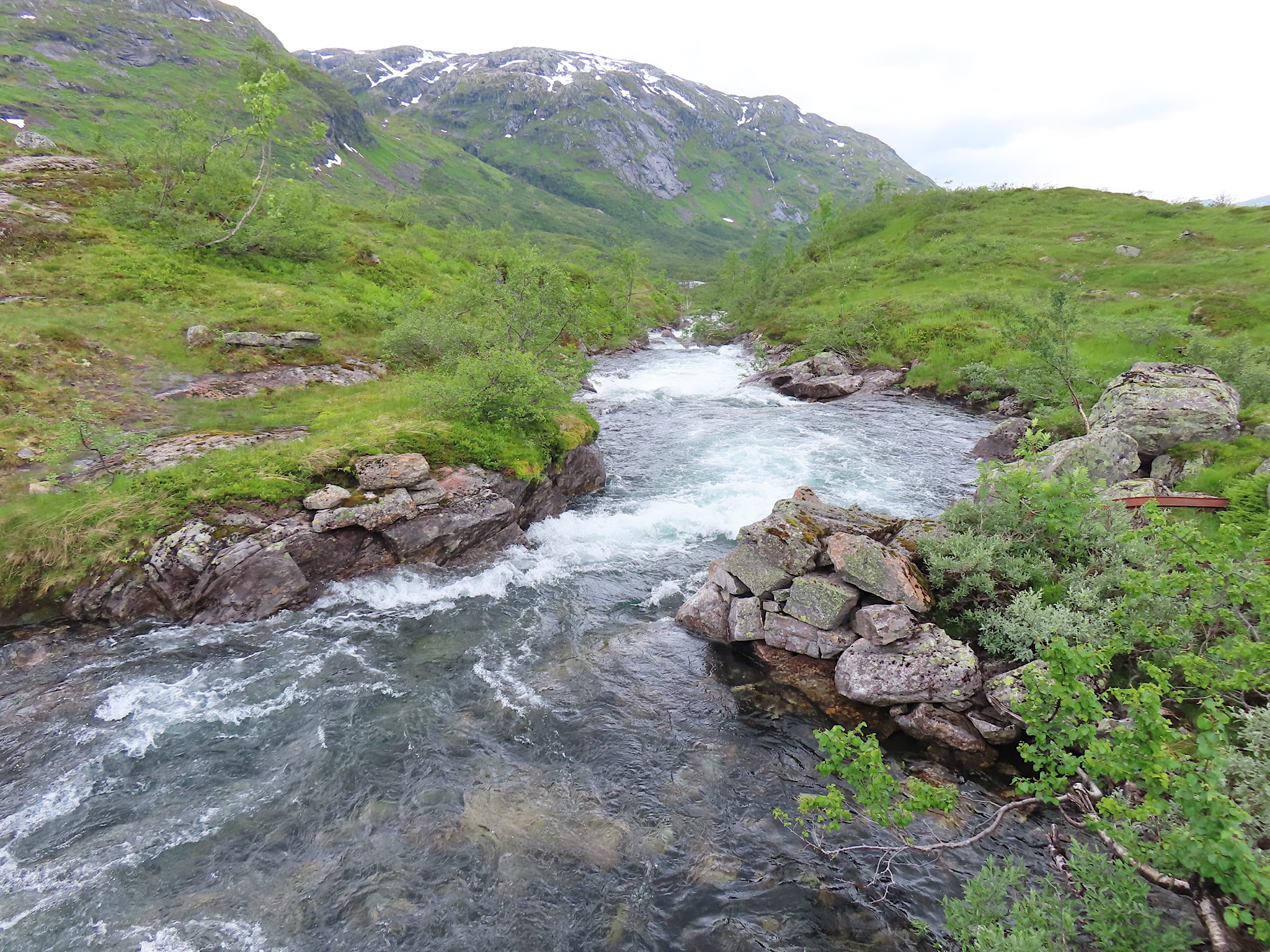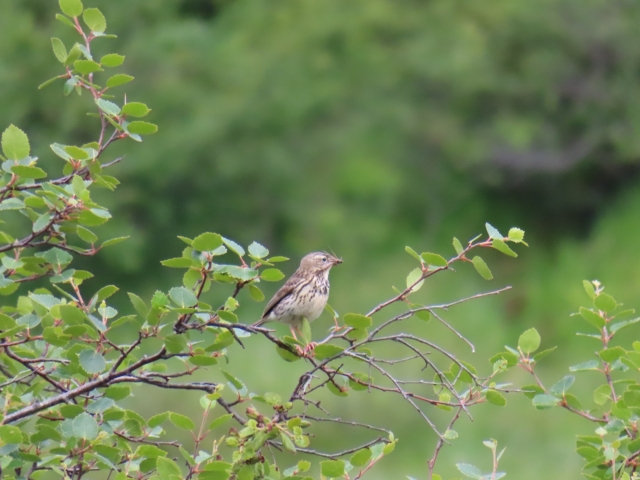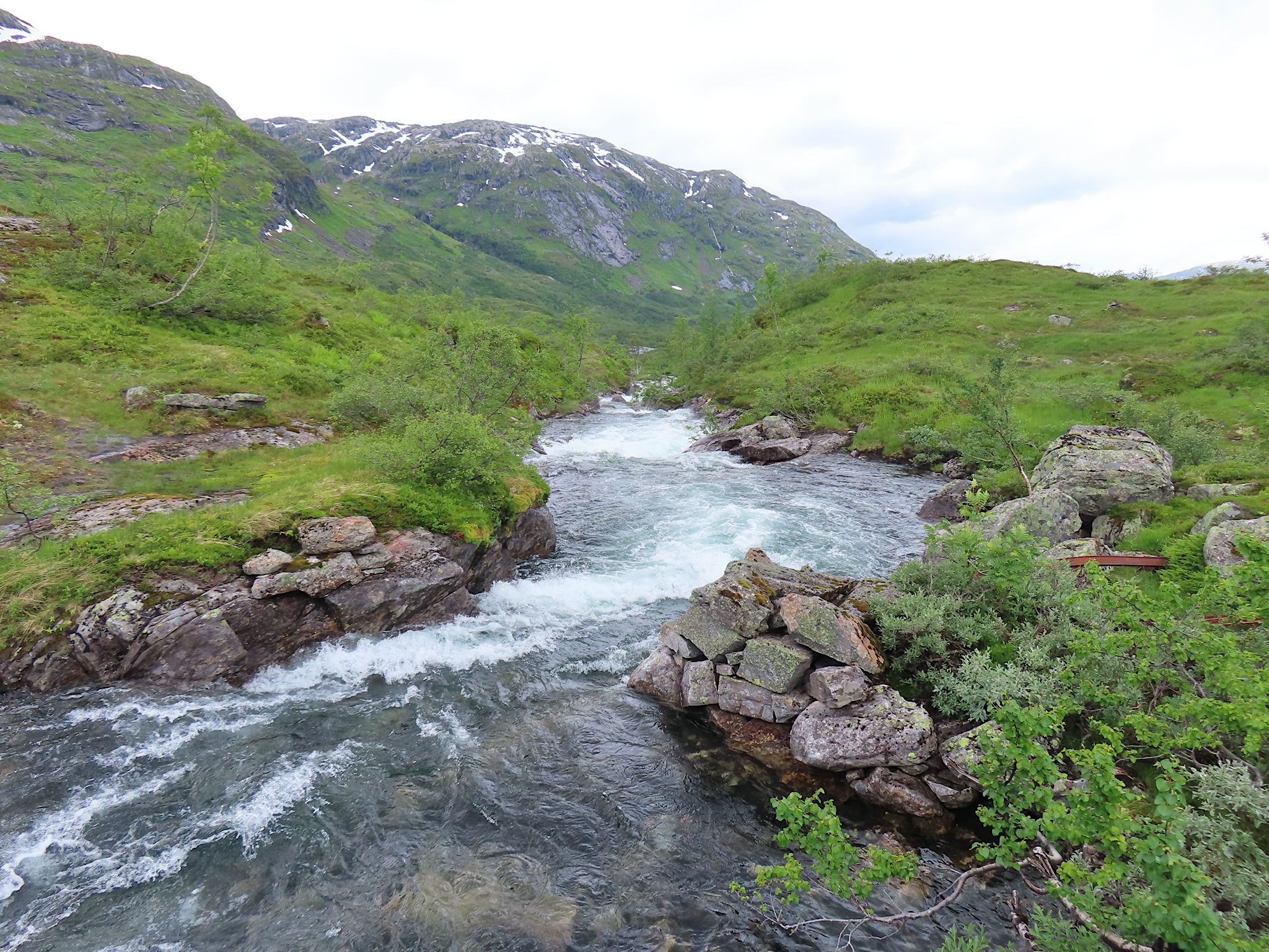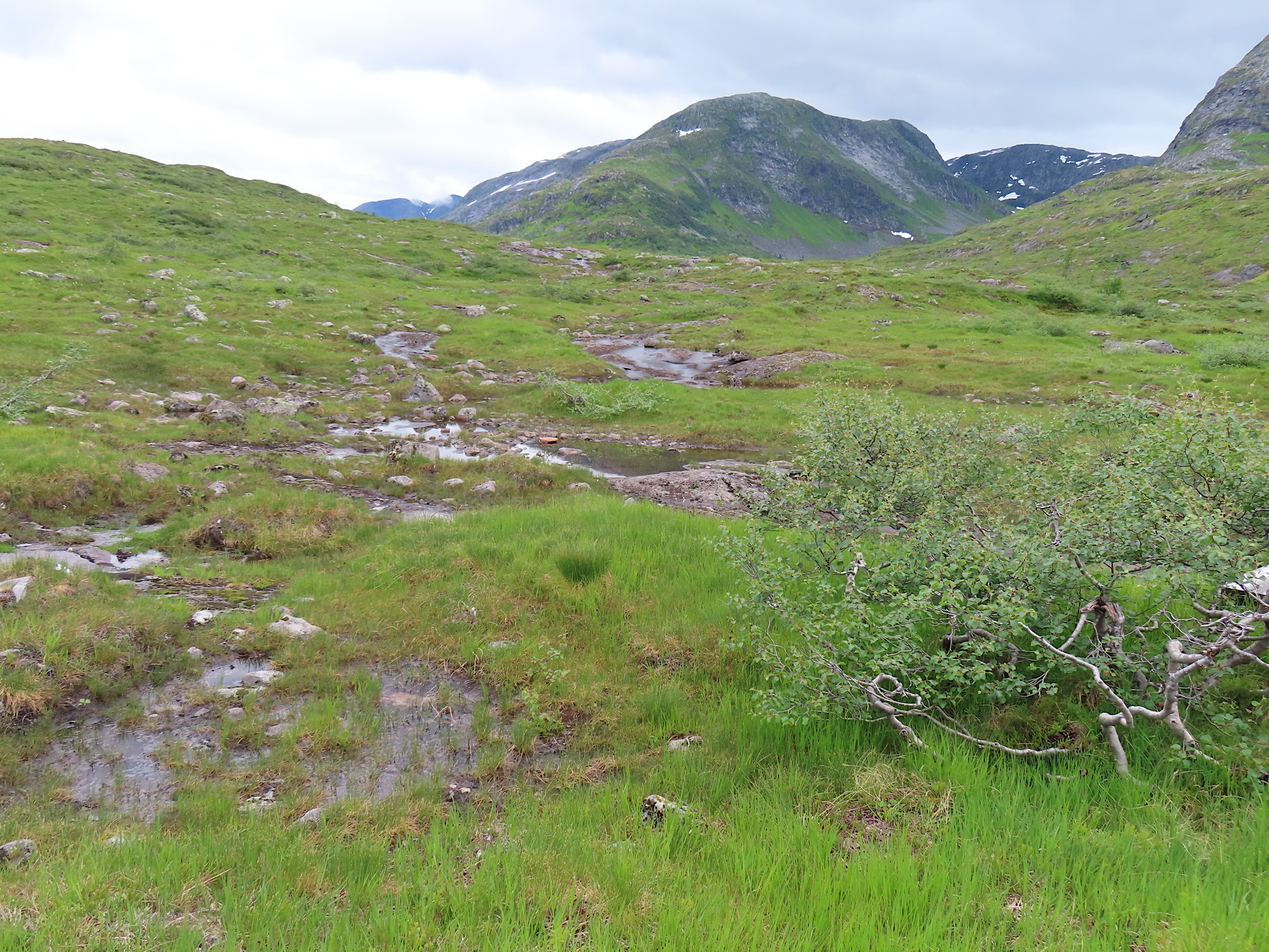 Afdalen doen we niet, dat doen we morgen omdat dit ook onze route is als we naar Røldal vertrekken. We keren dus terug. Weer langs de geiten. We stoppen vlak daarna om een stukje te wandelen. We zien veel leuke vogels waaronder enkele oranje gestipte blauwborsten en prachtige rode barmsijsjes.