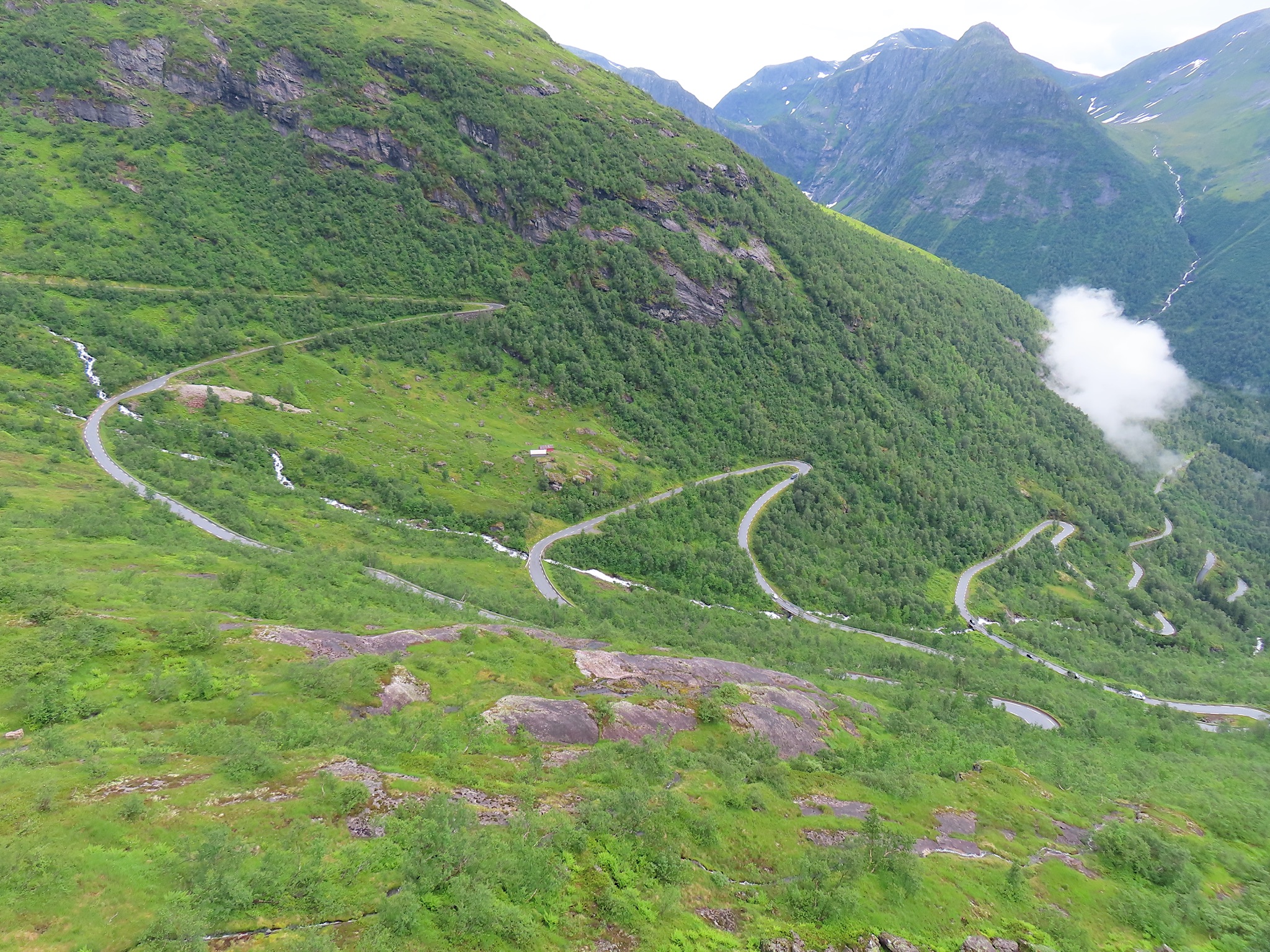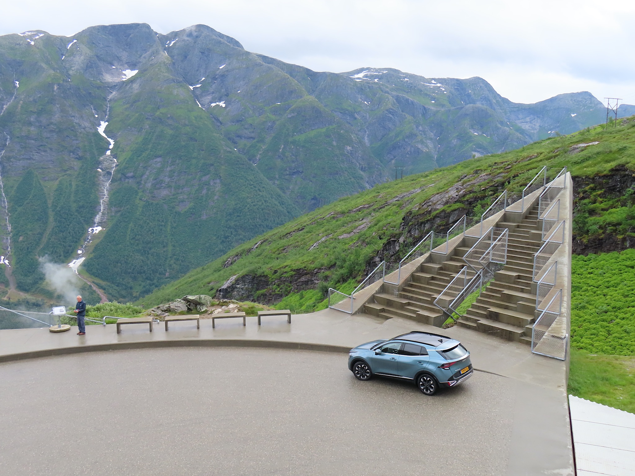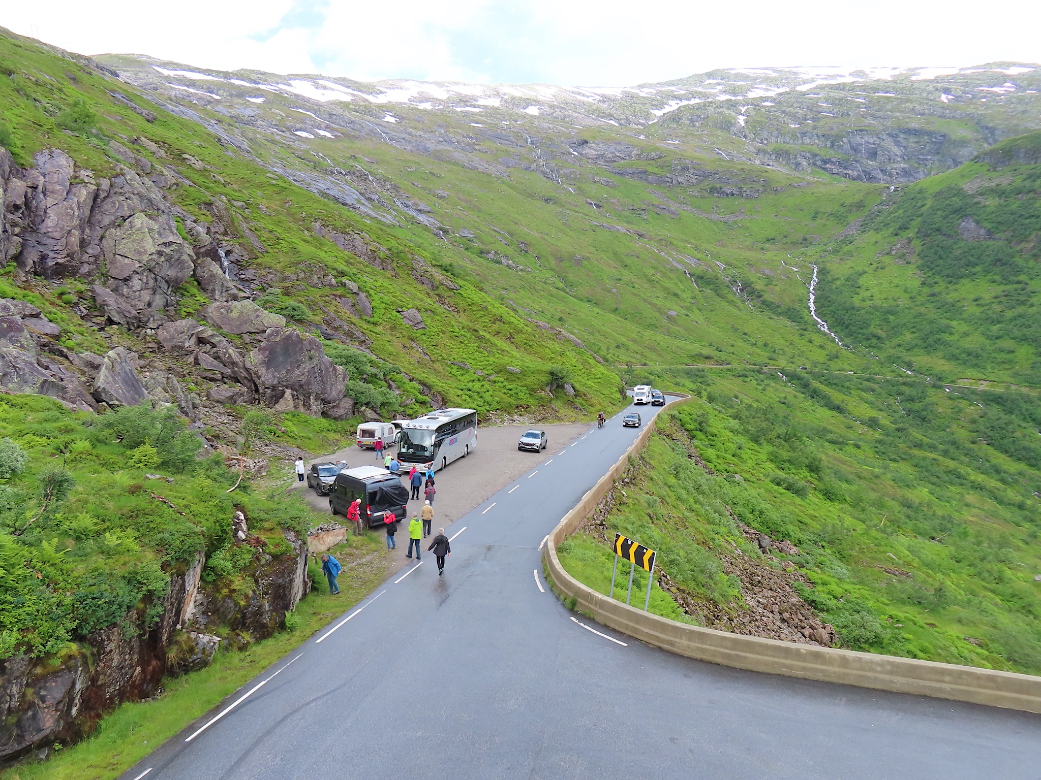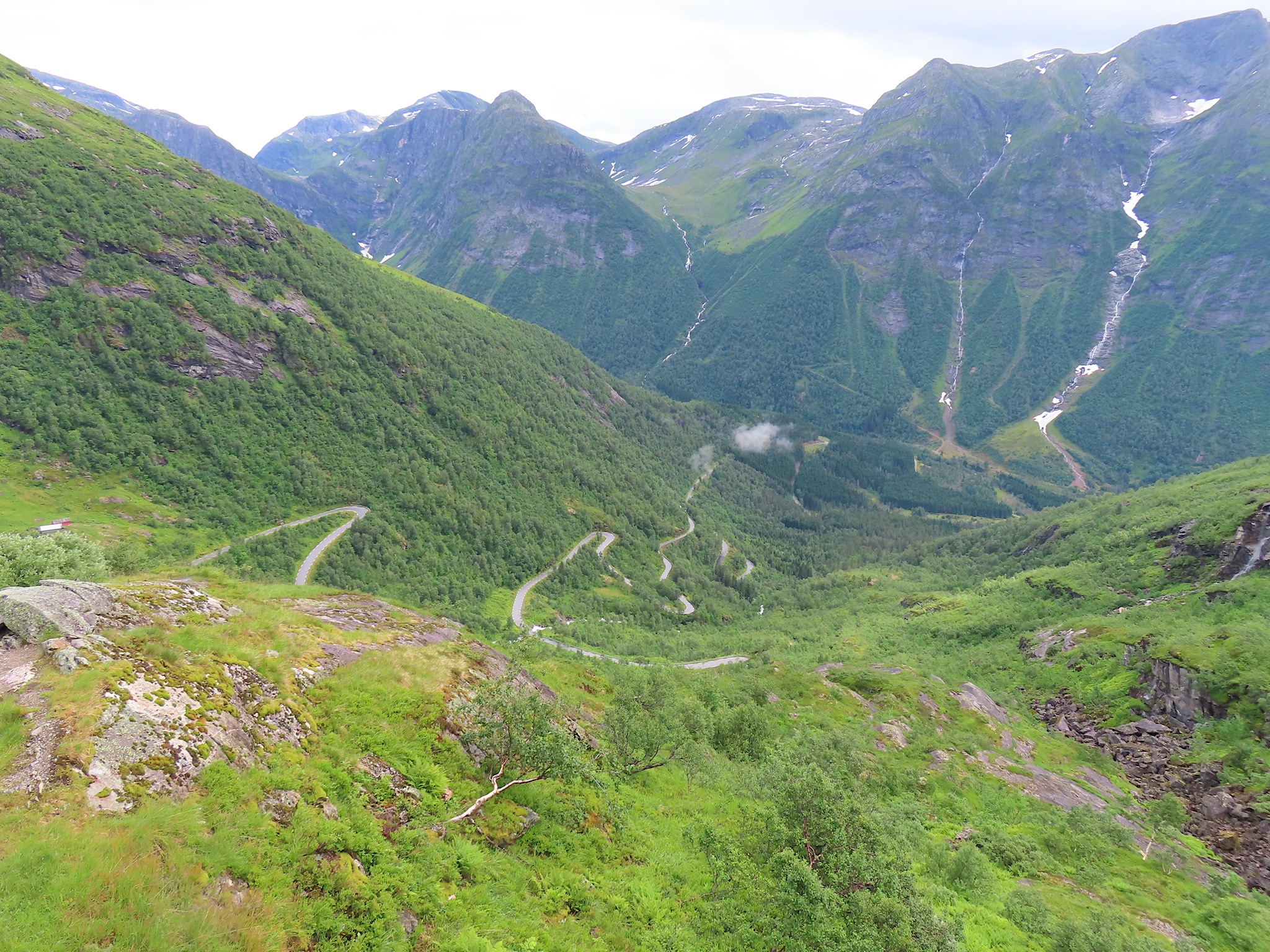 We staan wat later op. Het weer is droog met wat zon. Er wordt af en toe een bui verwacht. Tegen stappen we in de auto om naar een spectaculair uitzichtpunt te rijden. Onderweg wordt de weg geblokkeerd door een grote kudde geiten. Ze liggen heerlijk op het warme asfalt en je ziet ze denkbeeldig een grote middelvinger naar ons opsteken. Van de andere kant nadert een Finse auto. De dames stappen uit en proberen de geiten in actie te krijgen. Tineke is het meest succesvol, wij kunnen door. De Finnen staan er nog we; even zie ik in de achteruitkijkspiegel. Bij het uitzichtspunt aangekomen kijken we een dal in van 600 meter diep en zien de vele haarspelden om daar te komen. Op dat moment komen twee fietsers onder luid applaus op de top aan.