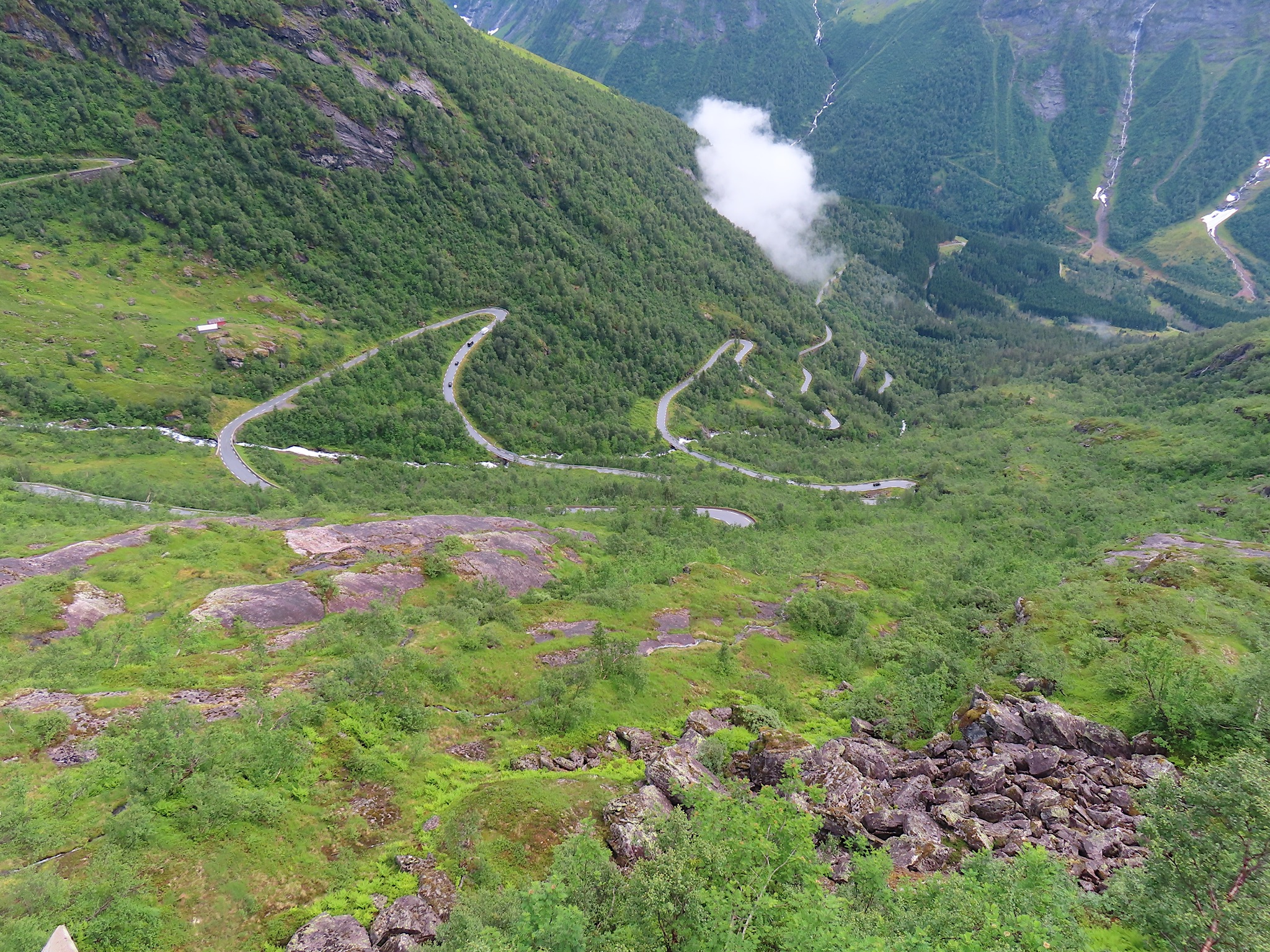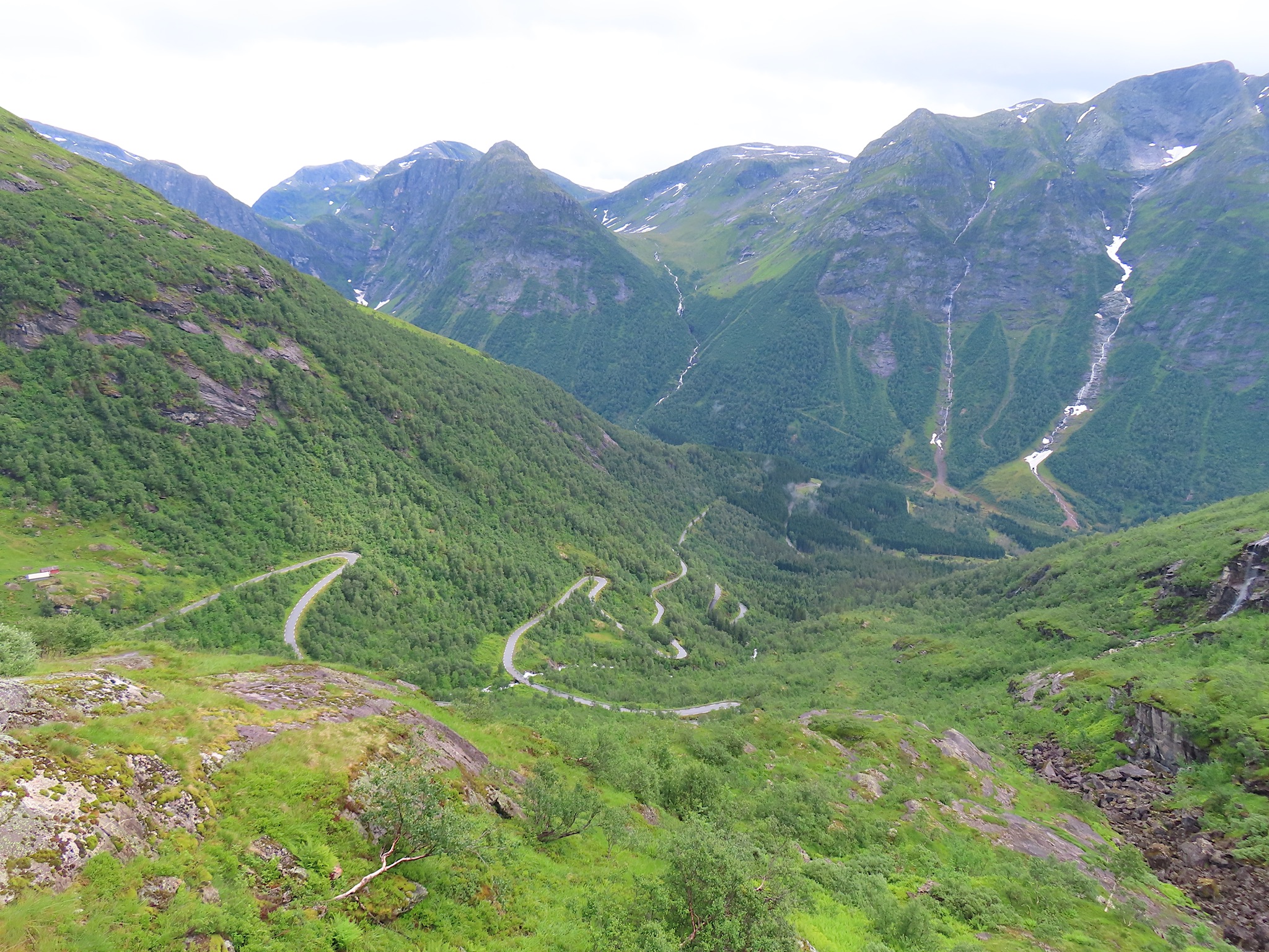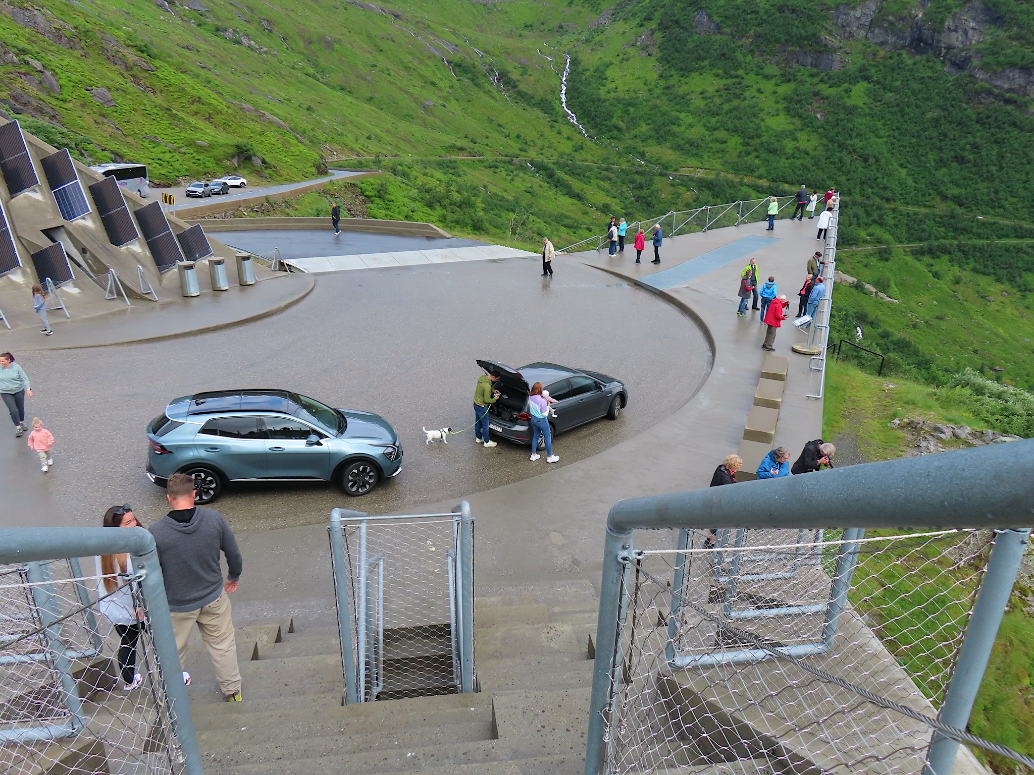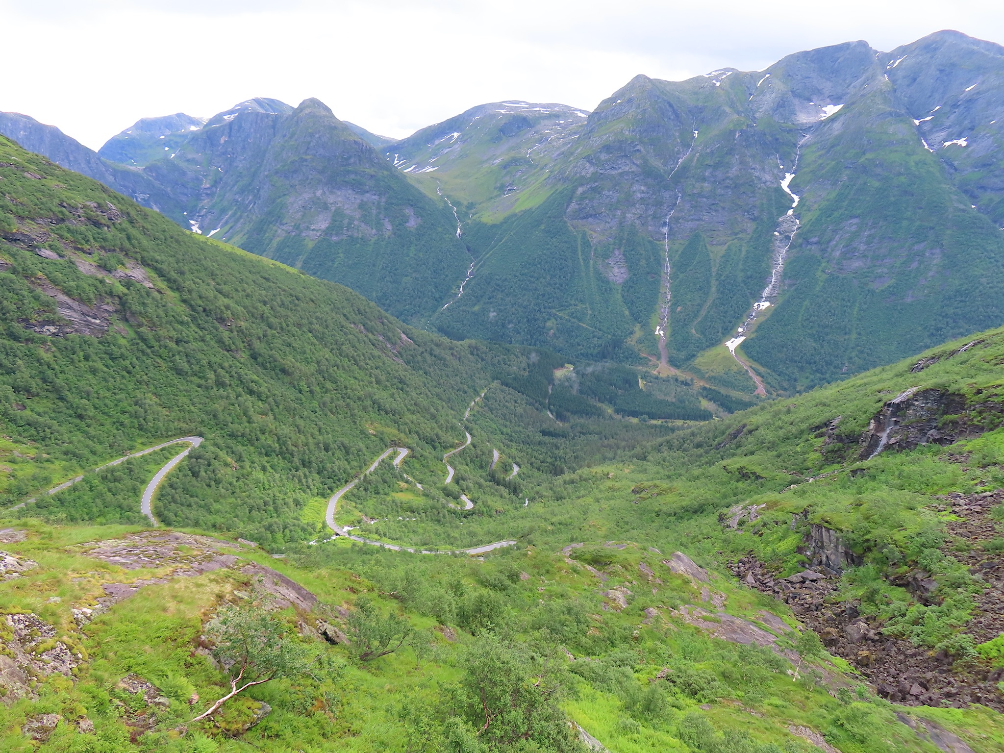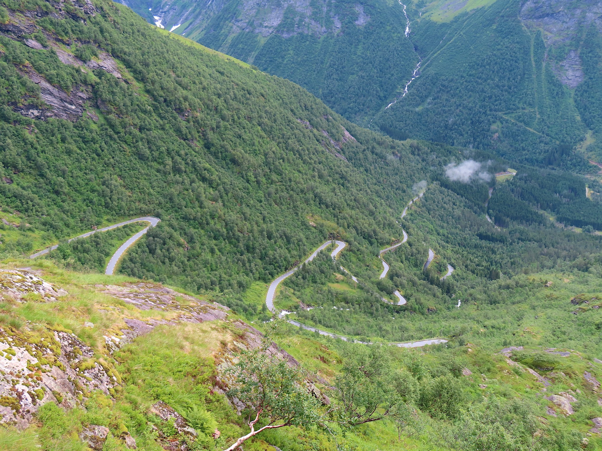We staan wat later op. Het weer is droog met wat zon. Er wordt af en toe een bui verwacht. Tegen stappen we in de auto om naar een spectaculair uitzichtpunt te rijden. Onderweg wordt de weg geblokkeerd door een grote kudde geiten. Ze liggen heerlijk op het warme asfalt en je ziet ze denkbeeldig een grote middelvinger naar ons opsteken. Van de andere kant nadert een Finse auto. De dames stappen uit en proberen de geiten in actie te krijgen. Tineke is het meest succesvol, wij kunnen door. De Finnen staan er nog we; even zie ik in de achteruitkijkspiegel. Bij het uitzichtspunt aangekomen kijken we een dal in van 600 meter diep en zien de vele haarspelden om daar te komen. Op dat moment komen twee fietsers onder luid applaus op de top aan.