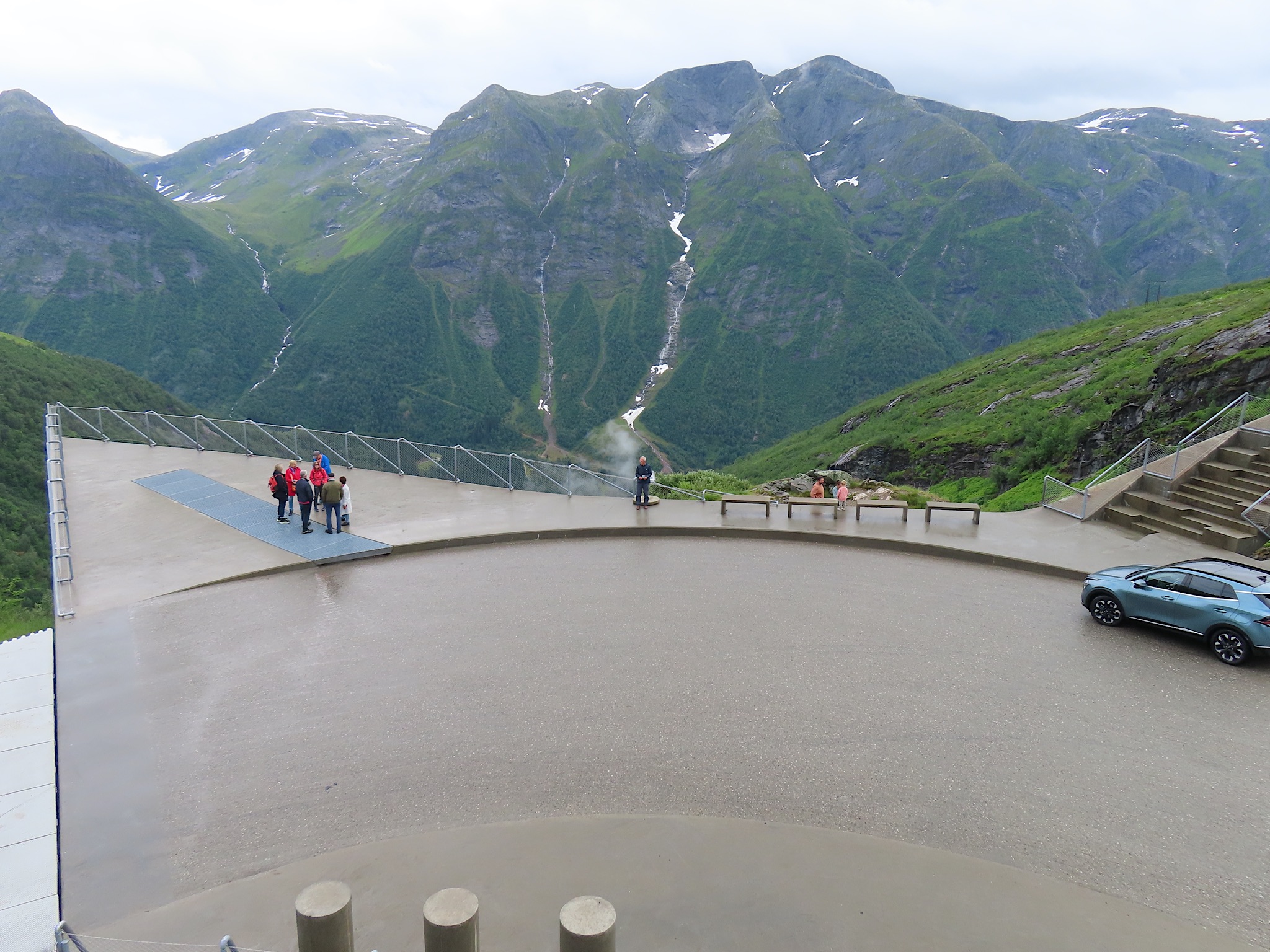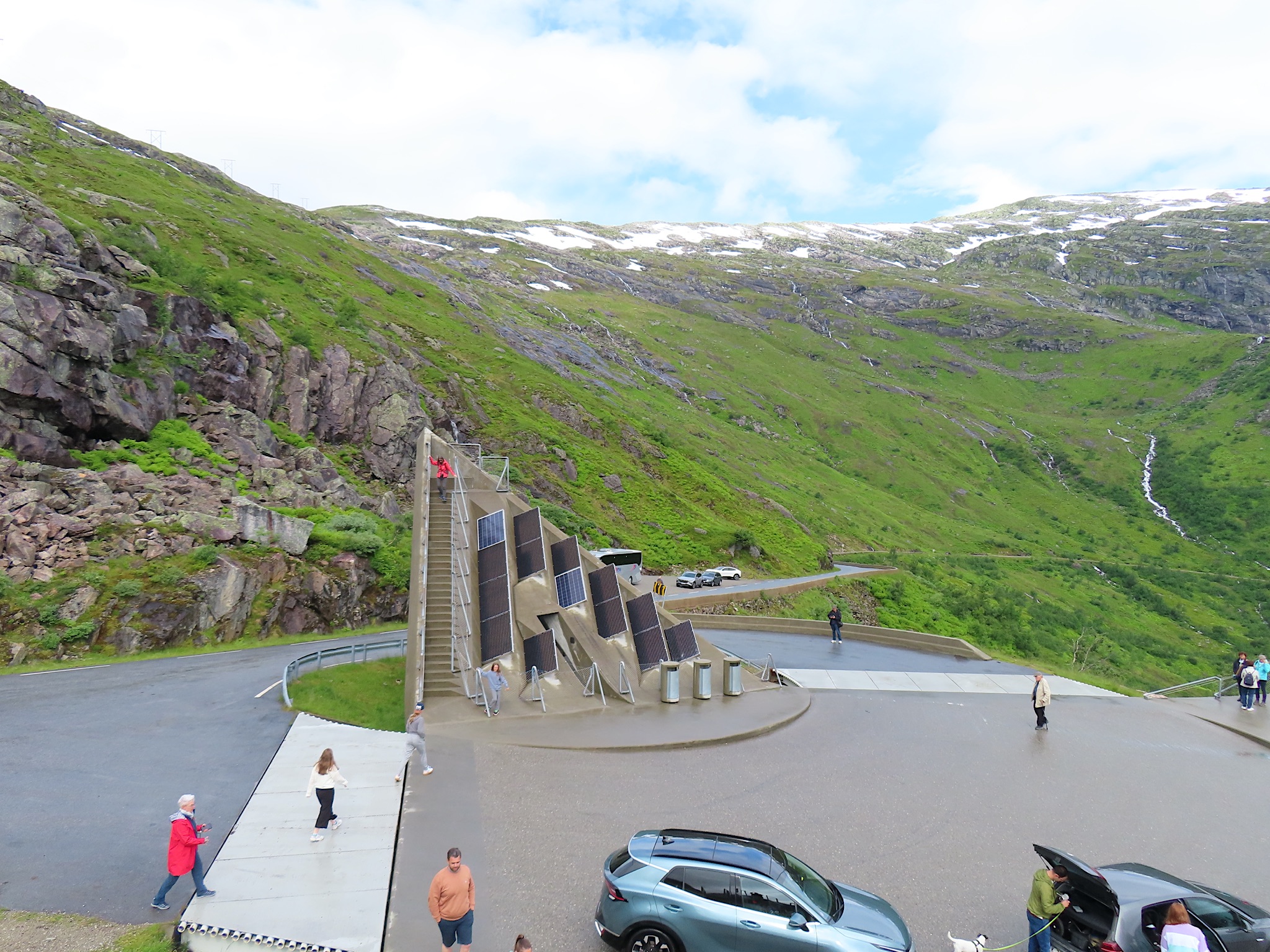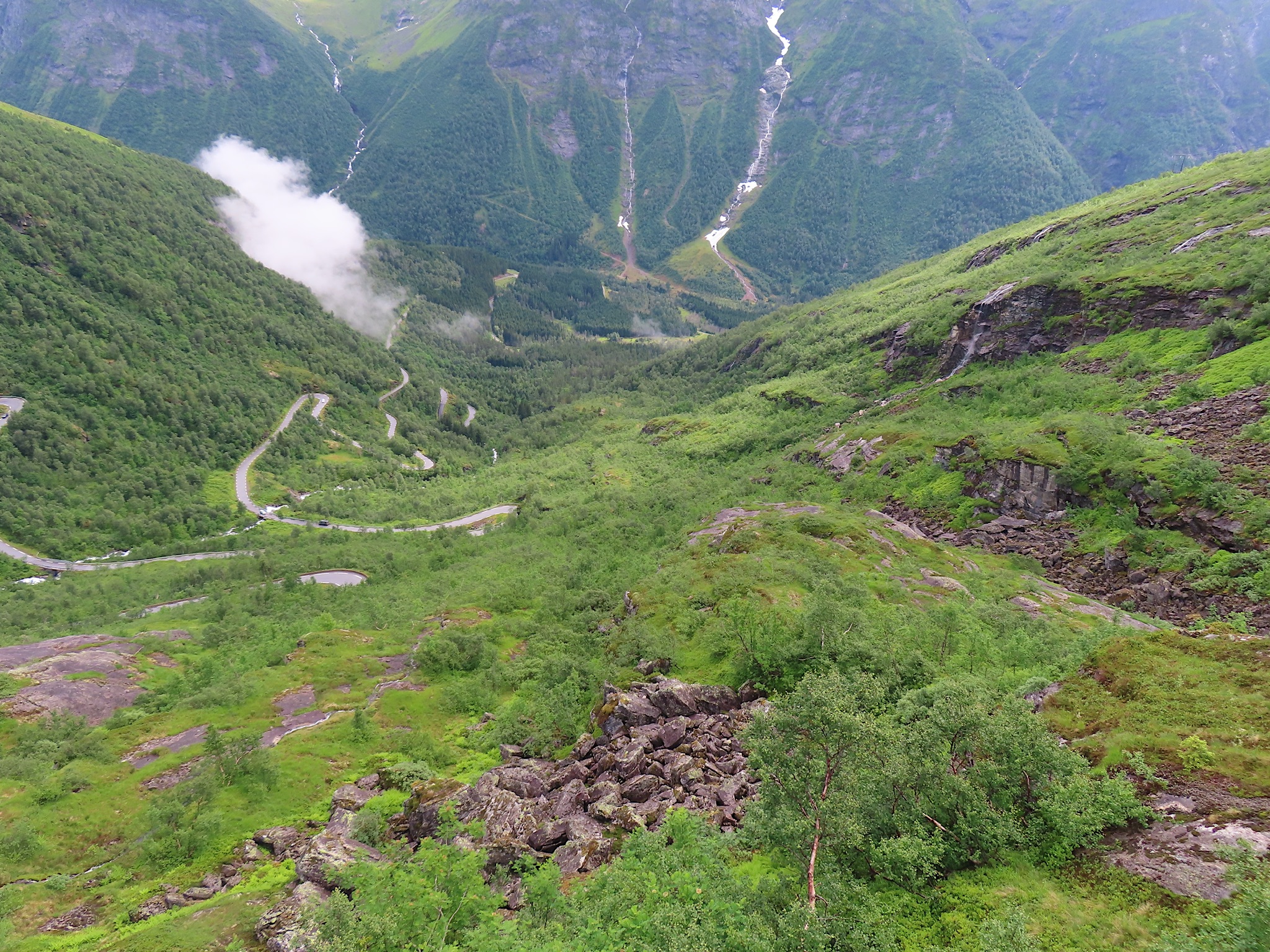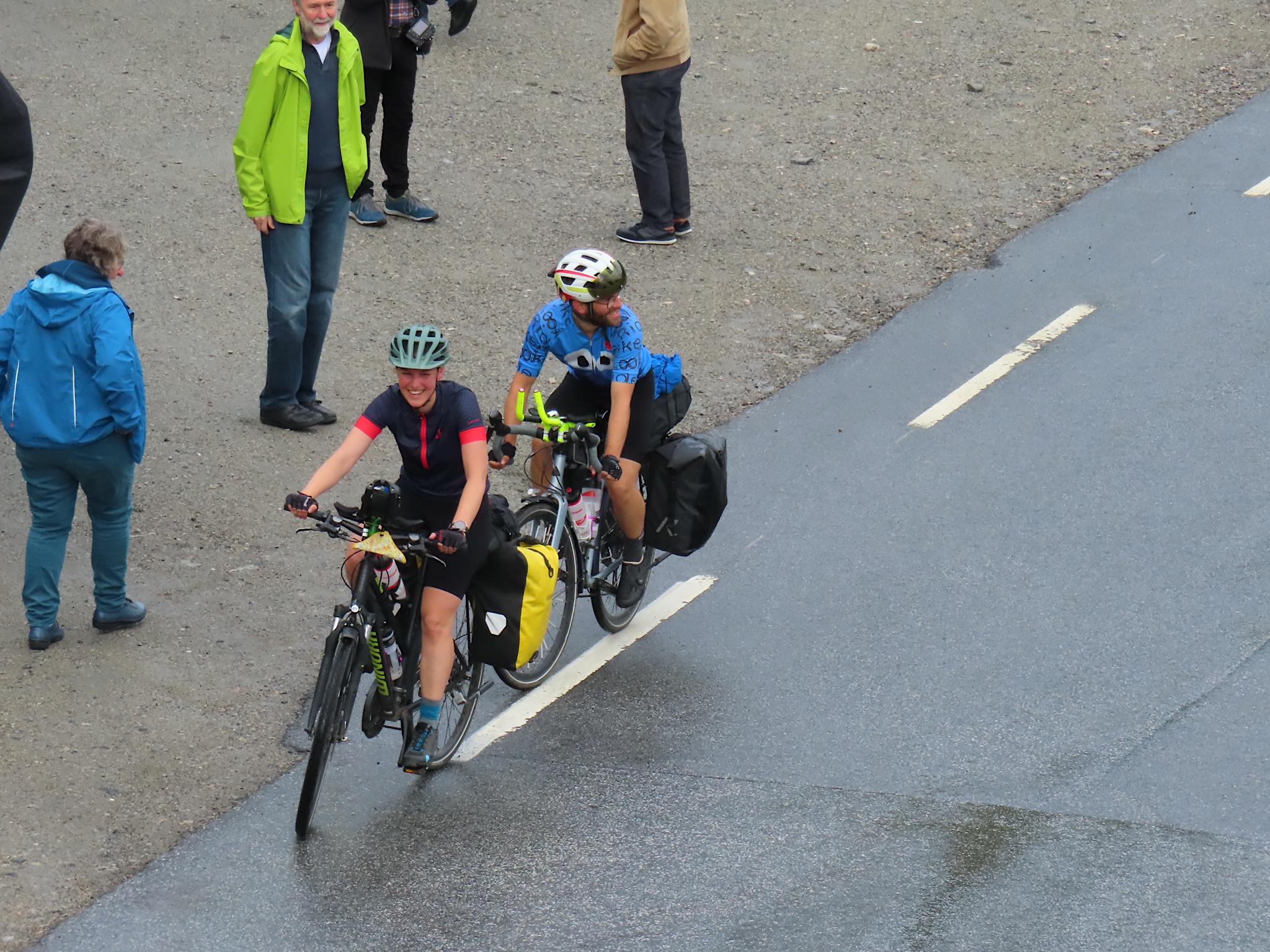 We staan wat later op. Het weer is droog met wat zon. Er wordt af en toe een bui verwacht. Tegen stappen we in de auto om naar een spectaculair uitzichtpunt te rijden. Onderweg wordt de weg geblokkeerd door een grote kudde geiten. Ze liggen heerlijk op het warme asfalt en je ziet ze denkbeeldig een grote middelvinger naar ons opsteken. Van de andere kant nadert een Finse auto. De dames stappen uit en proberen de geiten in actie te krijgen. Tineke is het meest succesvol, wij kunnen door. De Finnen staan er nog we; even zie ik in de achteruitkijkspiegel. Bij het uitzichtspunt aangekomen kijken we een dal in van 600 meter diep en zien de vele haarspelden om daar te komen. Op dat moment komen twee fietsers onder luid applaus op de top aan.