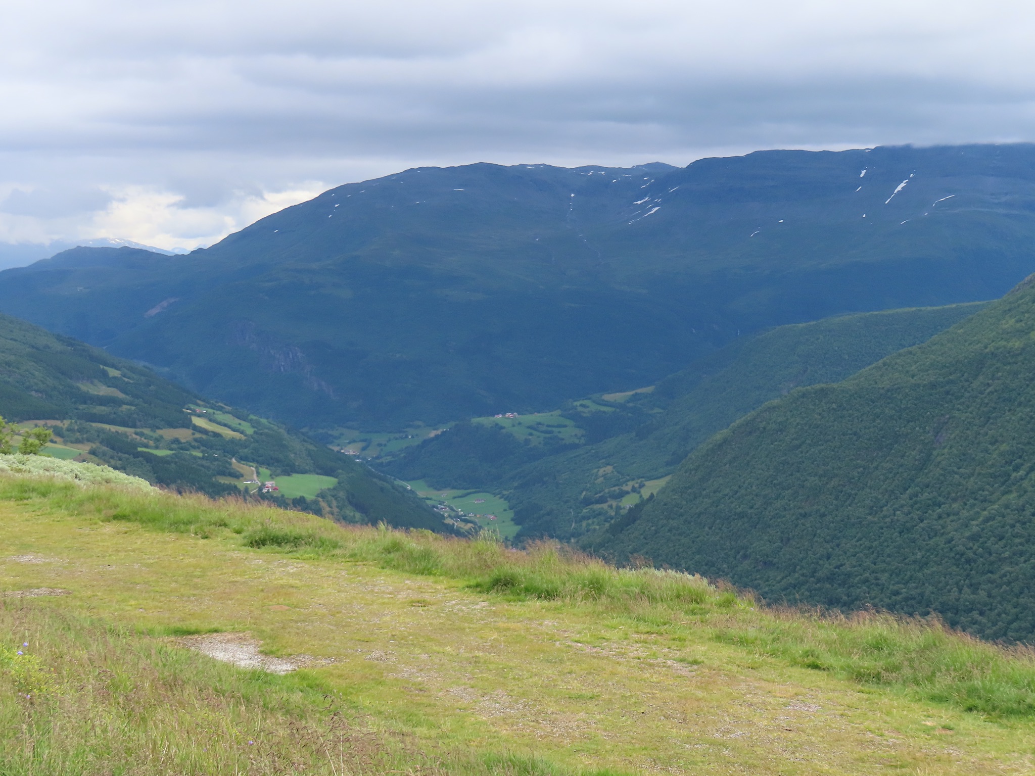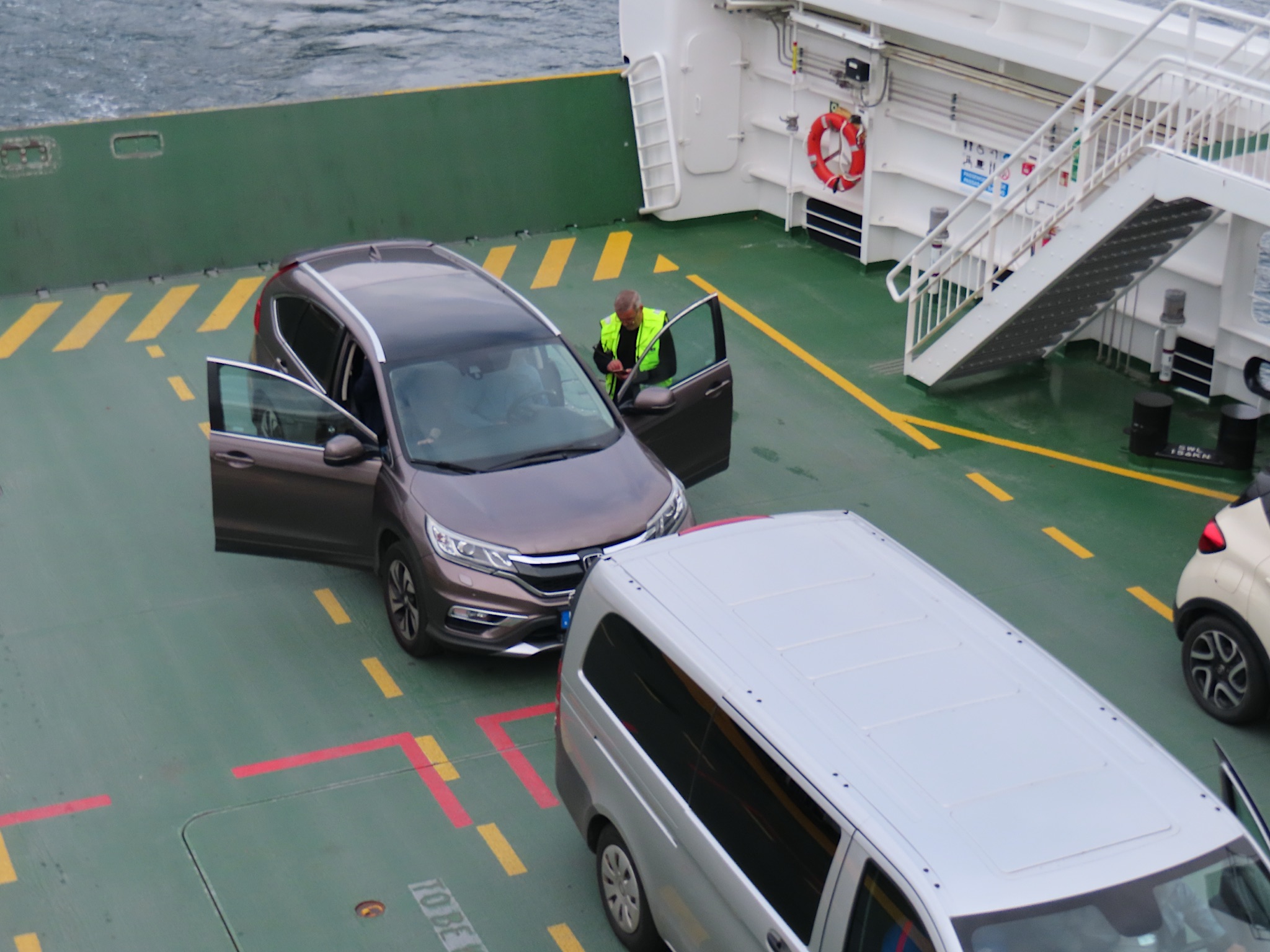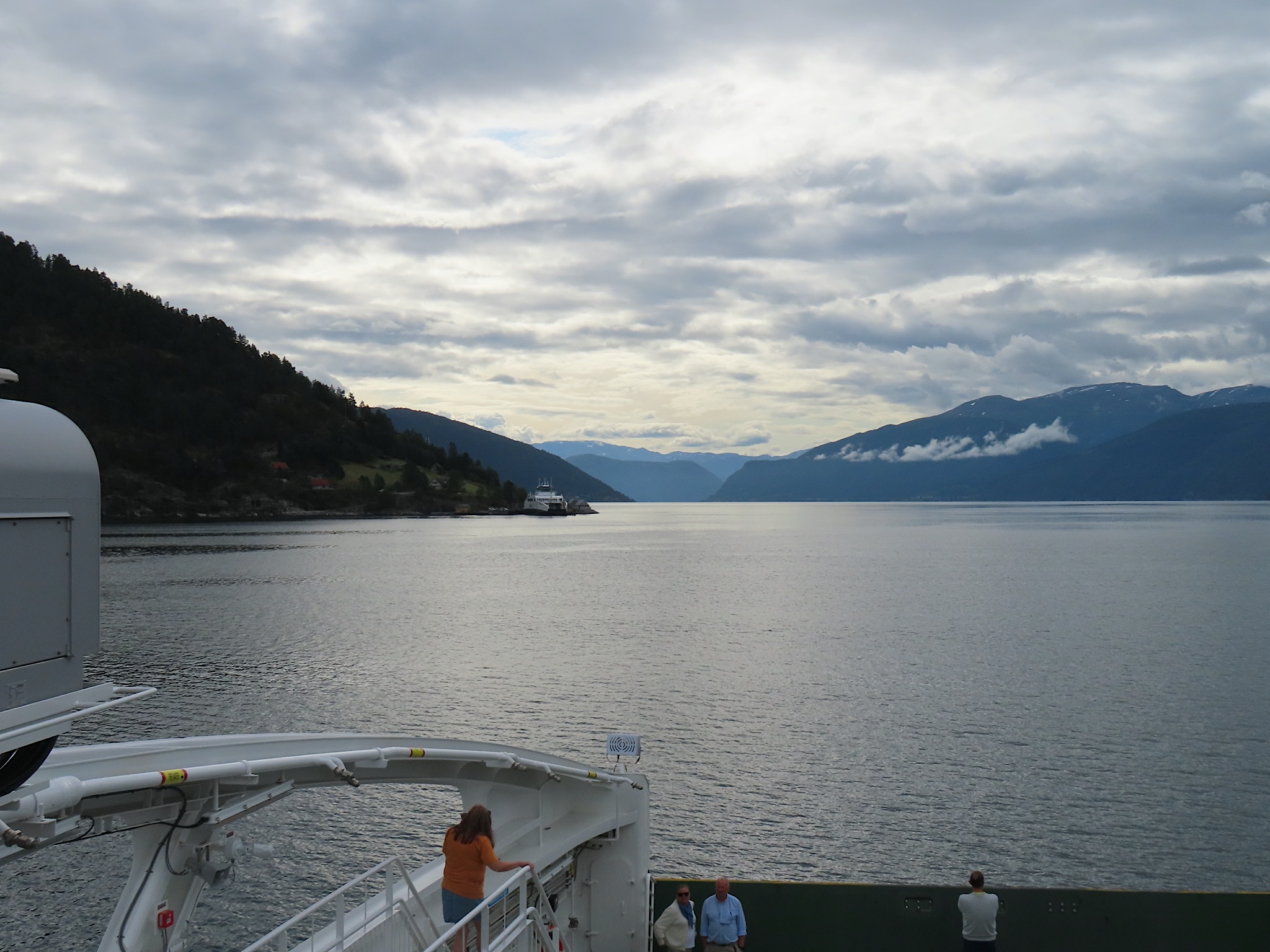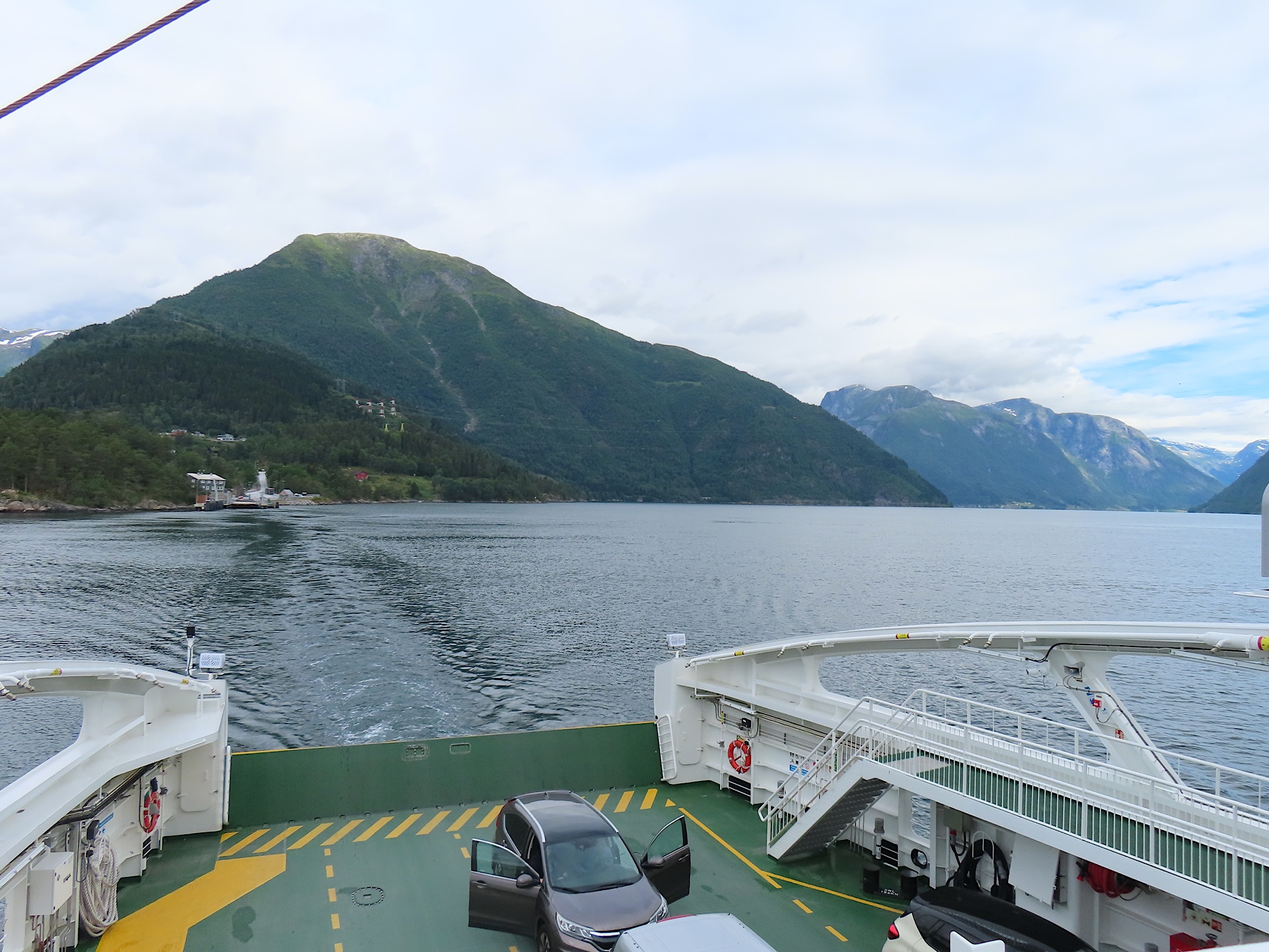 Als alles ingepakt is vetrekken we tegen negenen uit de hut in Hov. Het spettert een beetje maar het zicht is goed. We rijden via het gisteren al bezocht Gaularfjellter Utsikten naar het het driehoekspontje over de Sognefjord Dragsvik – Hella – Vangsnes. De afdaling met 9 haarpinnen en regeneratie op volle kracht zorgt ervoor dat de batterij van de auto van 17% naar 35% wordt opgeladen. Da’s mooi toch.