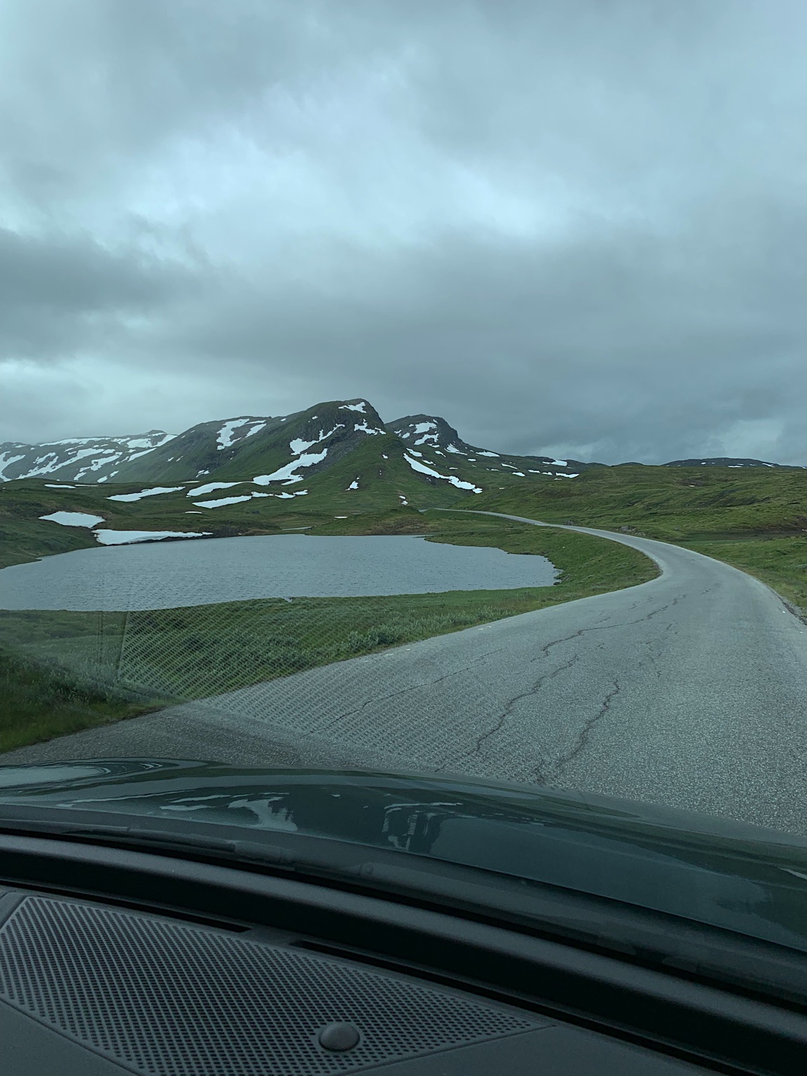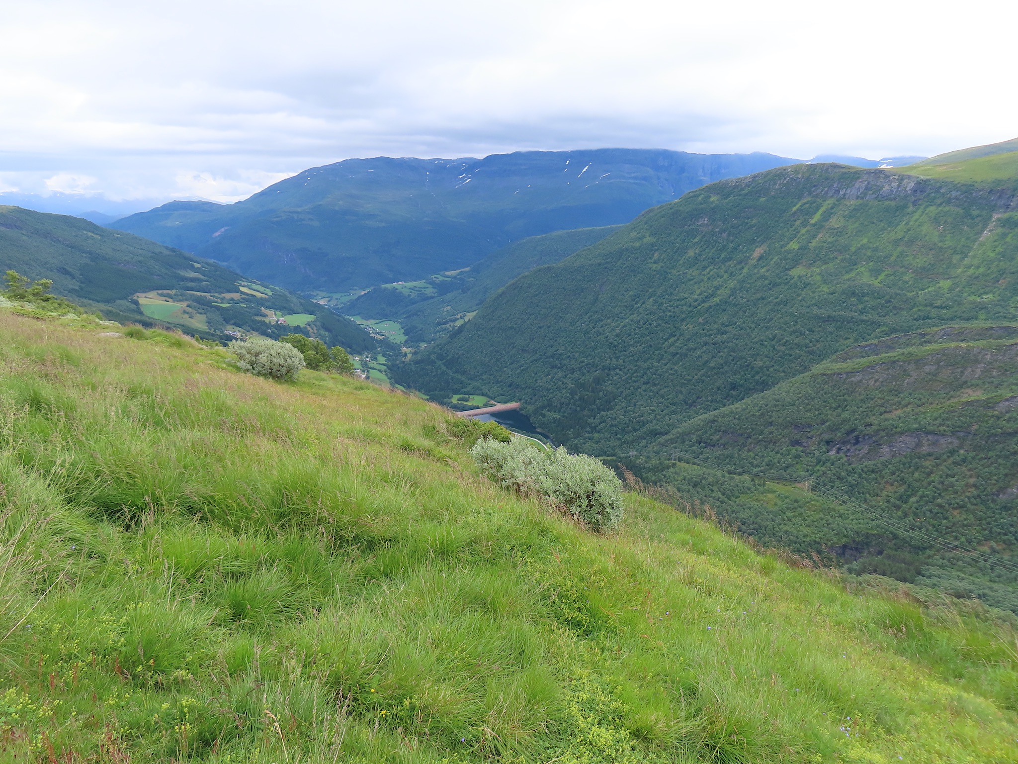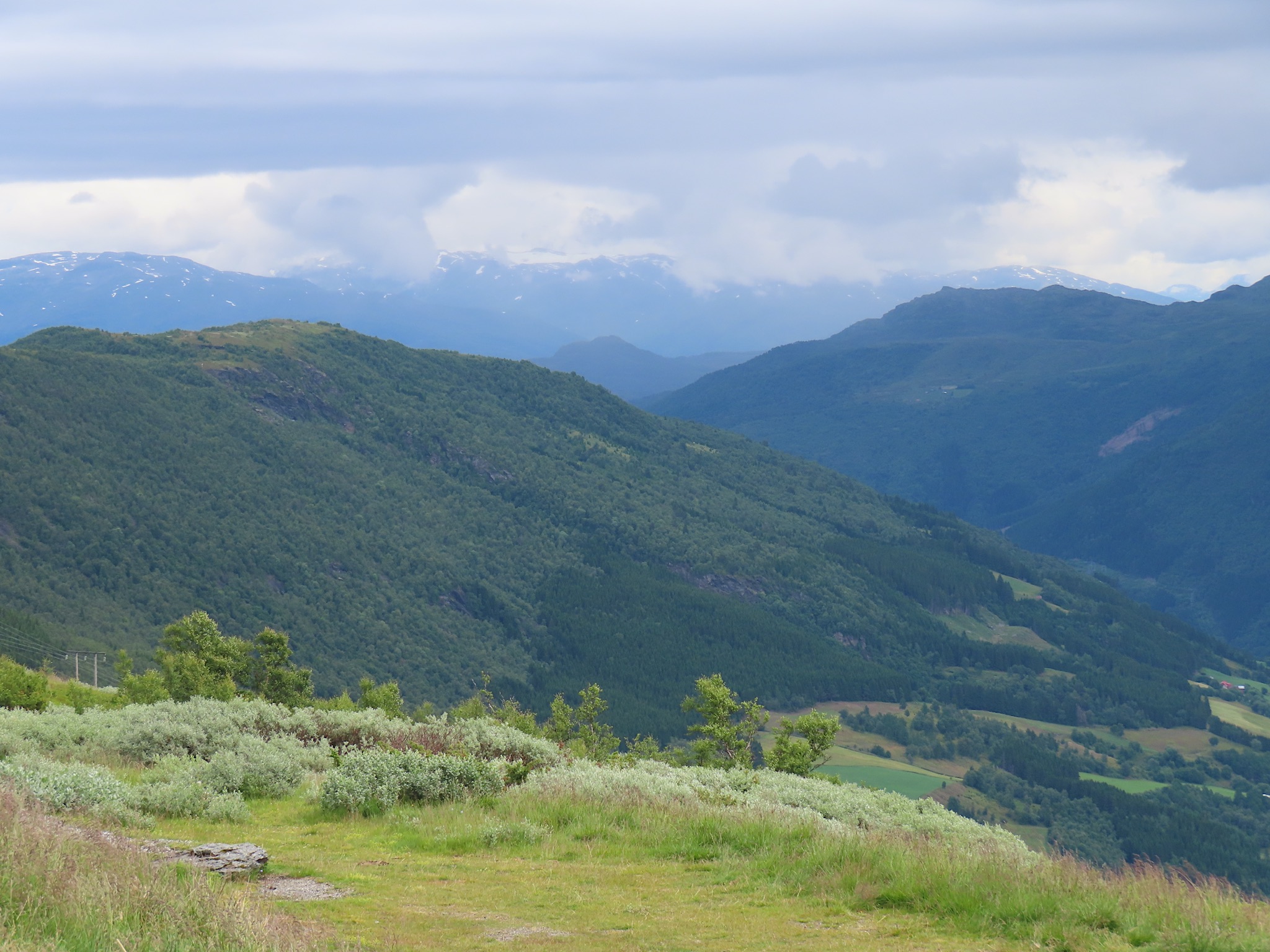 Als alles ingepakt is vetrekken we tegen negenen uit de hut in Hov. Het spettert een beetje maar het zicht is goed. We rijden via het gisteren al bezocht Gaularfjellter Utsikten naar het het driehoekspontje over de Sognefjord Dragsvik – Hella – Vangsnes. De afdaling met 9 haarpinnen en regeneratie op volle kracht zorgt ervoor dat de batterij van de auto van 17% naar 35% wordt opgeladen. Da’s mooi toch.