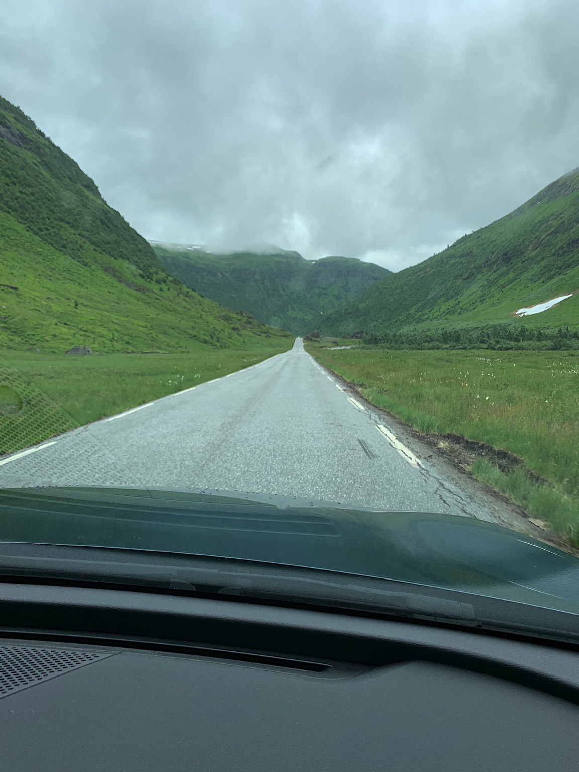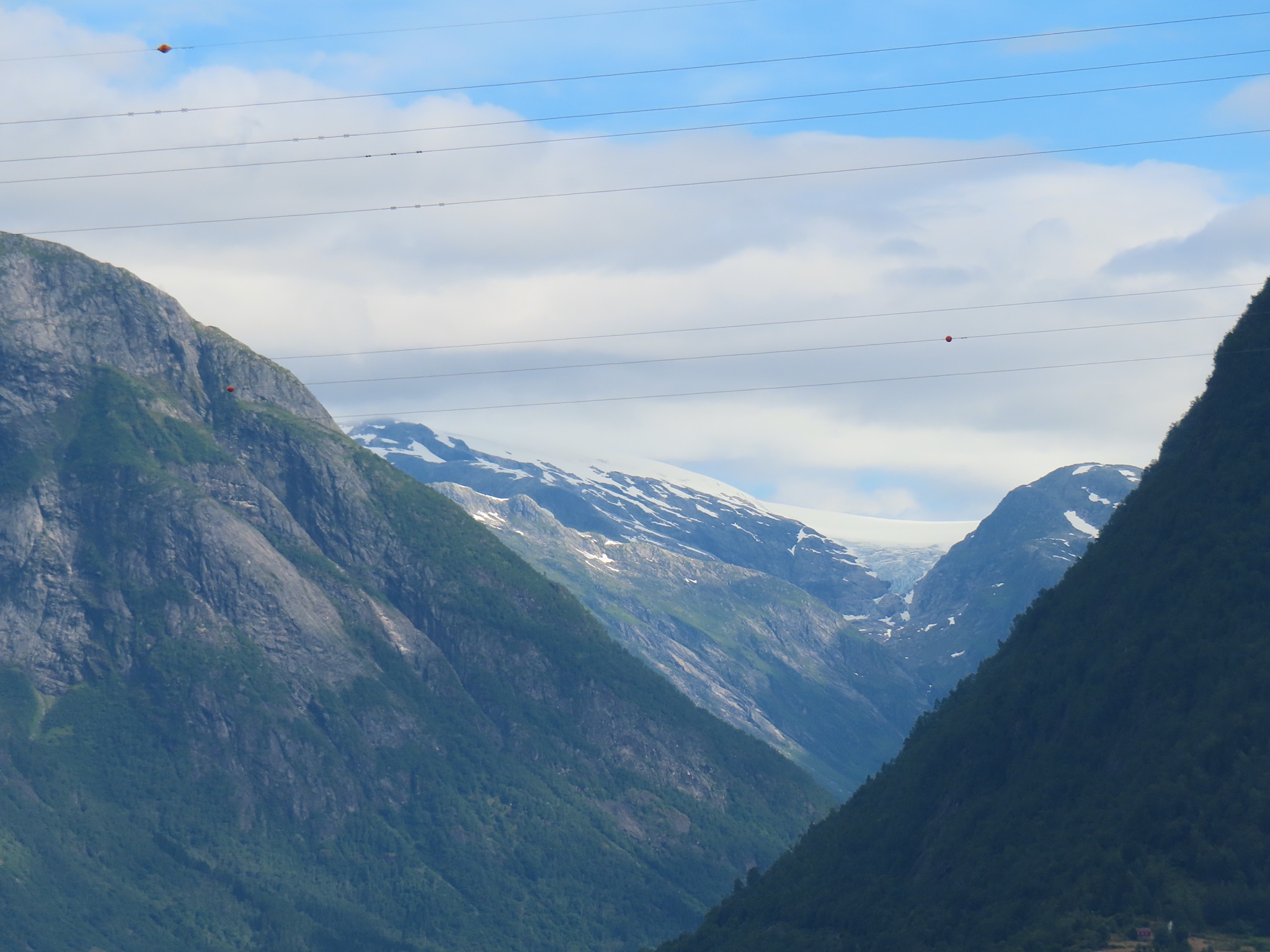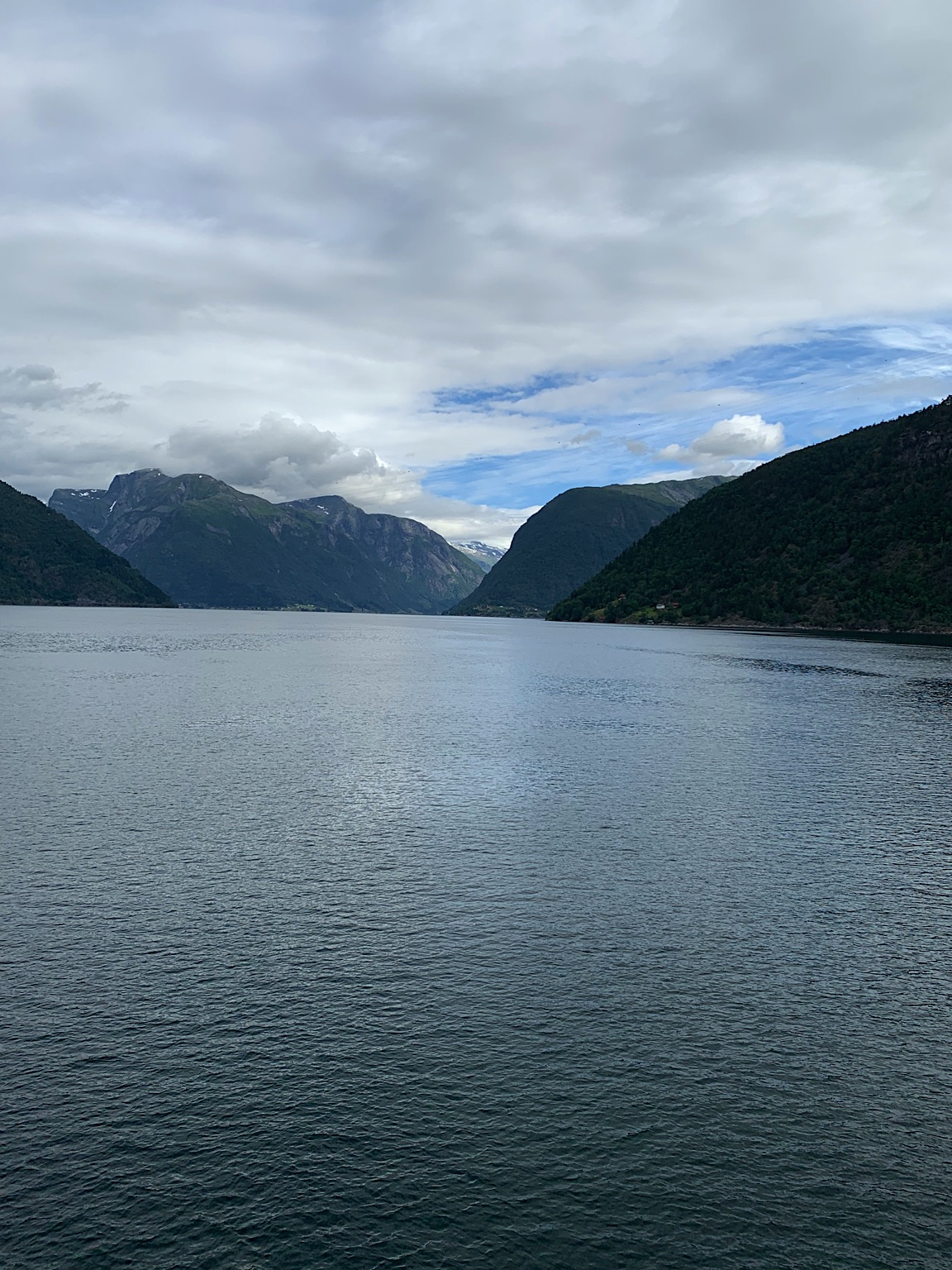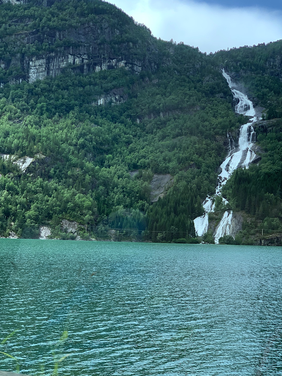 Als alles ingepakt is vetrekken we tegen negenen uit de hut in Hov. Het spettert een beetje maar het zicht is goed. We rijden via het gisteren al bezocht Gaularfjellter Utsikten naar het het driehoekspontje over de Sognefjord Dragsvik – Hella – Vangsnes. De afdaling met 9 haarpinnen en regeneratie op volle kracht zorgt ervoor dat de batterij van de auto van 17% naar 35% wordt opgeladen. Da’s mooi toch.