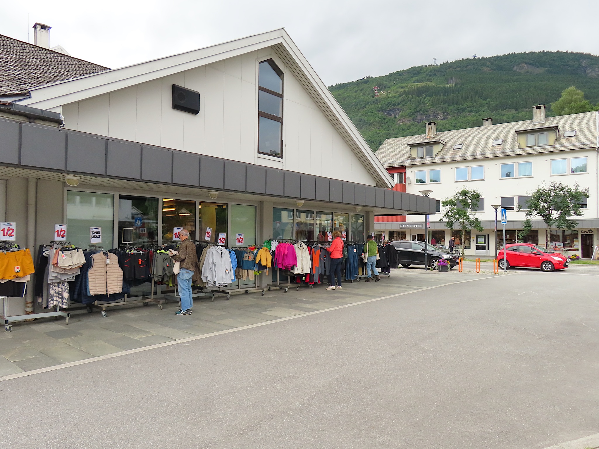 In Dragsvik op de pont naar Vangnes. Eerst legt de pont aan in Hella daar moeten we van de pont af  en meteen er weer op rijden. Dan varen we door naar Vangnes. Het begint daar harder te regenen. We zetten koers naar Vossevangen, daar waar we al eerder. Ook nu stoppen we daar en zetten we de auto aan de sneloplader. We lunchen en winkelen ruim een uur. Ik koop, in de uitverkoop natuurlijk, een praktische Summit of Norway hikingbukse (broek). Nog ff lags de Esso voor een sanitaire stop en door gaat het richting Odda.