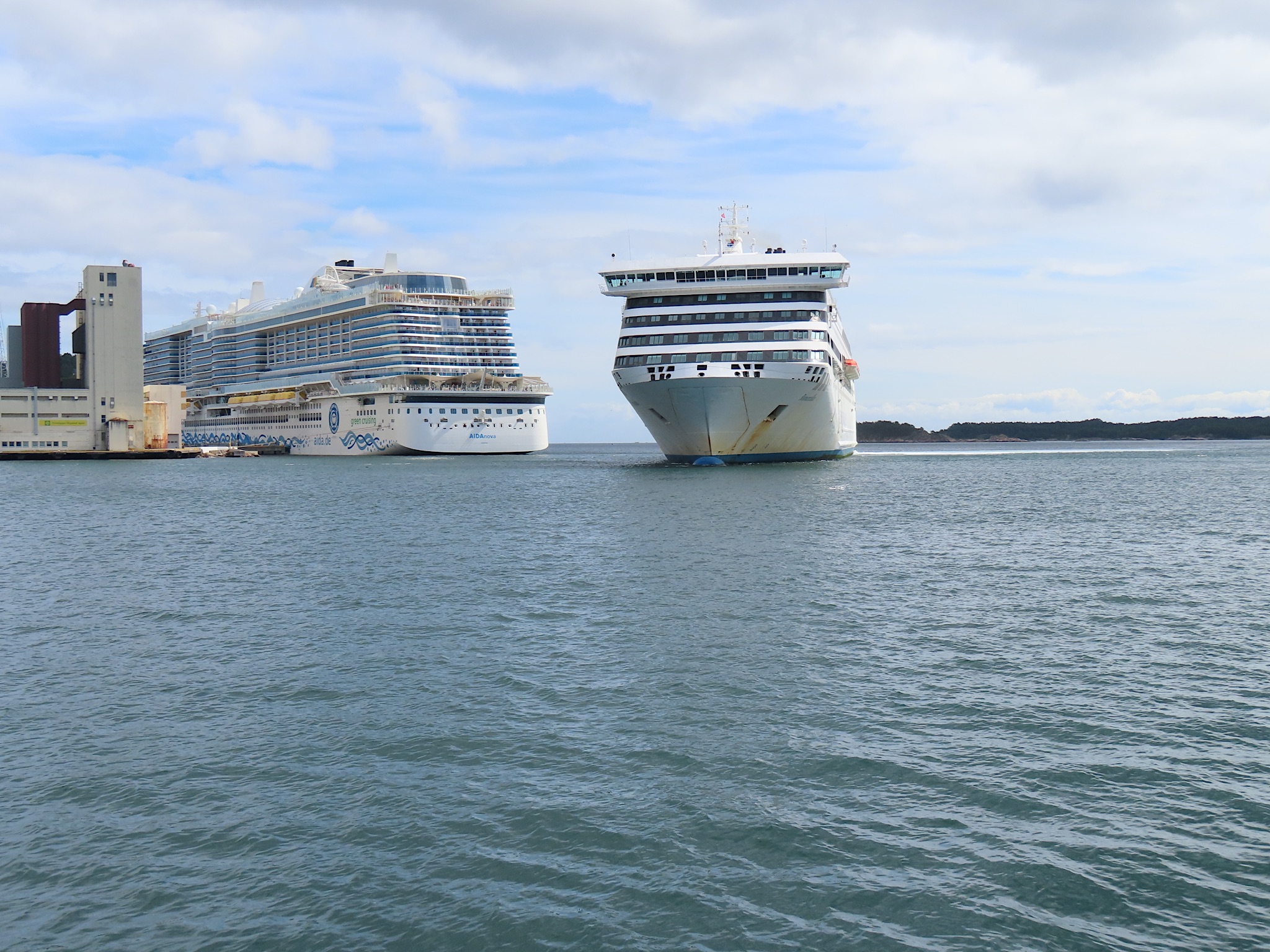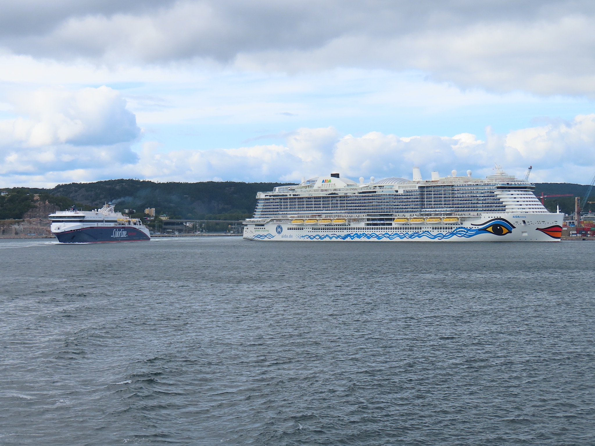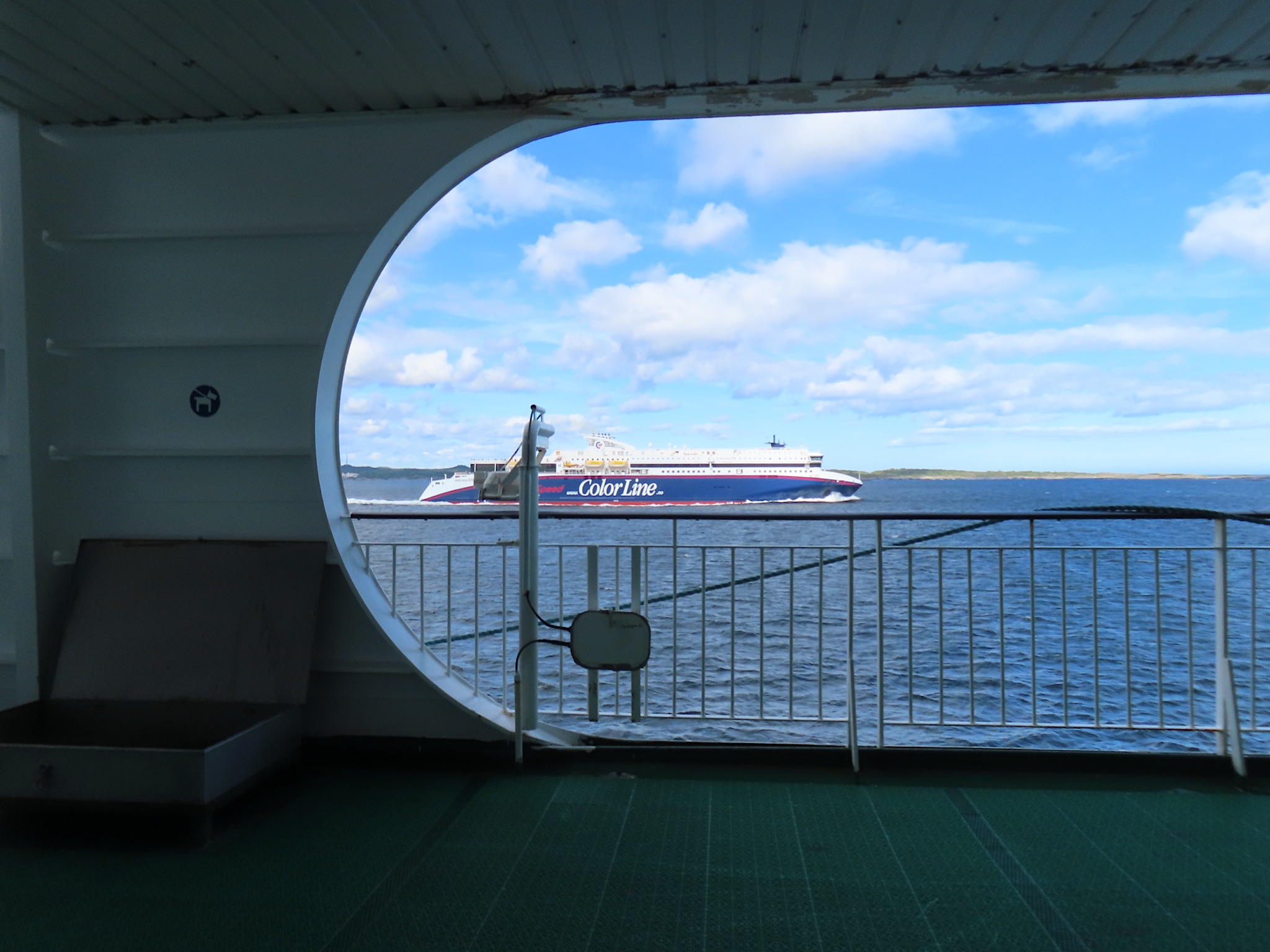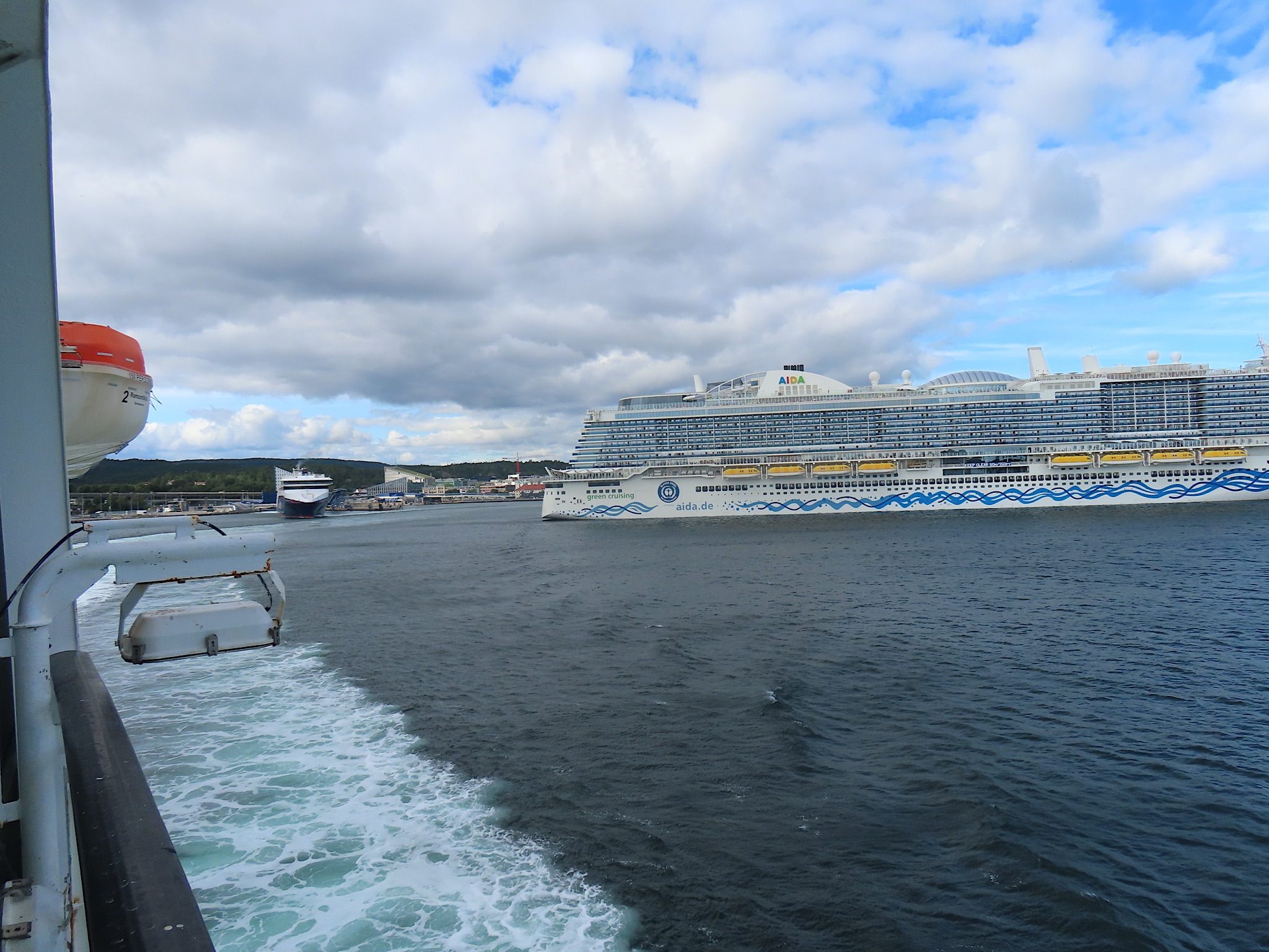 Tegen vieren rijden we naar de kade om aan boord te gaan. Ook dat verloopt soepel. We hebben redelijk rustig weer maar meer wind en wat hogere golven op het stuk langs Denemarken. Desondanks slapen we prima.
