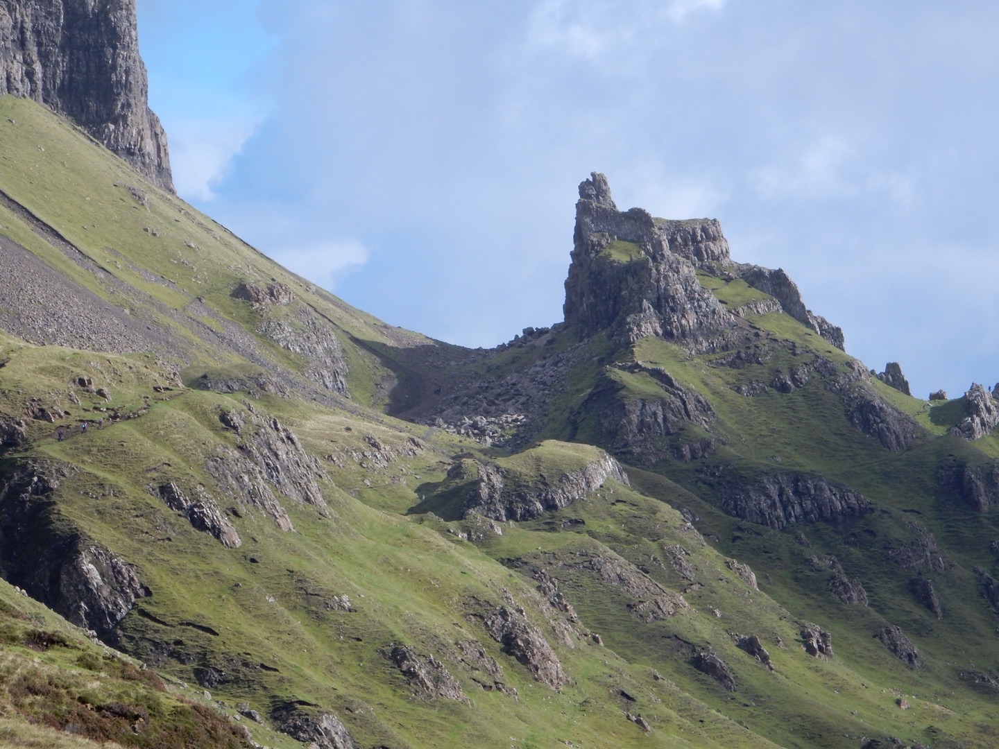 We gaan richting Quiraing, een prachtige hoog gelegen vlakte. Daar aangekomen beginnen we vol goede moed aan het traject van 2.8 miles. Net als vele vele anderen overigens. Het is er erg druk. Het begint bovendien hard te waaien, het wordt kouder en de lucht ziet er ineens dreigend uit. Ook vinden we de paden erg smal en de diepte direct naast het pad wel erg diep. We besluiten dan ook maar terug te gaan en elders te gaan wandelen. Dat wordt de “two brothers” wandeling. Een wandeling naar de kust waar twee broers ooit aanspoelden na een schipbreuk en er bleven wonen.