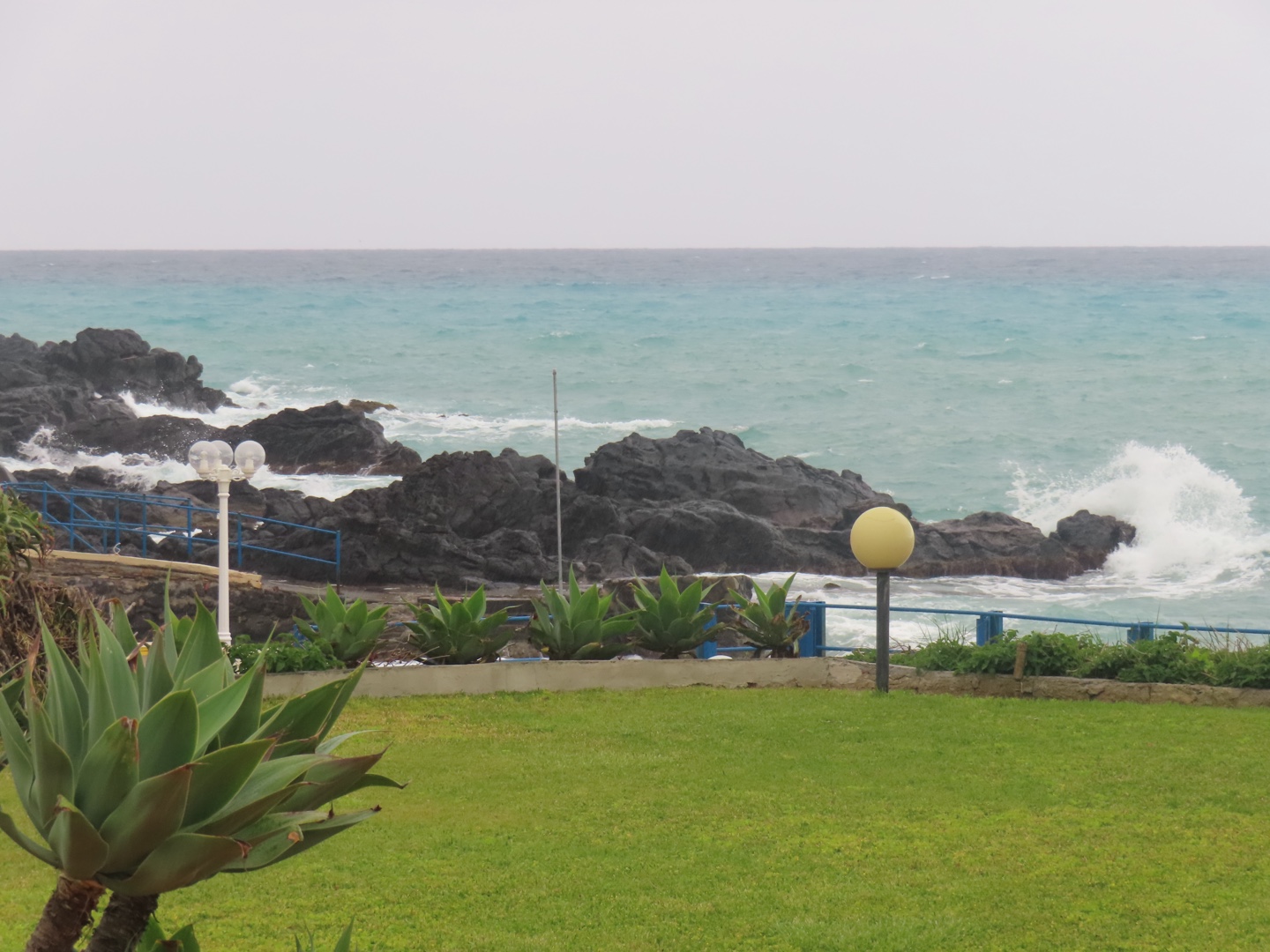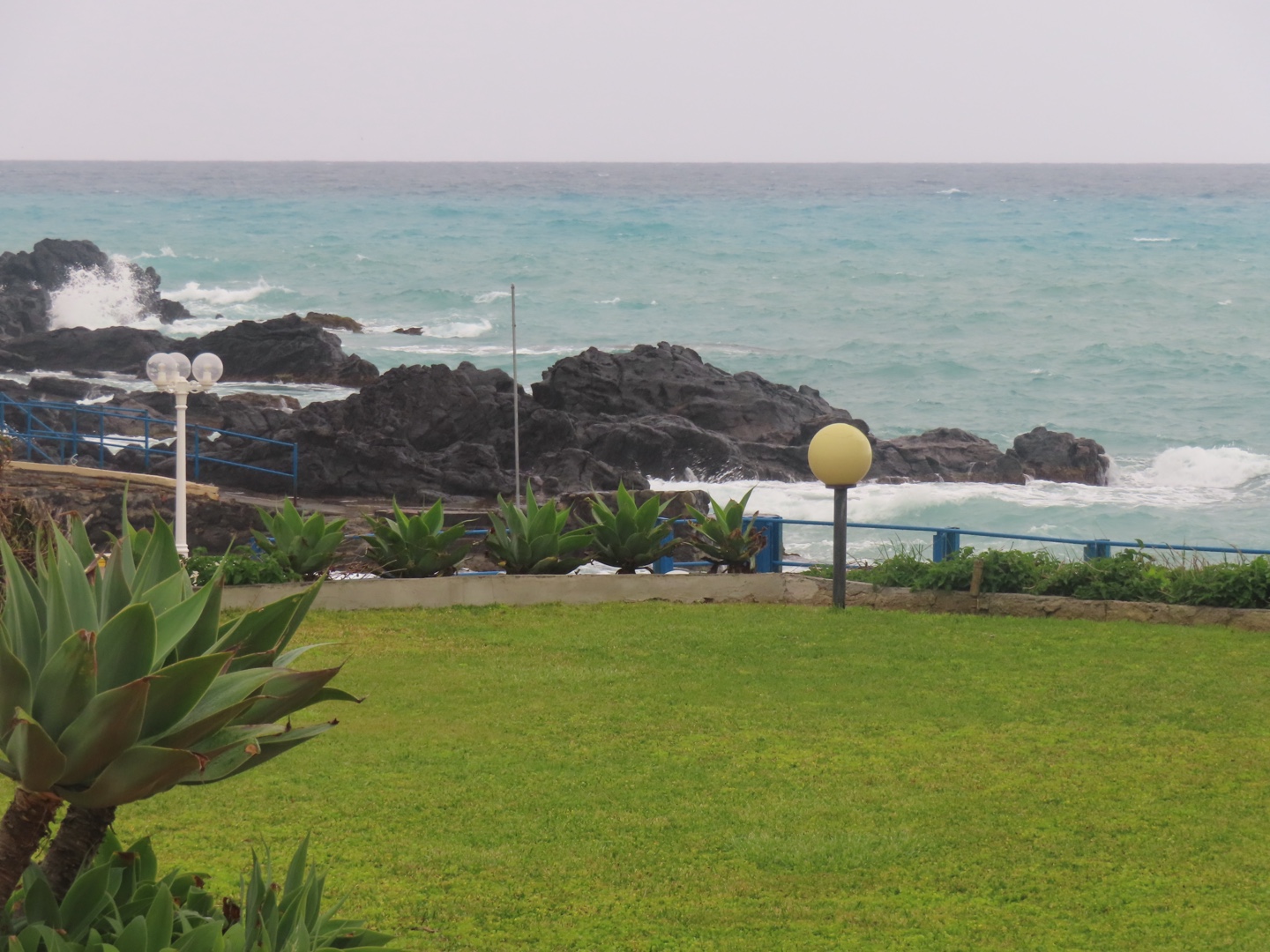 We worden wakker met pittige wind en hoge golven. Het regent flink en het is fris 11gr.