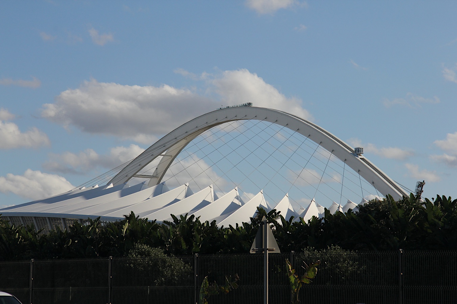 We pakken de auto en rijden nog naar de haven en het, wel mooie, strand. Achter ons staat het voetbalstadion dat men heeft overgehouden aan het WK van een paar jaar geleden. Je kunt nu het dak van 100 m hoog bestijgen per voet aan een tuigje of per buitenlift. Doen we vandaag niet, hoewel Aline graag wil. We gaan terug naar onze lodge, gelegen in een rustige, blanke buurt. Alle tuinen zijn omsloten door hoge muren met stroomdraden daarboven. Zal wel nodig zijn. Tegen vijven gaan we naar de Mall bij ons om de hoek. Keurig winkelcentrum waar ook blanken komen.