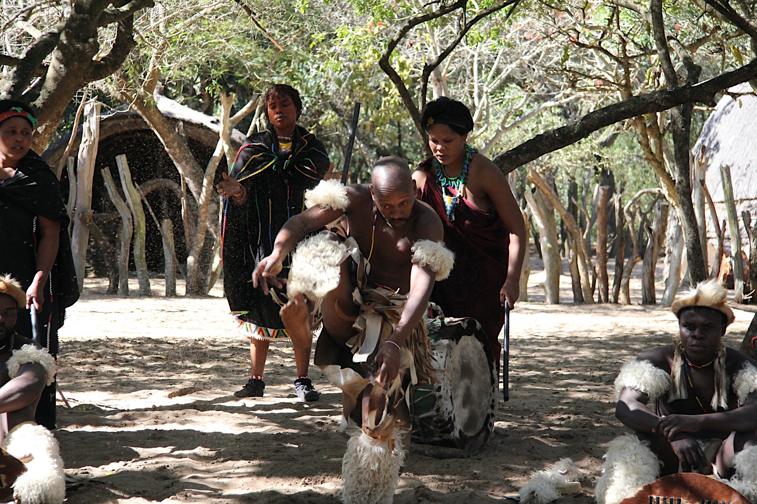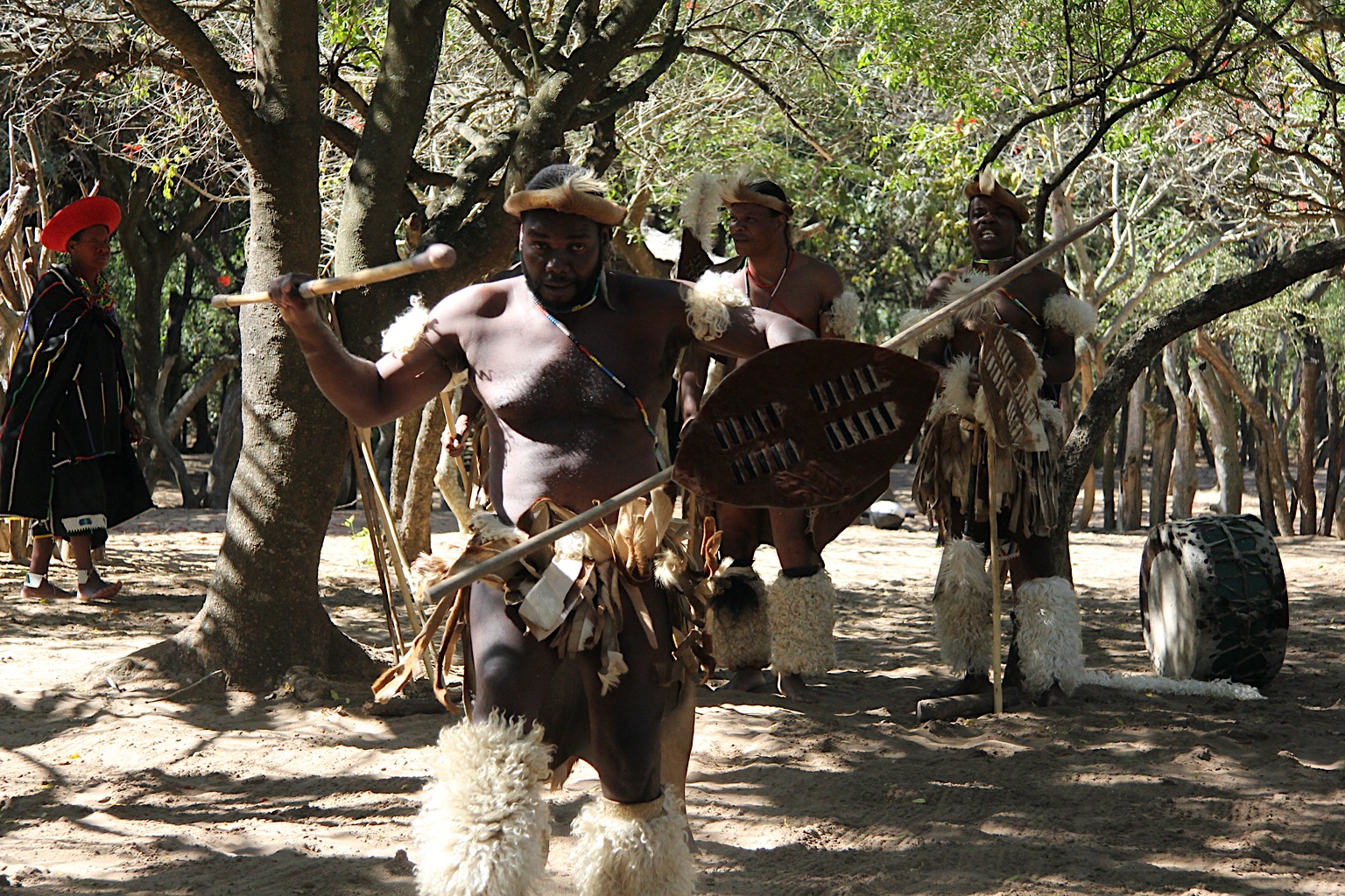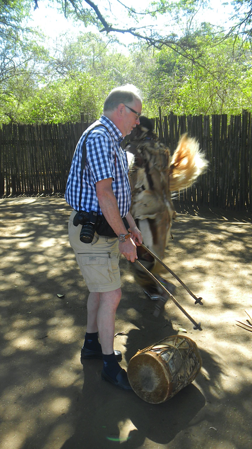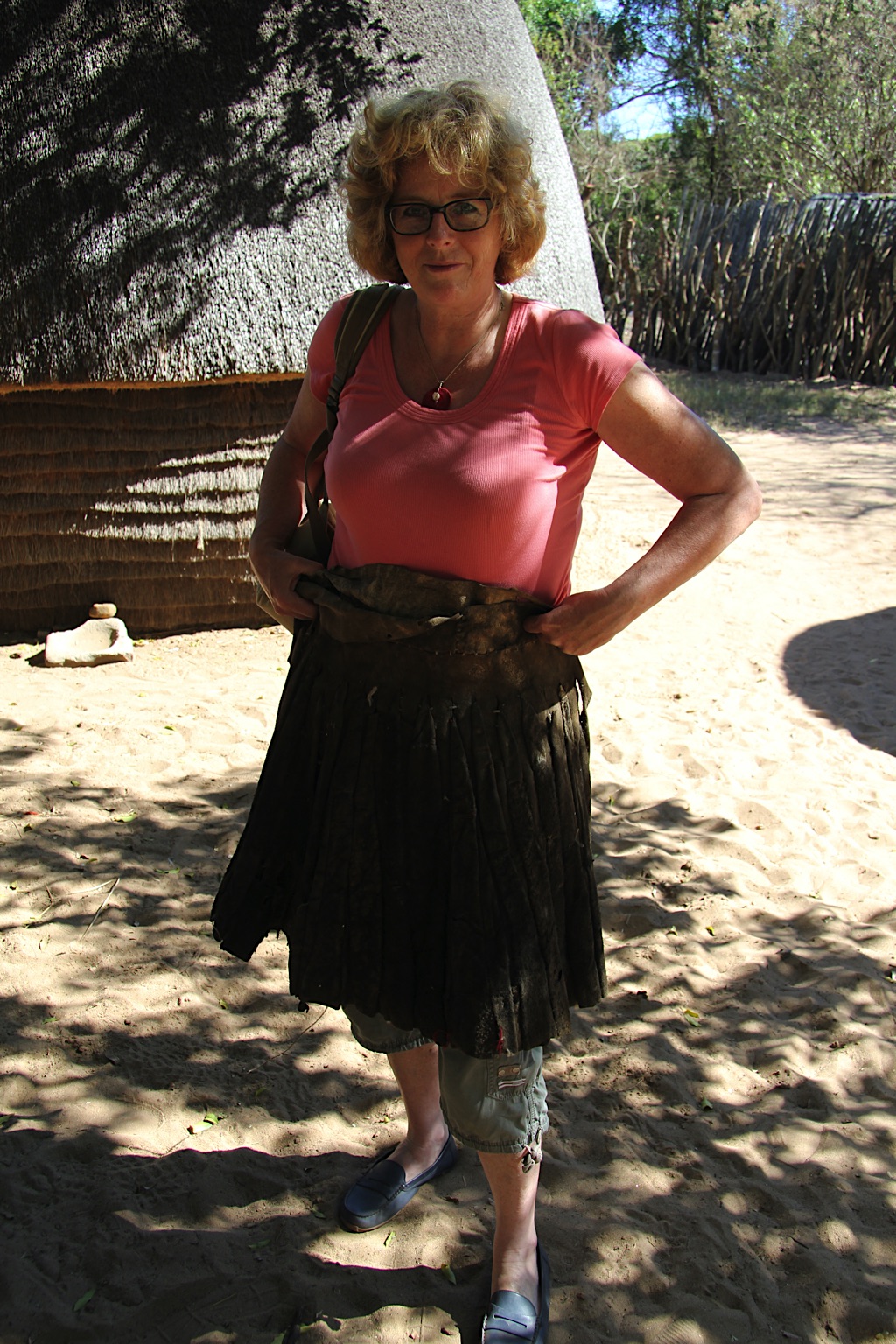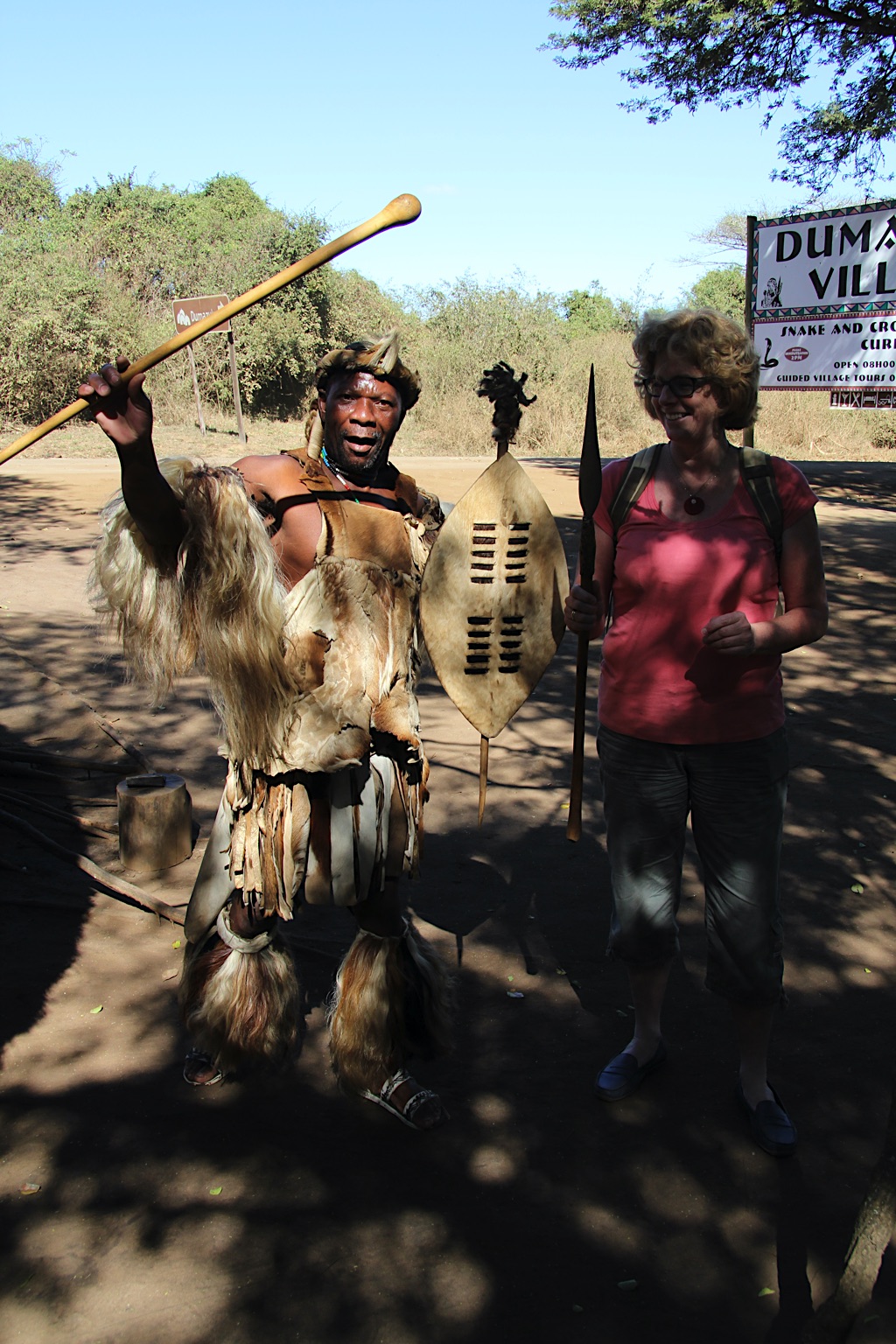 Om elf uur worden we bij het dorp opgewacht door een echte krijger die ons met handen en voeten een paar worden Zulu leert. Leuk wel. We gaan de village in met een engels sprekende tolk. Zij legt ons bij ieder hutje uit waar het voor dient. Vaak zitten er voor de hut vrouwen of mannen, vuur te maken of kralen te maken. Aan het eind gen we de gids een bescheiden fooi. Haar houding slaat direct om. Ze had duidelijk meer verwacht. We hebben er niet aan toe gegeven. Daarna kregen we toch nog een leuke maar enigszins uitgebluste dans te zien van het gezelschap Zulu’s.