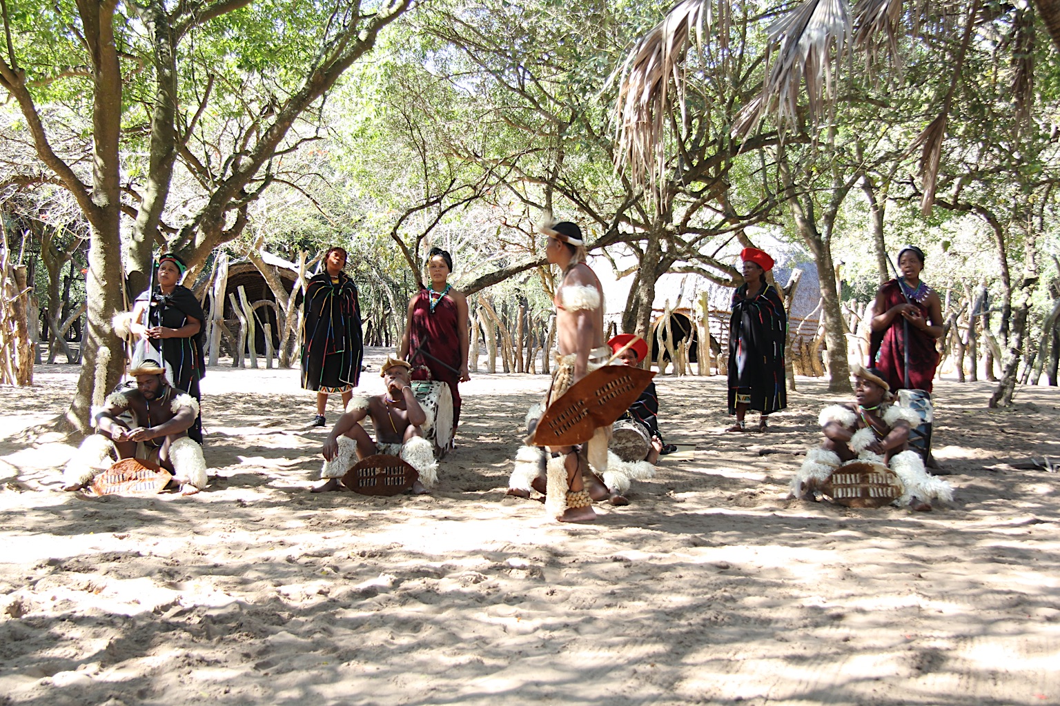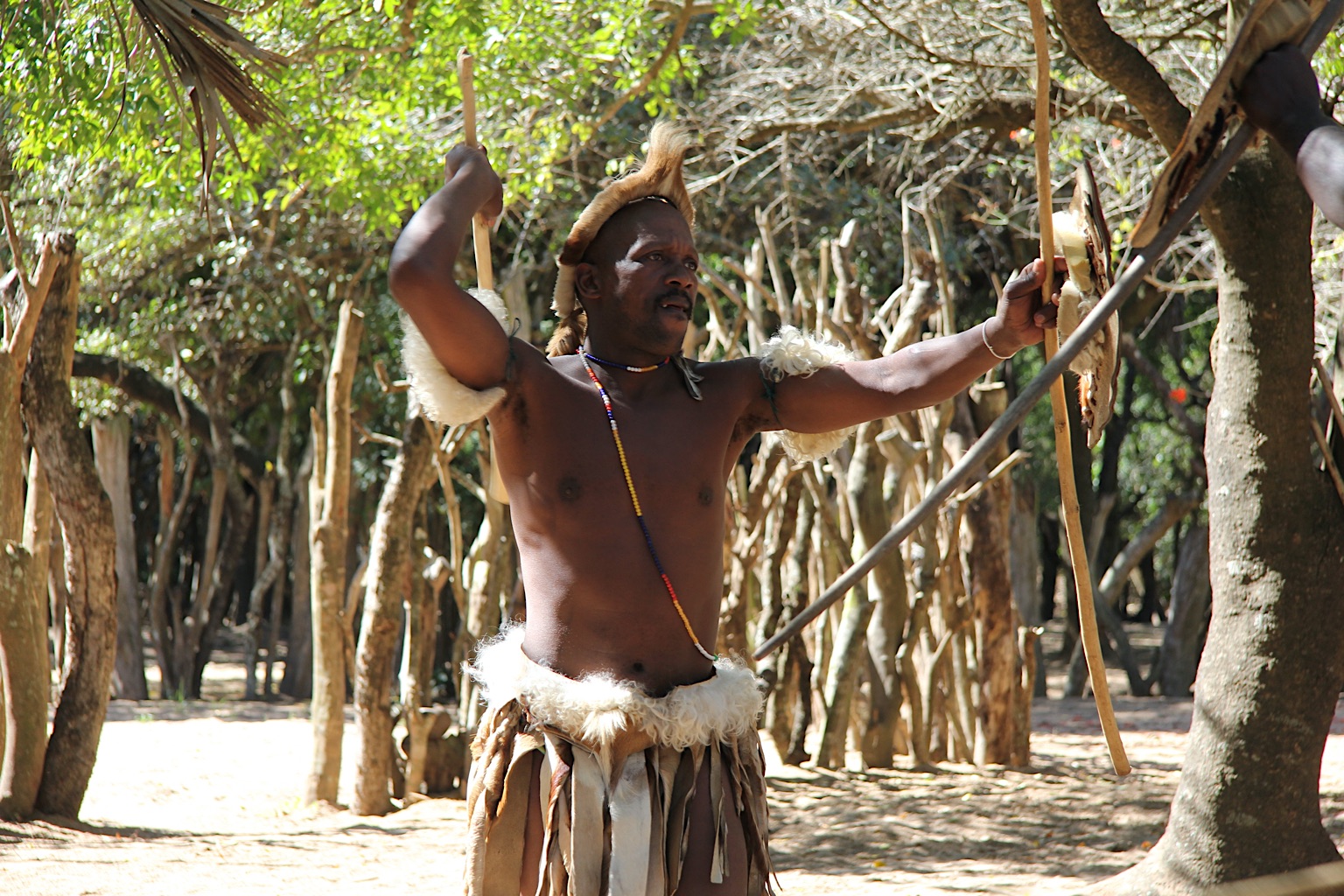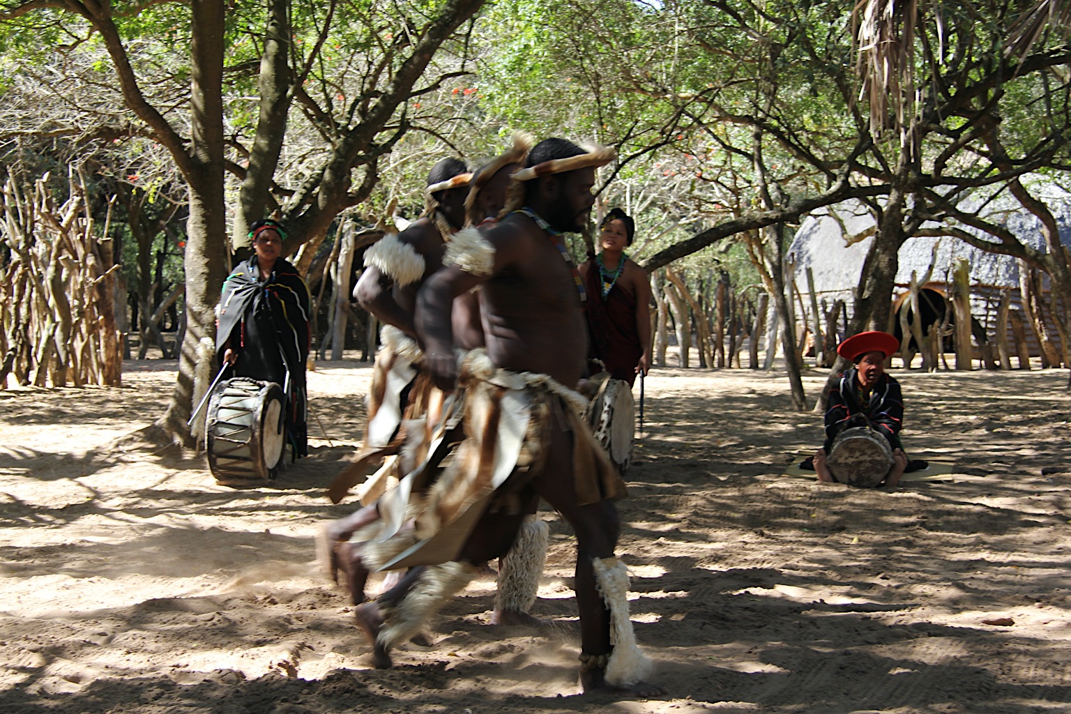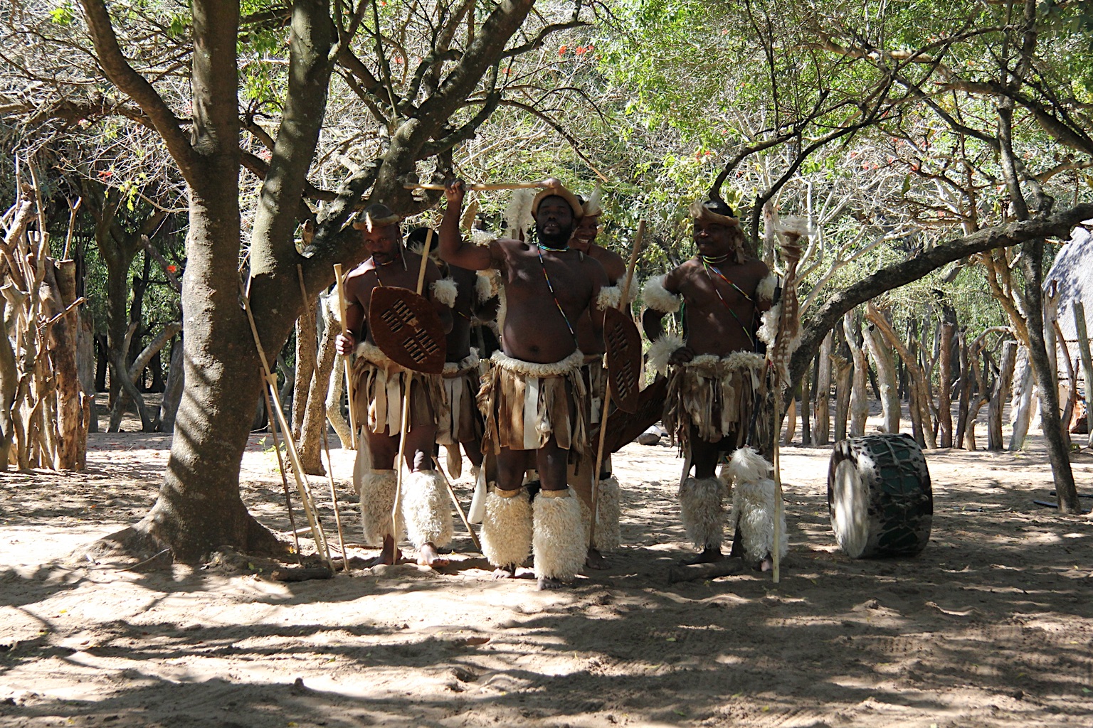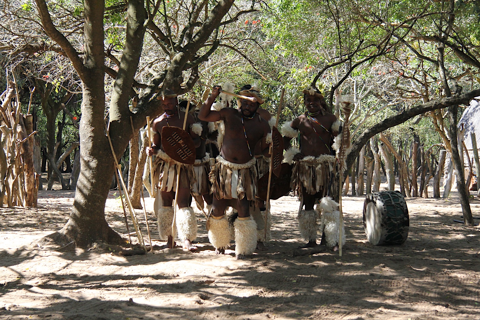 Om elf uur worden we bij het dorp opgewacht door een echte krijger die ons met handen en voeten een paar worden Zulu leert. Leuk wel. We gaan de village in met een engels sprekende tolk. Zij legt ons bij ieder hutje uit waar het voor dient. Vaak zitten er voor de hut vrouwen of mannen, vuur te maken of kralen te maken. Aan het eind gen we de gids een bescheiden fooi. Haar houding slaat direct om. Ze had duidelijk meer verwacht. We hebben er niet aan toe gegeven. Daarna kregen we toch nog een leuke maar enigszins uitgebluste dans te zien van het gezelschap Zulu’s.
