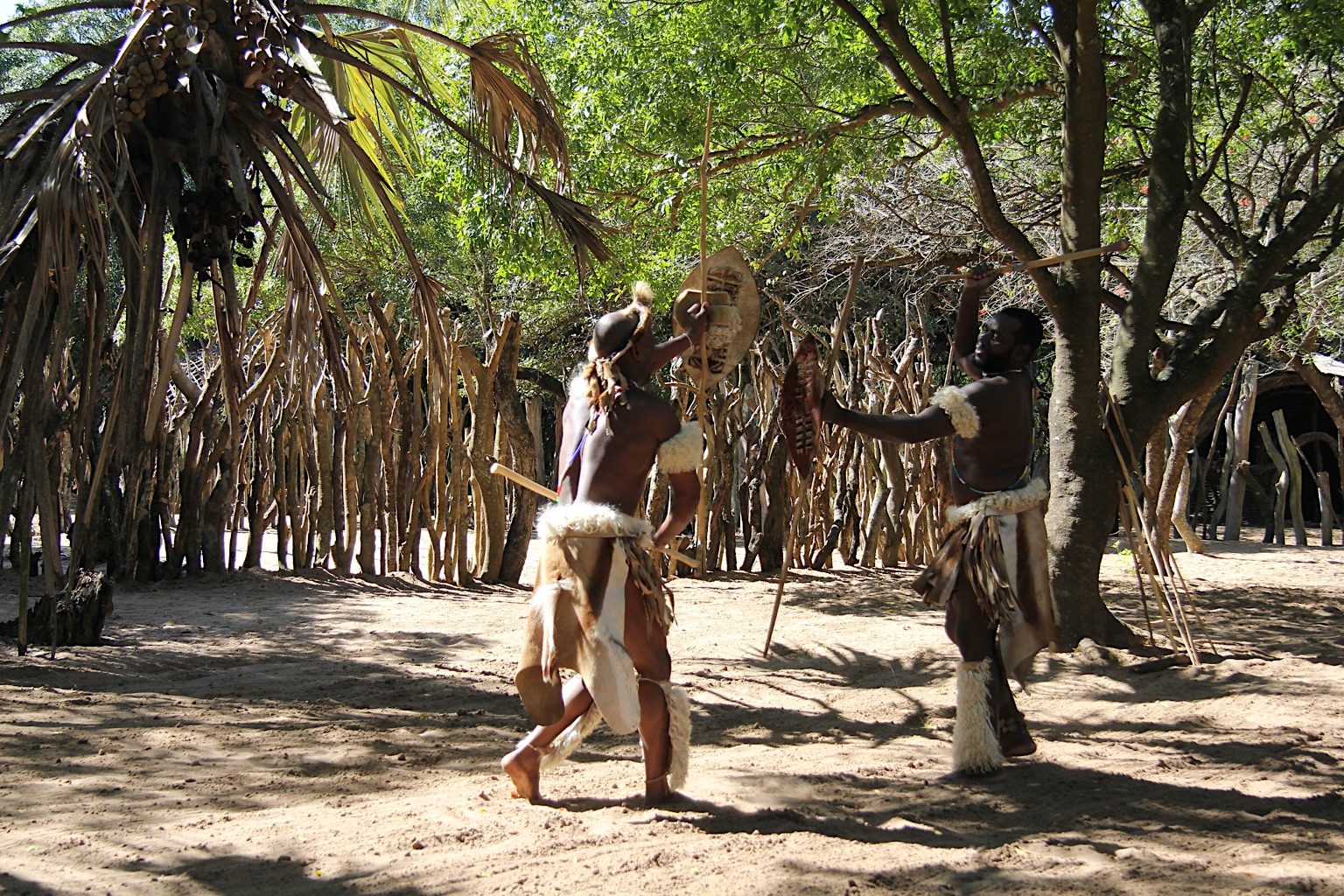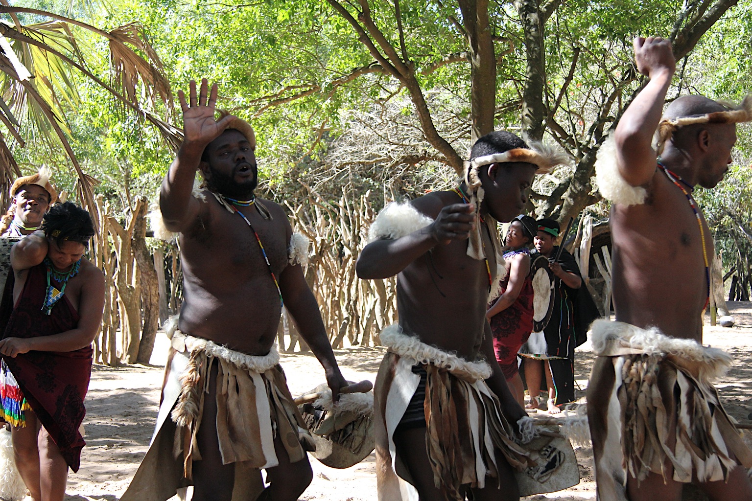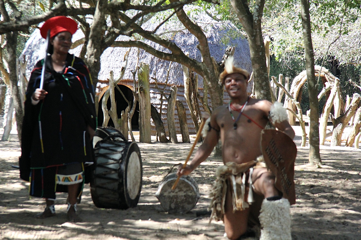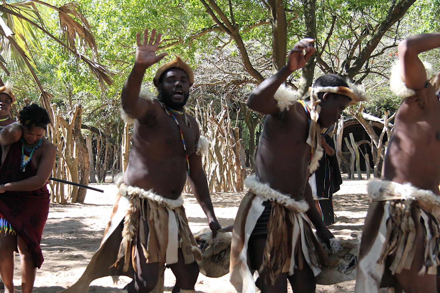Om elf uur worden we bij het dorp opgewacht door een echte krijger die ons met handen en voeten een paar worden Zulu leert. Leuk wel. We gaan de village in met een engels sprekende tolk. Zij legt ons bij ieder hutje uit waar het voor dient. Vaak zitten er voor de hut vrouwen of mannen, vuur te maken of kralen te maken. Aan het eind gen we de gids een bescheiden fooi. Haar houding slaat direct om. Ze had duidelijk meer verwacht. We hebben er niet aan toe gegeven. Daarna kregen we toch nog een leuke maar enigszins uitgebluste dans te zien van het gezelschap Zulu’s.