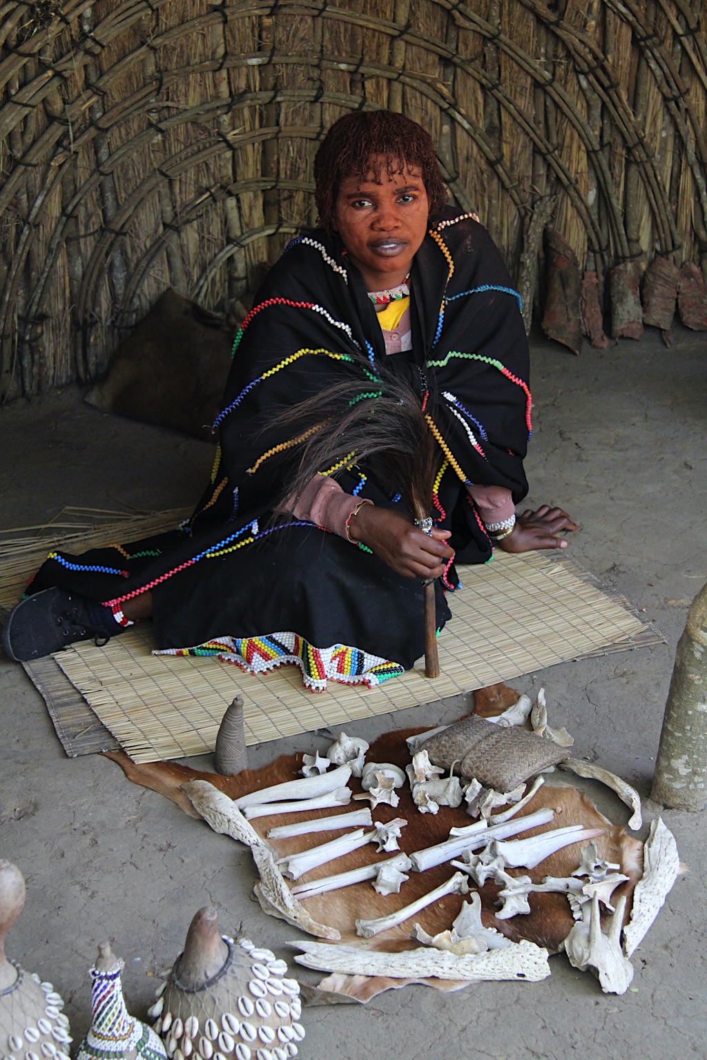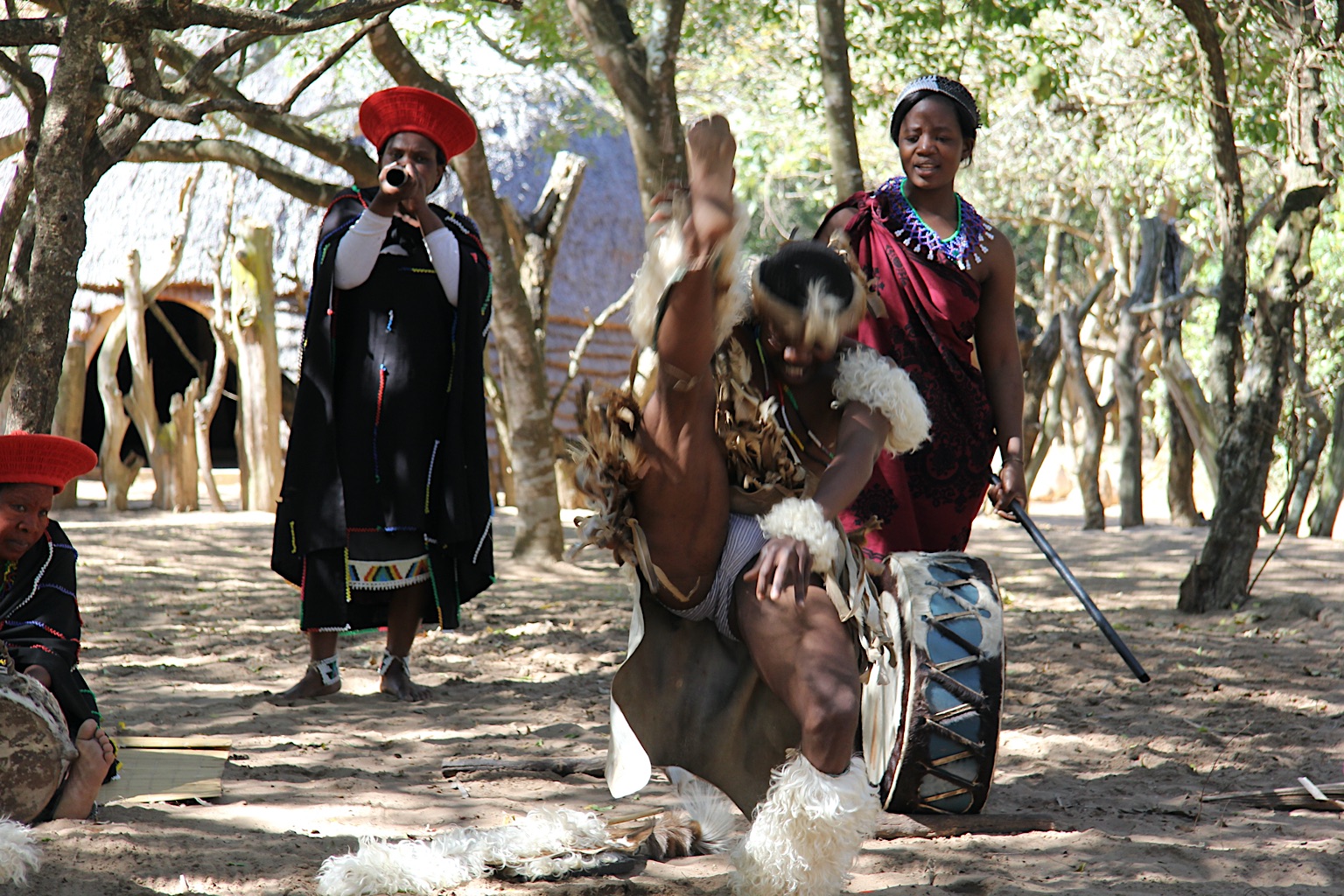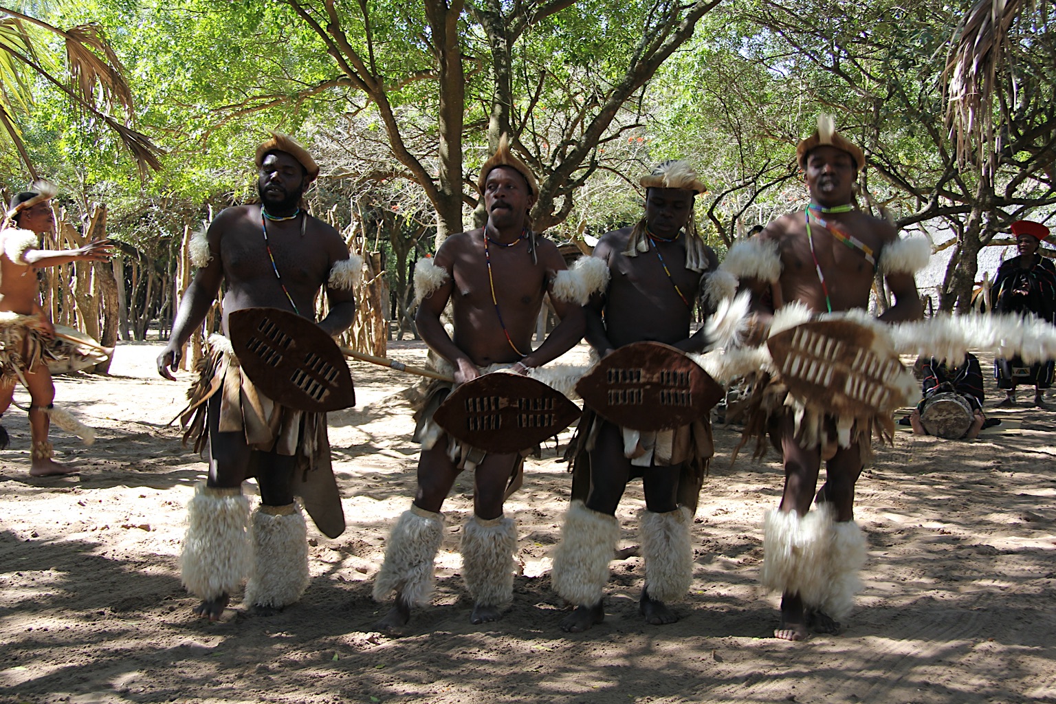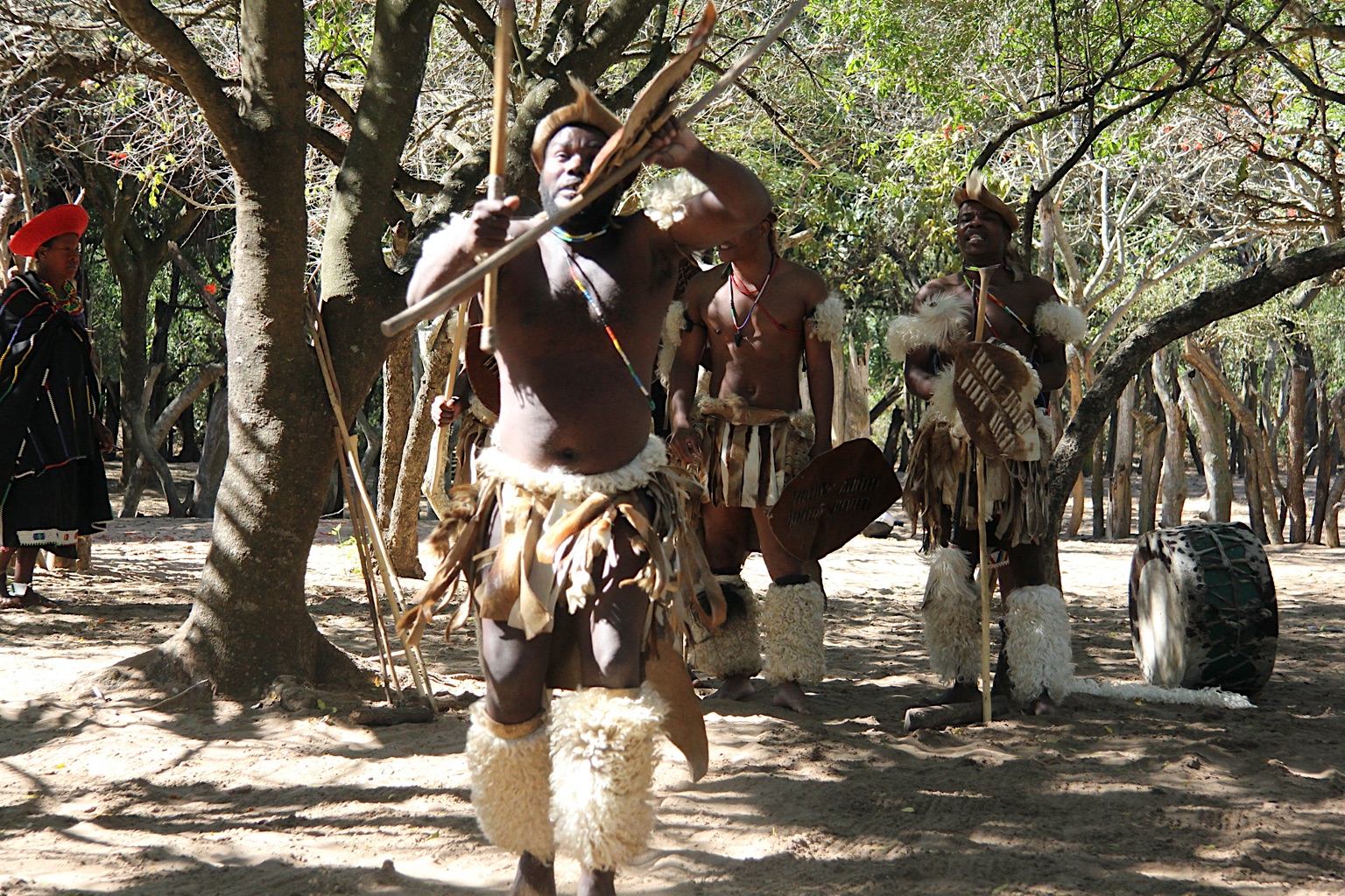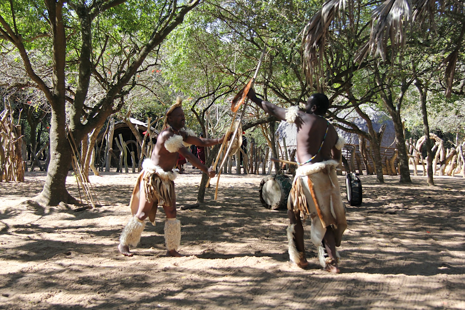 Om elf uur worden we bij het dorp opgewacht door een echte krijger die ons met handen en voeten een paar worden Zulu leert. Leuk wel. We gaan de village in met een engels sprekende tolk. Zij legt ons bij ieder hutje uit waar het voor dient. Vaak zitten er voor de hut vrouwen of mannen, vuur te maken of kralen te maken. Aan het eind gen we de gids een bescheiden fooi. Haar houding slaat direct om. Ze had duidelijk meer verwacht. We hebben er niet aan toe gegeven. Daarna kregen we toch nog een leuke maar enigszins uitgebluste dans te zien van het gezelschap Zulu’s.