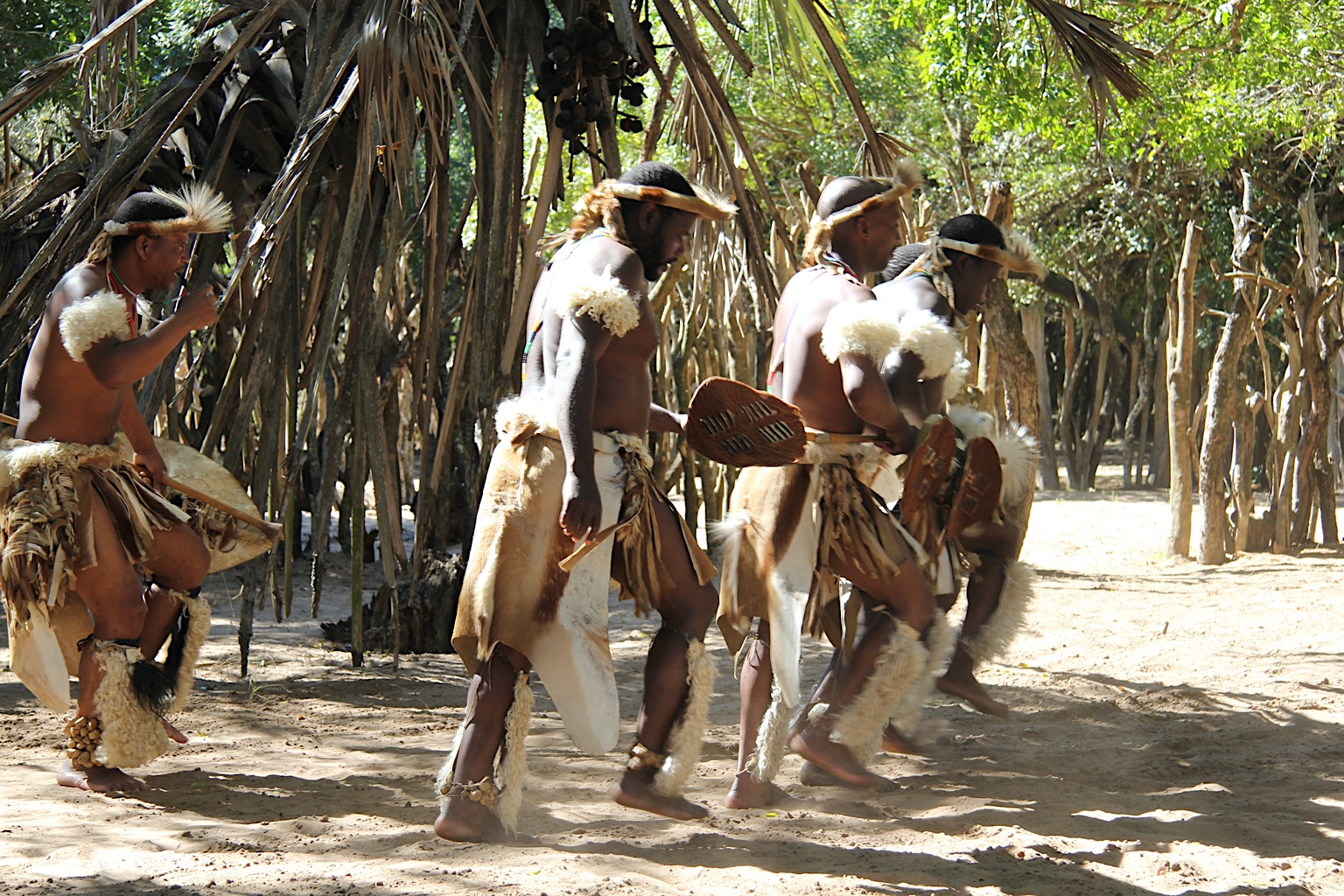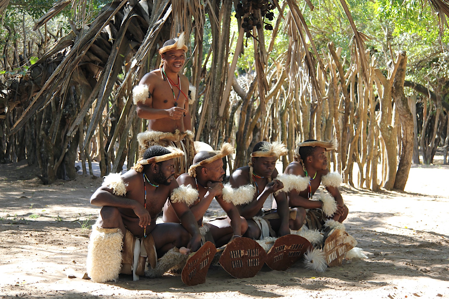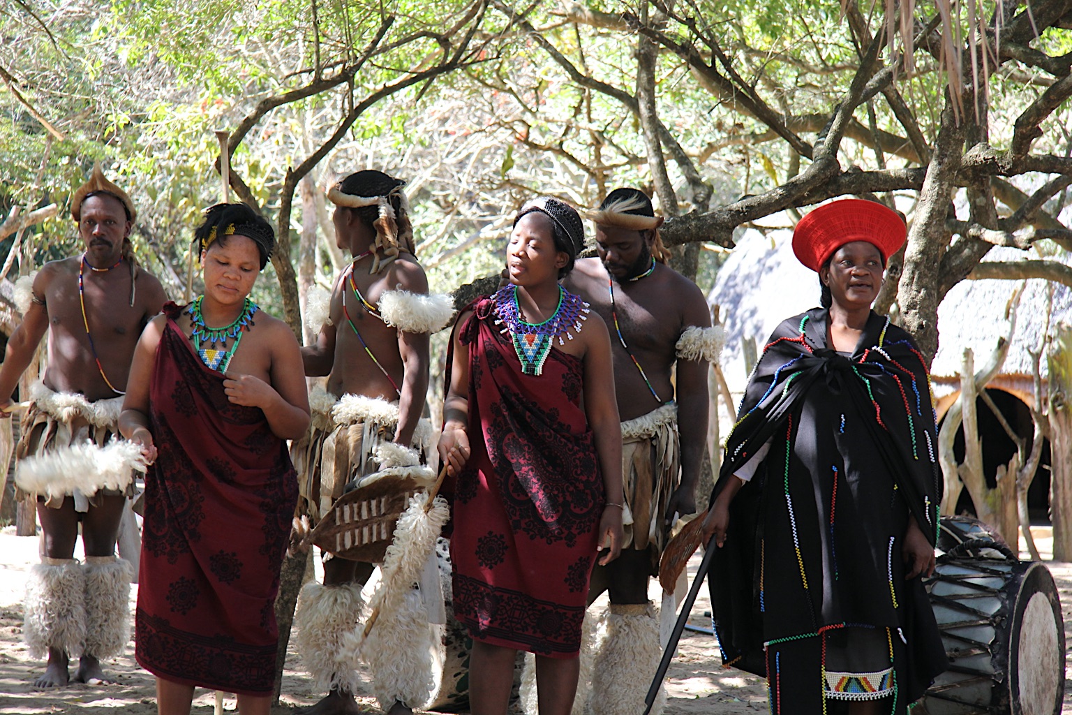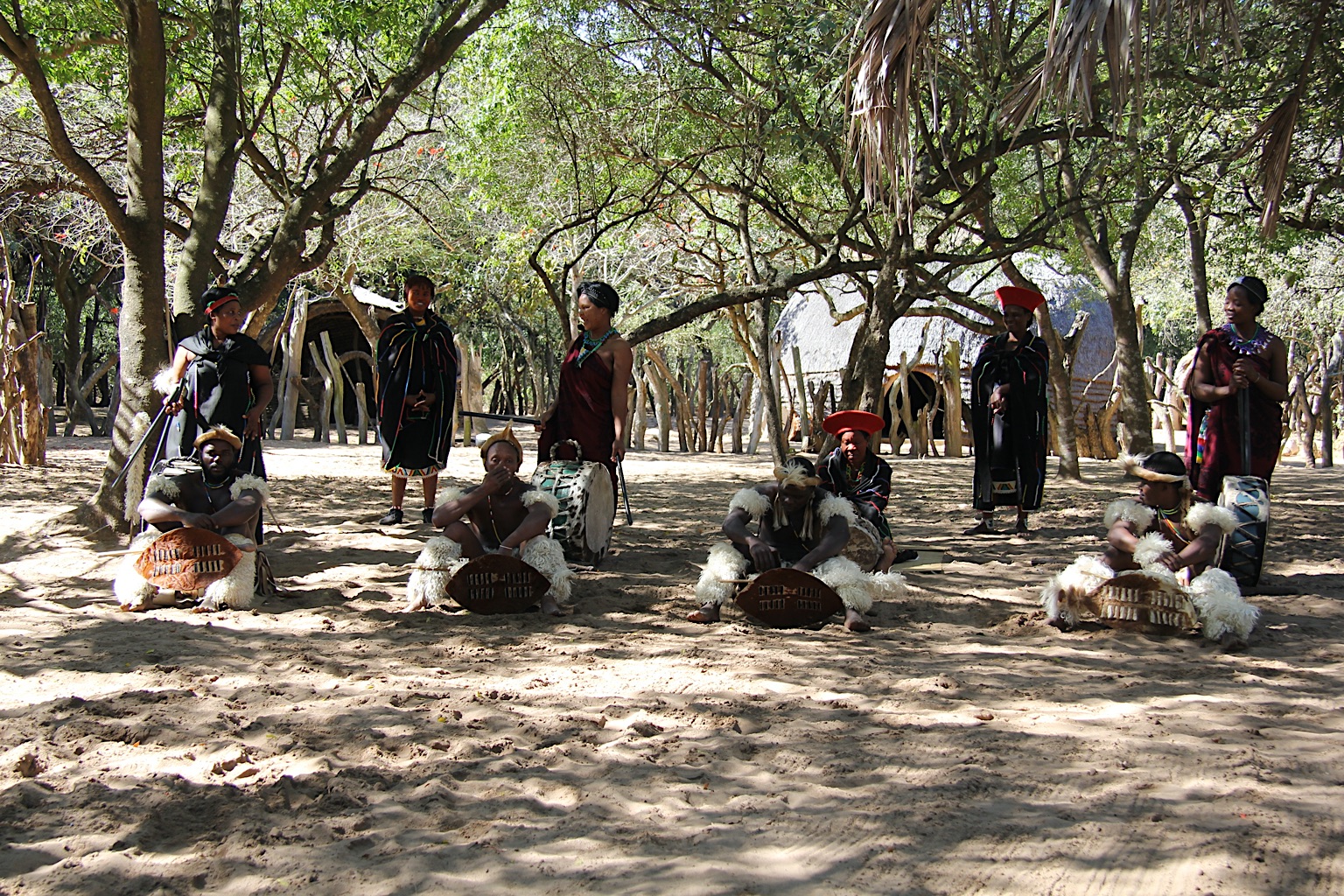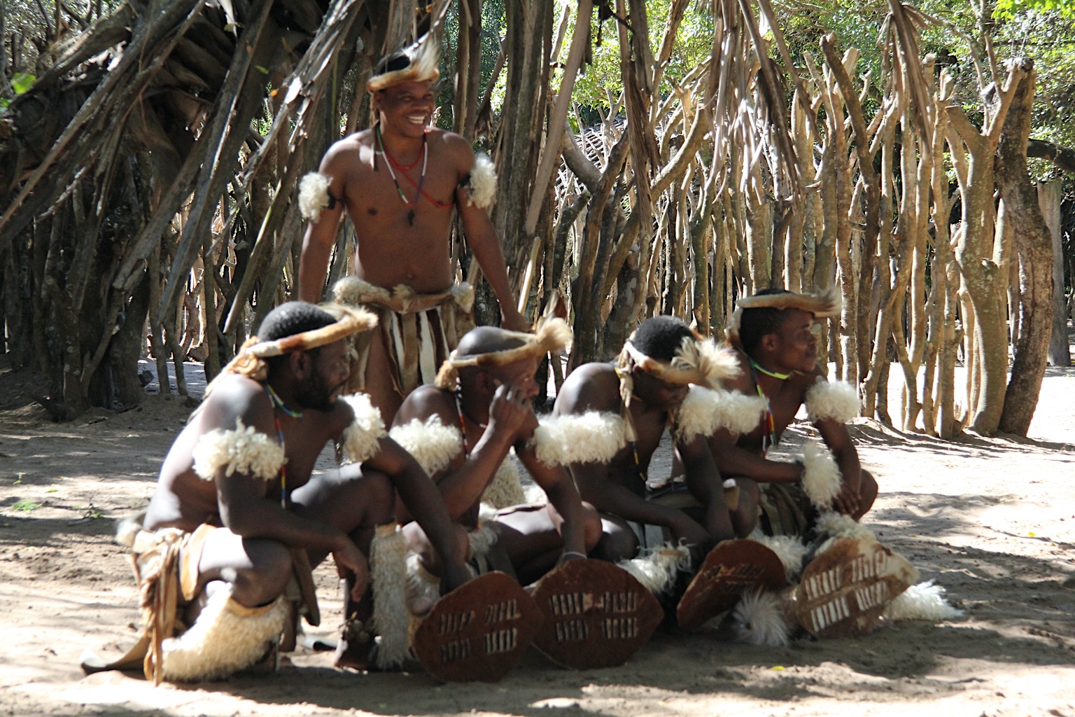Om elf uur worden we bij het dorp opgewacht door een echte krijger die ons met handen en voeten een paar worden Zulu leert. Leuk wel. We gaan de village in met een engels sprekende tolk. Zij legt ons bij ieder hutje uit waar het voor dient. Vaak zitten er voor de hut vrouwen of mannen, vuur te maken of kralen te maken. Aan het eind gen we de gids een bescheiden fooi. Haar houding slaat direct om. Ze had duidelijk meer verwacht. We hebben er niet aan toe gegeven. Daarna kregen we toch nog een leuke maar enigszins uitgebluste dans te zien van het gezelschap Zulu’s.