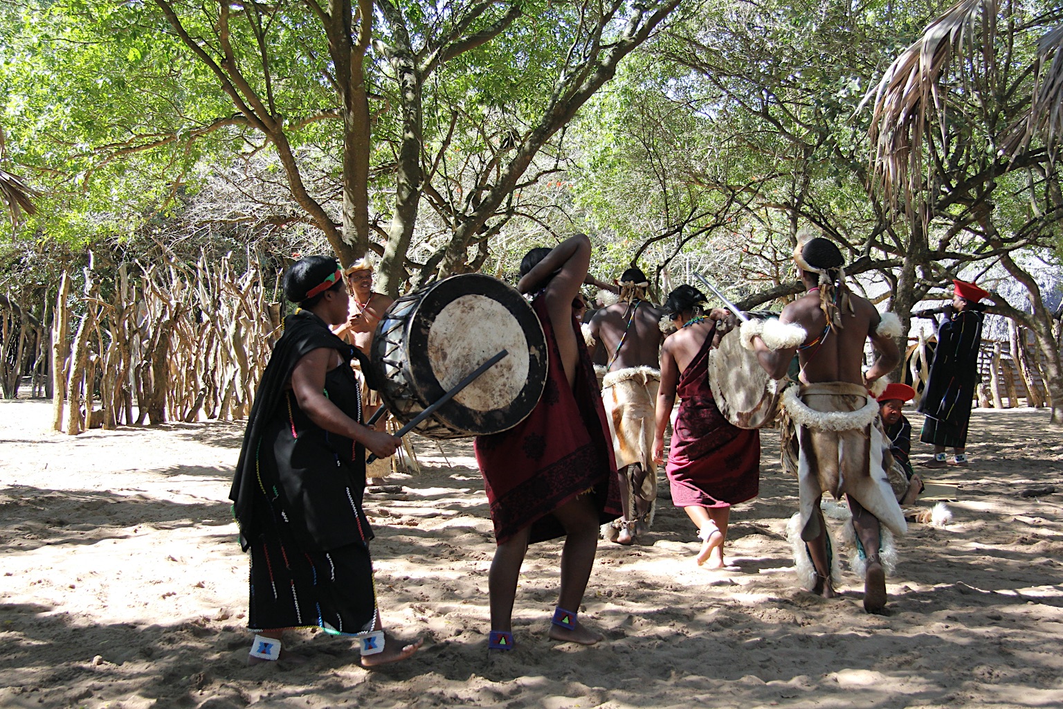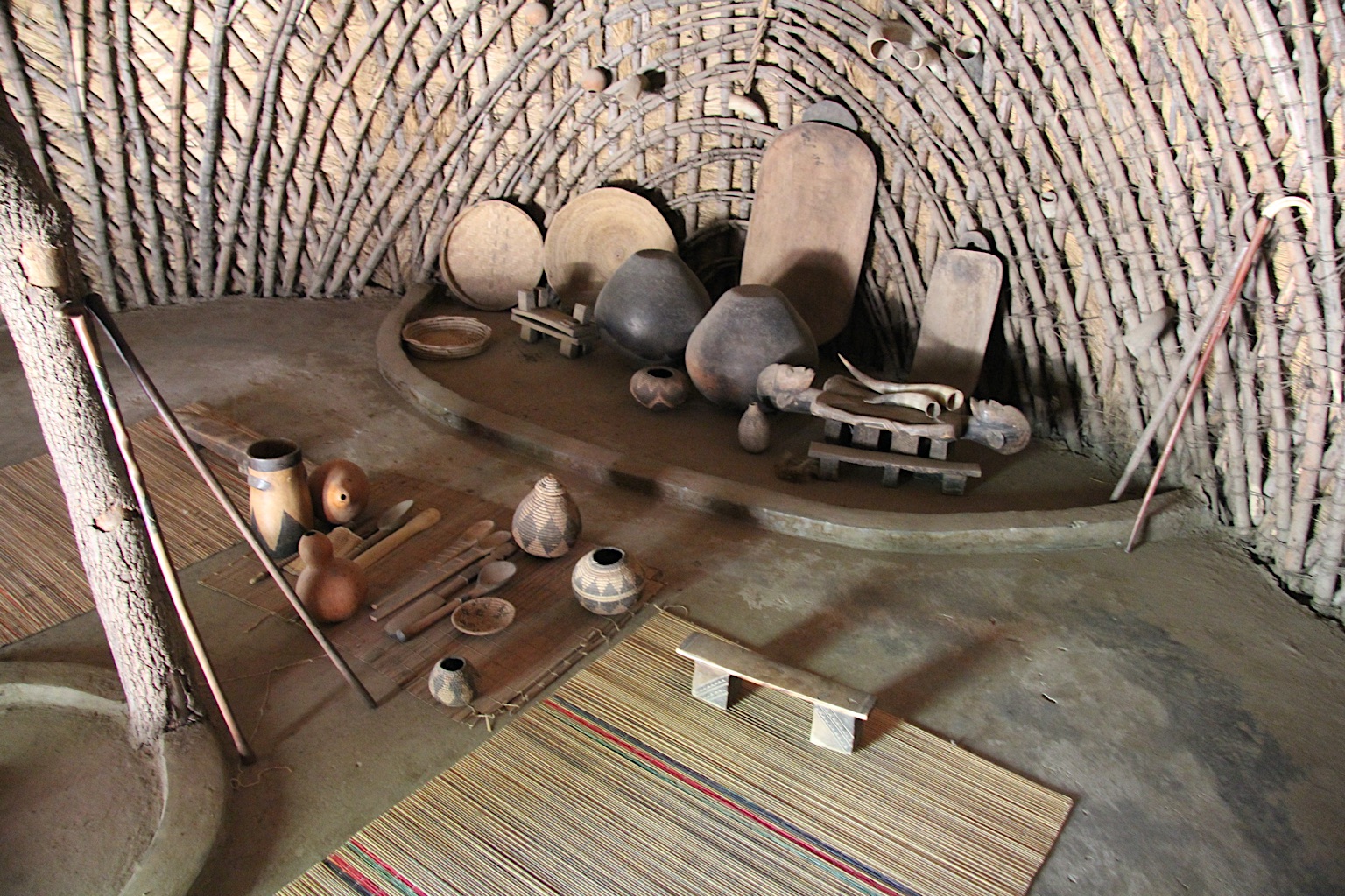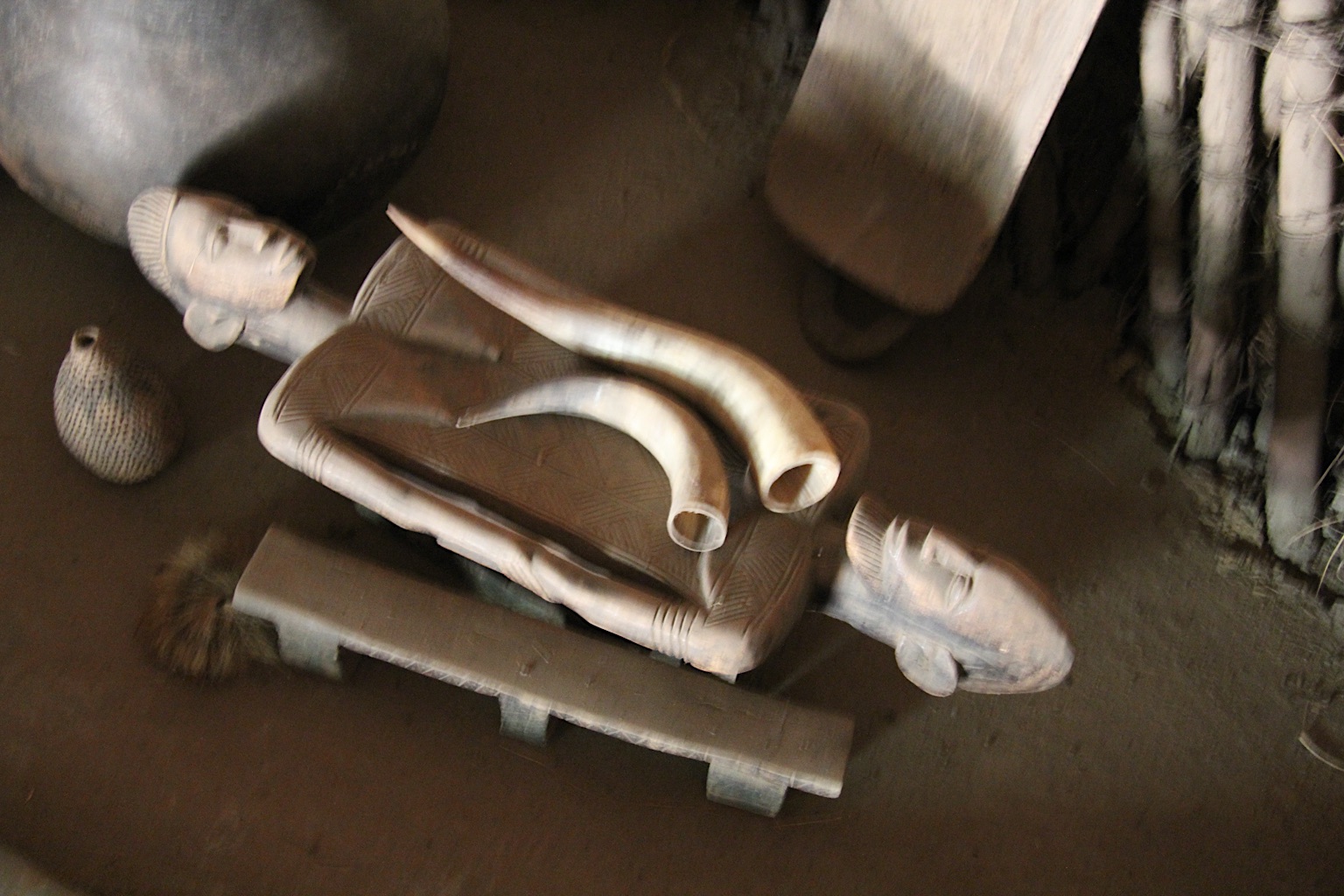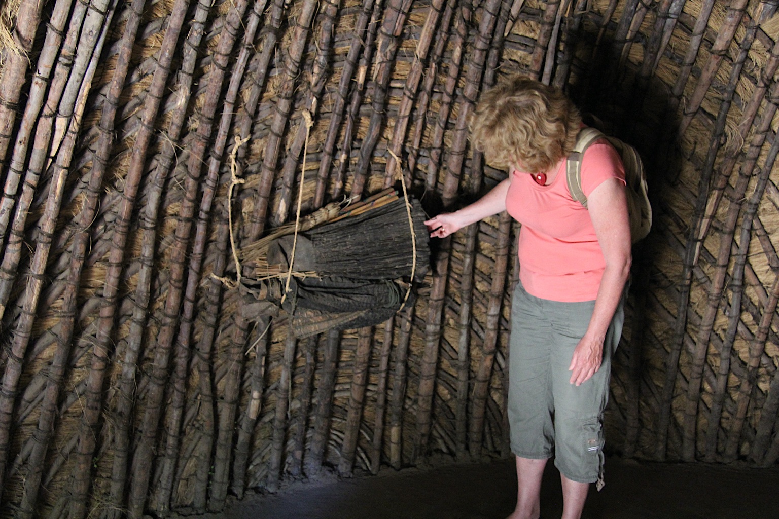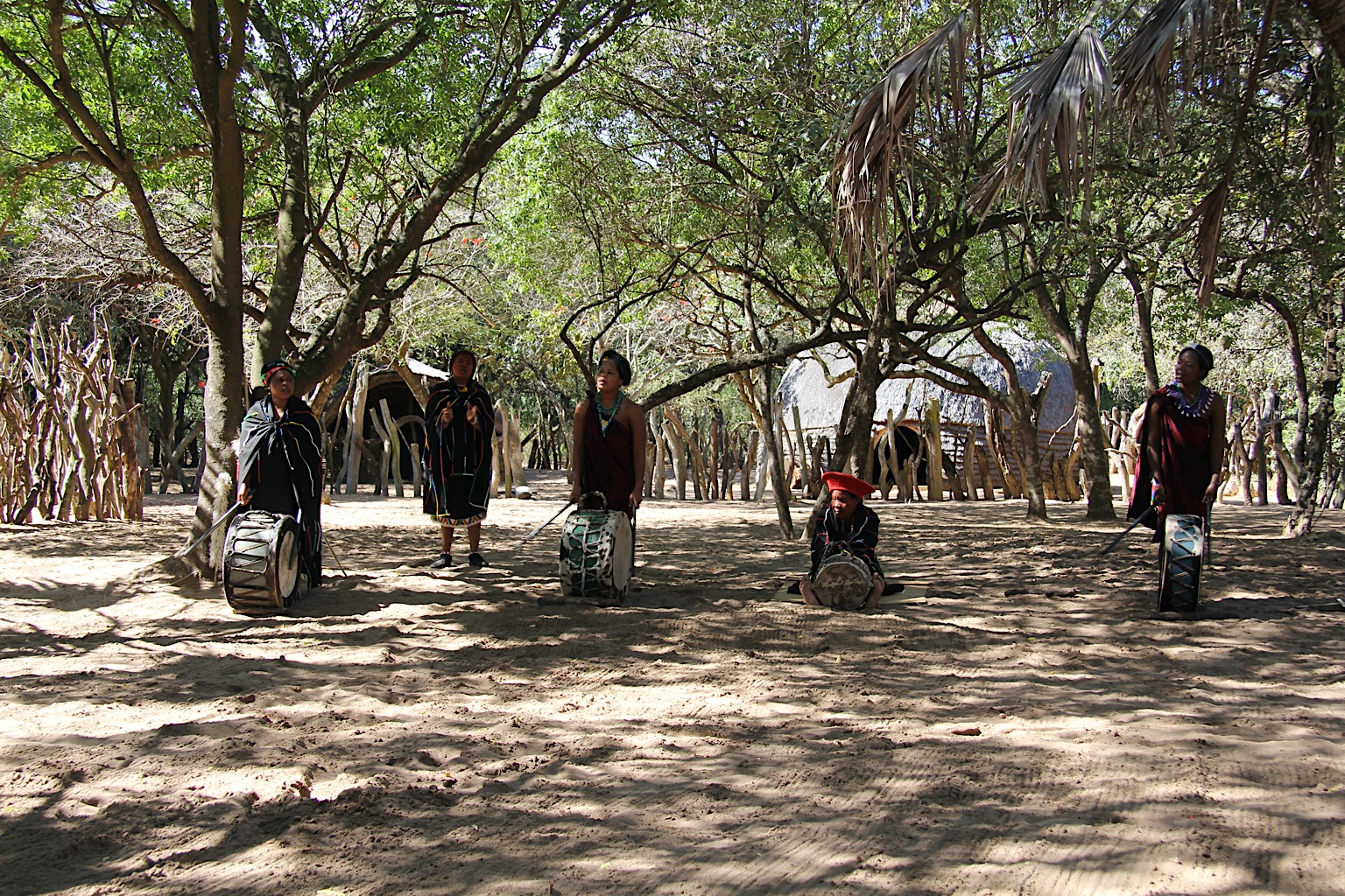 Om elf uur worden we bij het dorp opgewacht door een echte krijger die ons met handen en voeten een paar worden Zulu leert. Leuk wel. We gaan de village in met een engels sprekende tolk. Zij legt ons bij ieder hutje uit waar het voor dient. Vaak zitten er voor de hut vrouwen of mannen, vuur te maken of kralen te maken. Aan het eind gen we de gids een bescheiden fooi. Haar houding slaat direct om. Ze had duidelijk meer verwacht. We hebben er niet aan toe gegeven. Daarna kregen we toch nog een leuke maar enigszins uitgebluste dans te zien van het gezelschap Zulu’s.