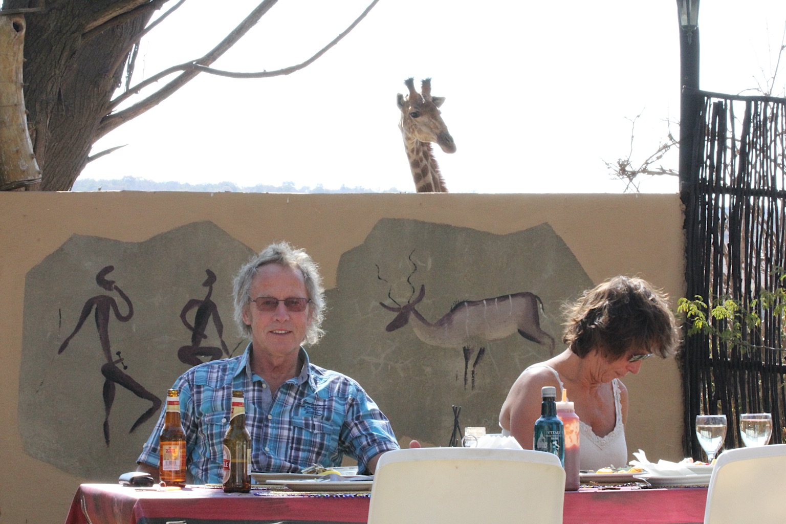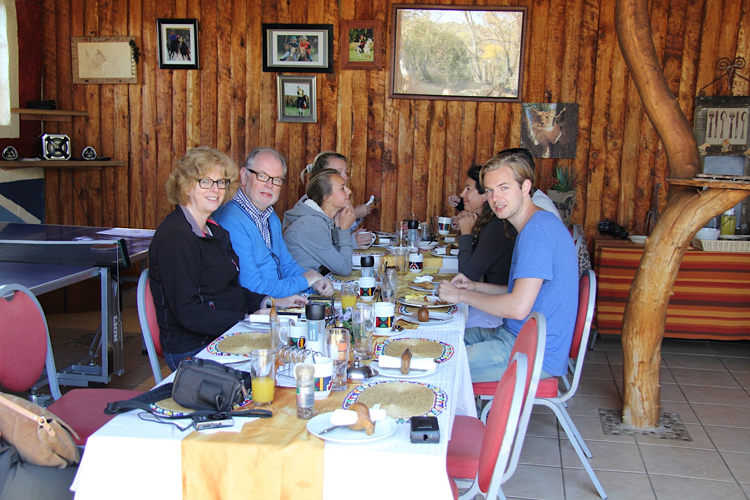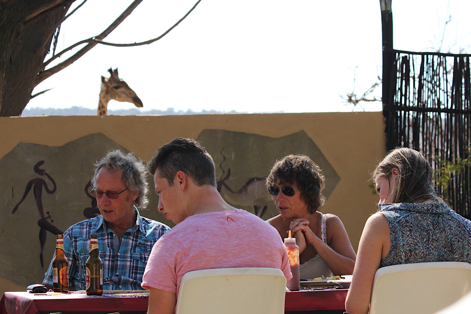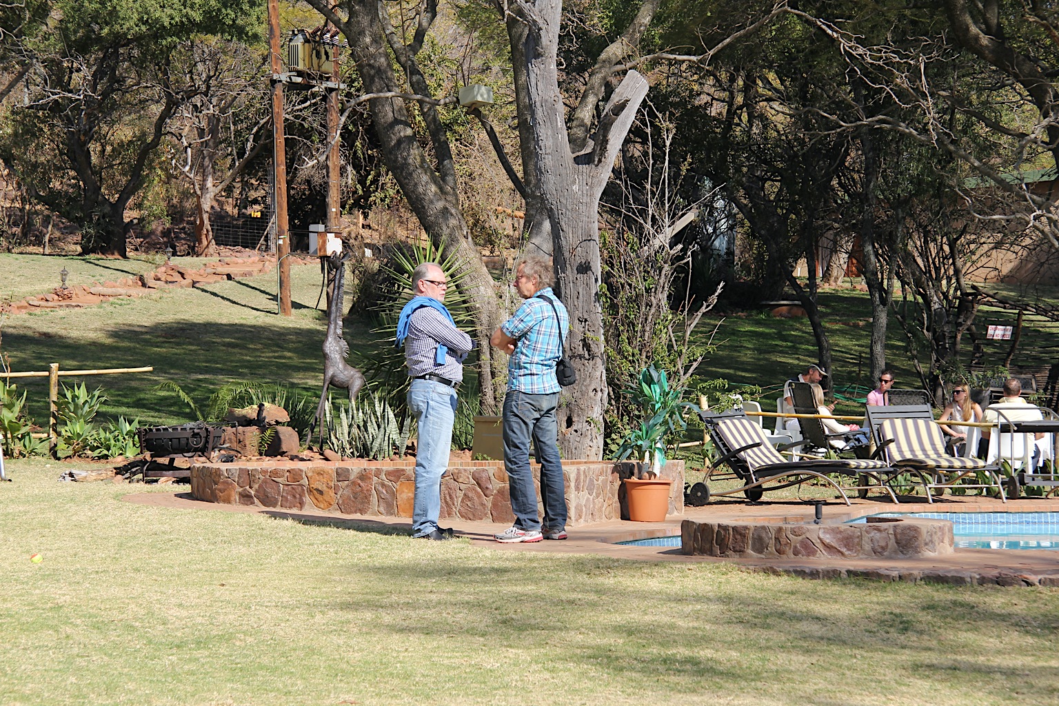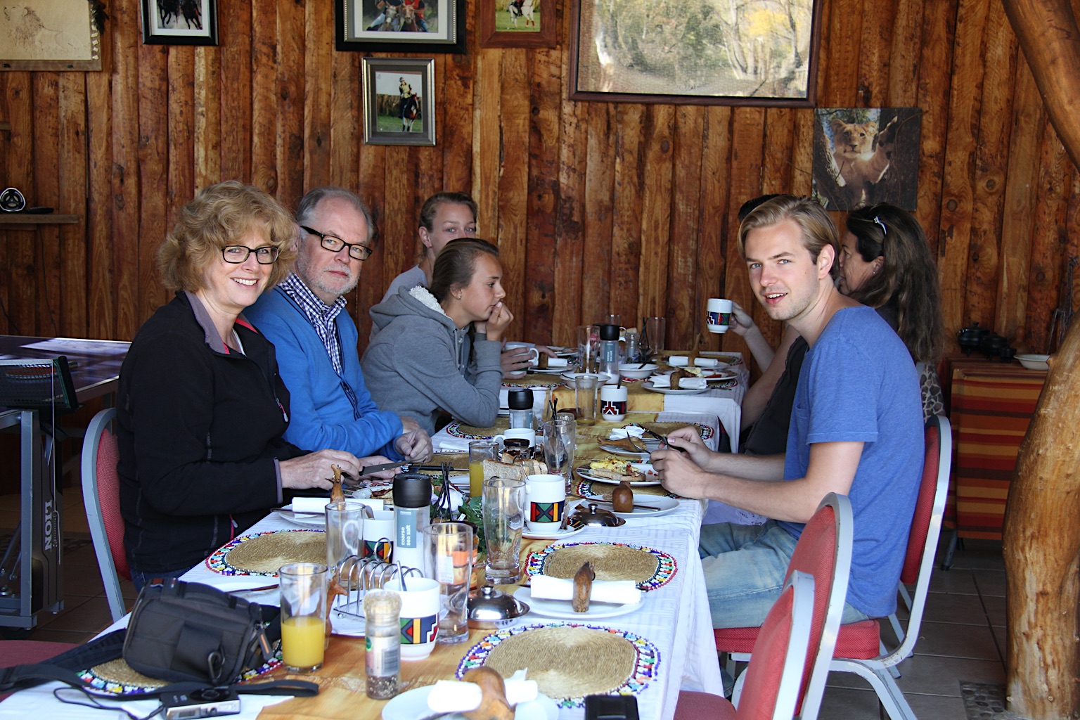Vanochtend natuurlijk weer vroeg wakker. De leeuwen laten zich weer, niet storend hoor, horen. We mogen nog eens de welpen voeren en genieten daarna van een heerlijk ontbijt in onze voortuin. Er is een flinke en koele wind gaan waaien vannacht. De zon is best krachtig maar de wind maakt het fris. We pakken langzaam maar zeker onze spullen en Rutger en Tineke oefenen voor het eerst een stukje met de auto op het terrein. Ook Colin en Theony komen nog even langs om gedag te zeggen.