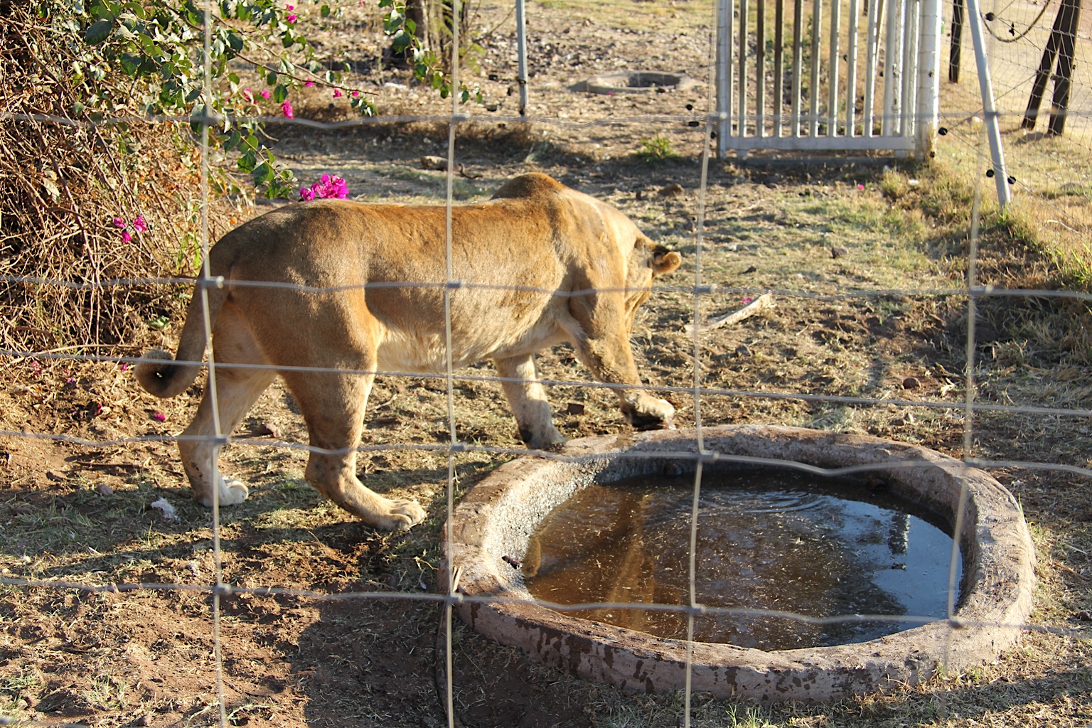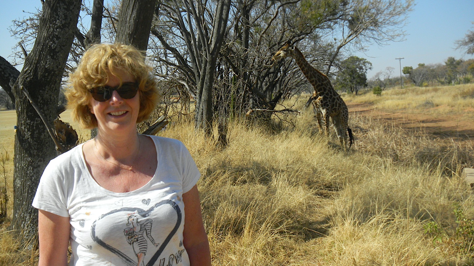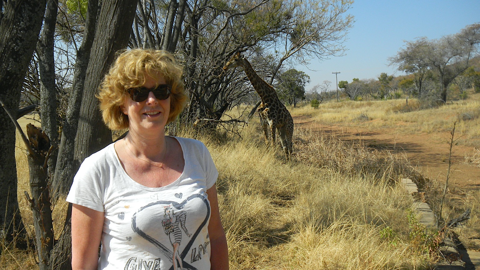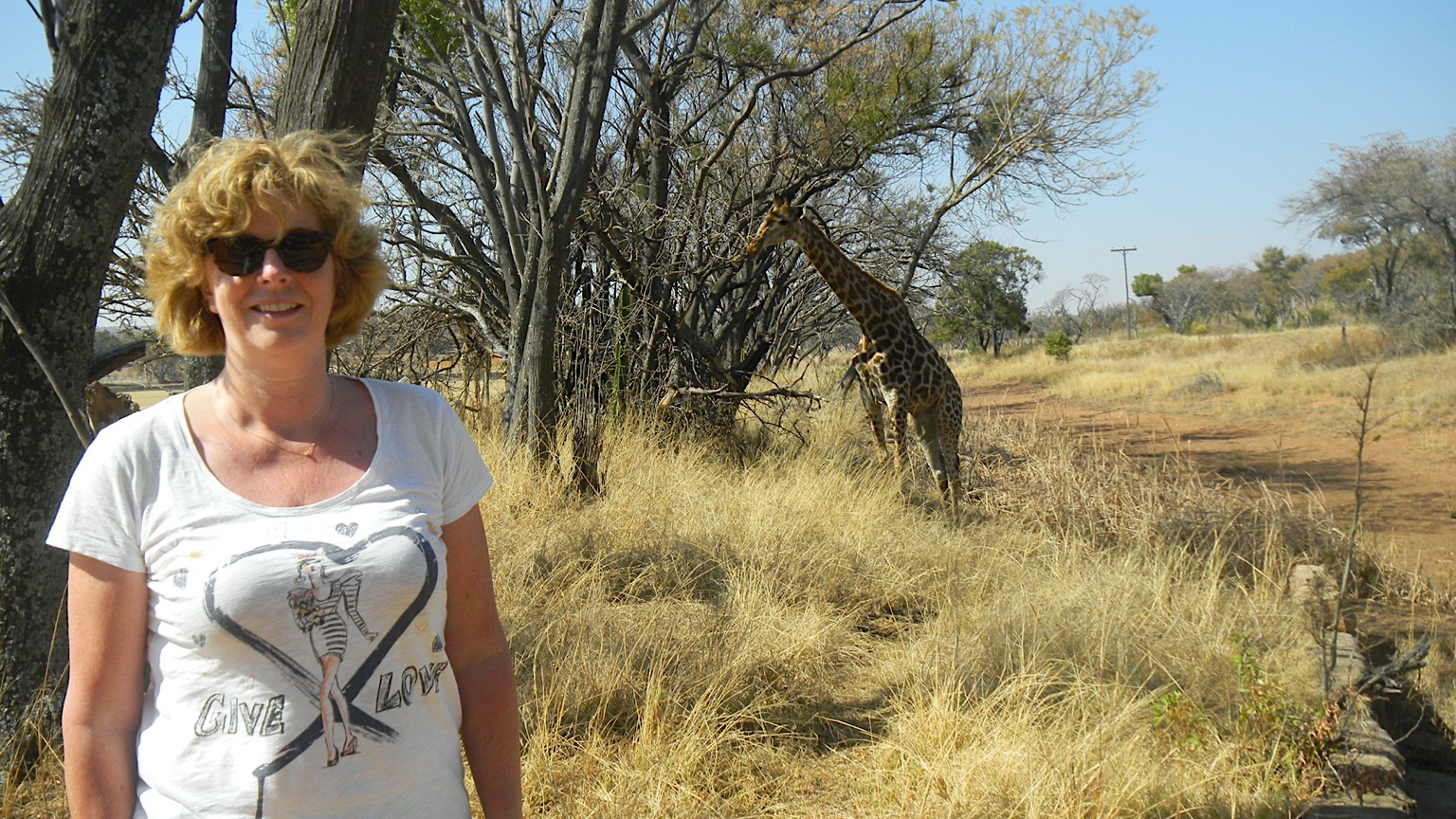 Vanochtend natuurlijk weer vroeg wakker. De leeuwen laten zich weer, niet storend hoor, horen. We mogen nog eens de welpen voeren en genieten daarna van een heerlijk ontbijt in onze voortuin. Er is een flinke en koele wind gaan waaien vannacht. De zon is best krachtig maar de wind maakt het fris. We pakken langzaam maar zeker onze spullen en Rutger en Tineke oefenen voor het eerst een stukje met de auto op het terrein. Ook Colin en Theony komen nog even langs om gedag te zeggen.
