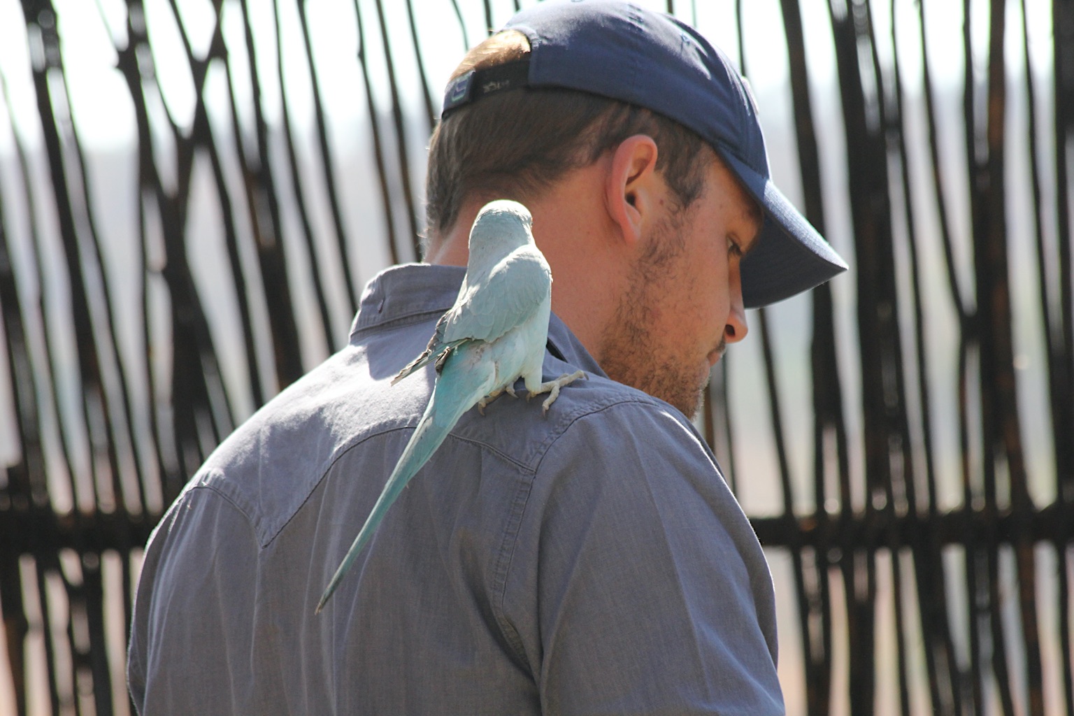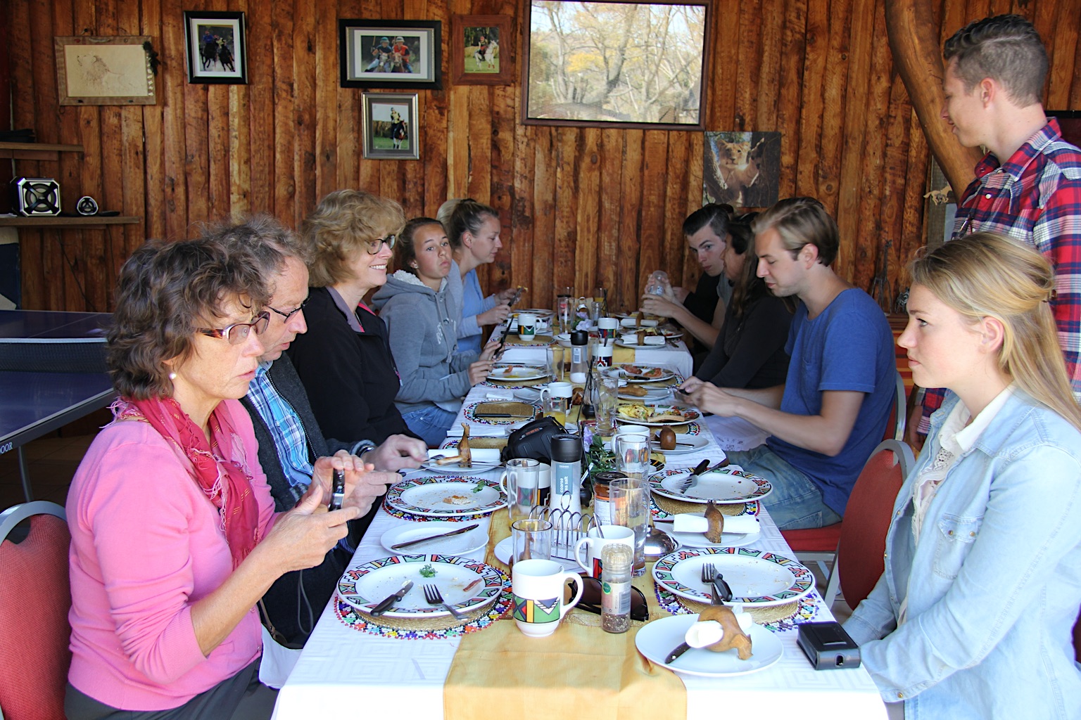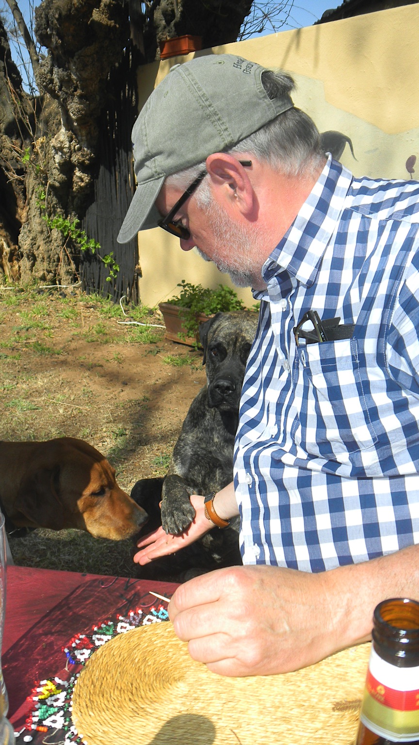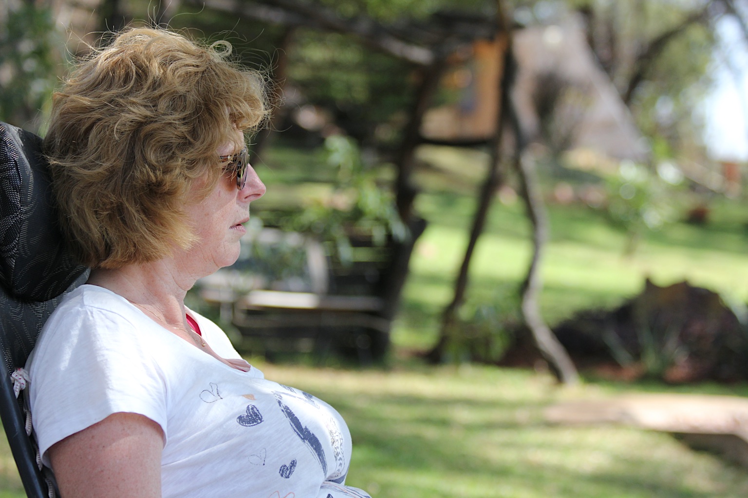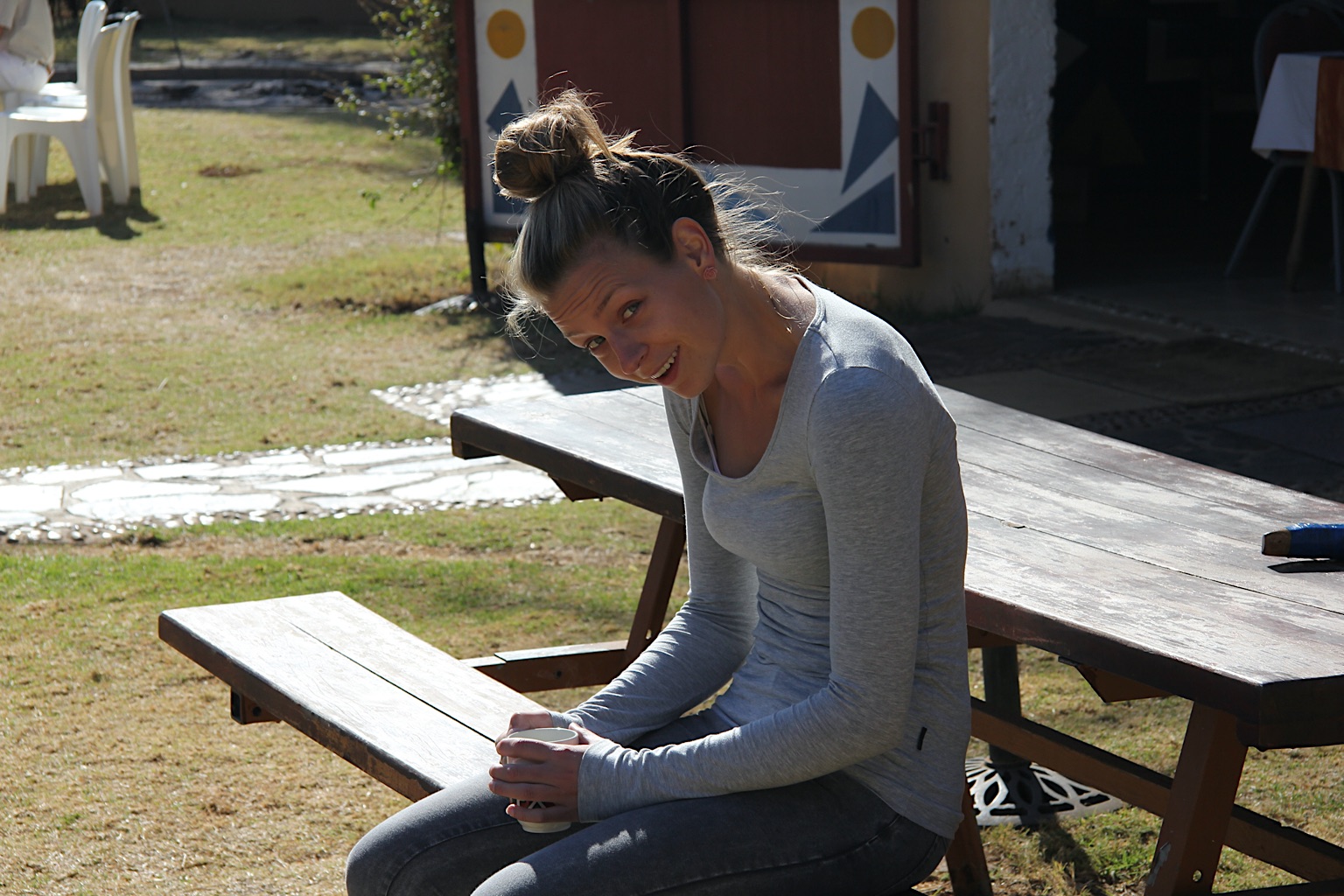 Vanochtend natuurlijk weer vroeg wakker. De leeuwen laten zich weer, niet storend hoor, horen. We mogen nog eens de welpen voeren en genieten daarna van een heerlijk ontbijt in onze voortuin. Er is een flinke en koele wind gaan waaien vannacht. De zon is best krachtig maar de wind maakt het fris. We pakken langzaam maar zeker onze spullen en Rutger en Tineke oefenen voor het eerst een stukje met de auto op het terrein. Ook Colin en Theony komen nog even langs om gedag te zeggen.